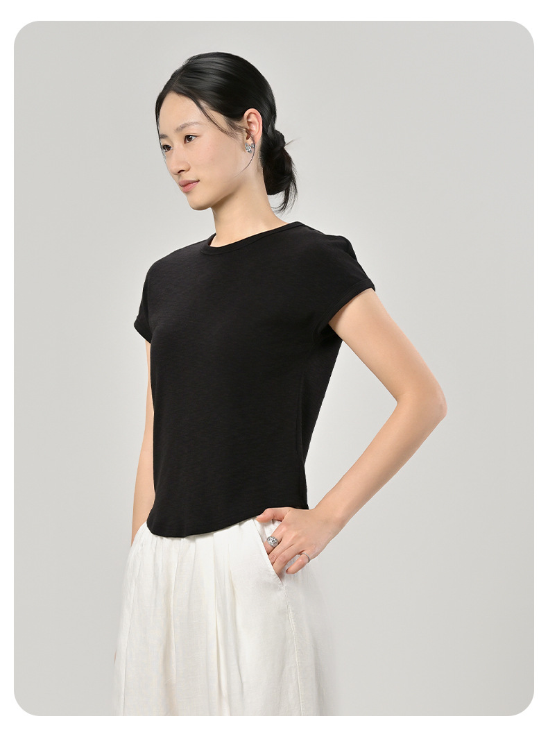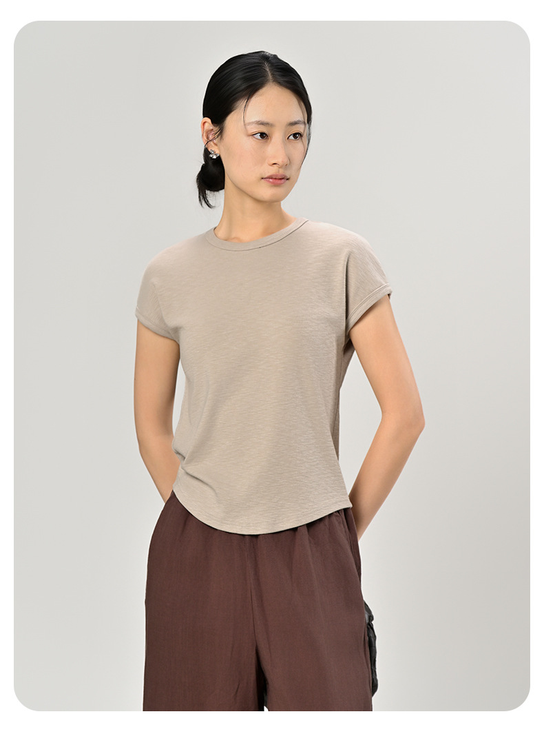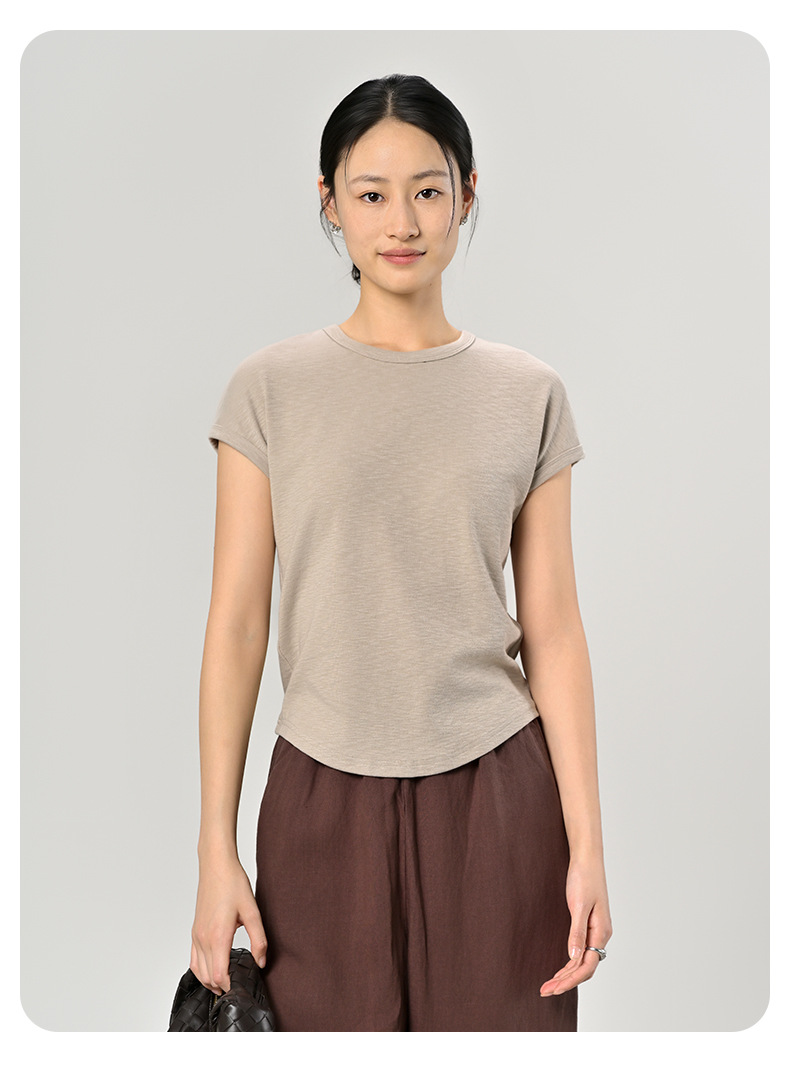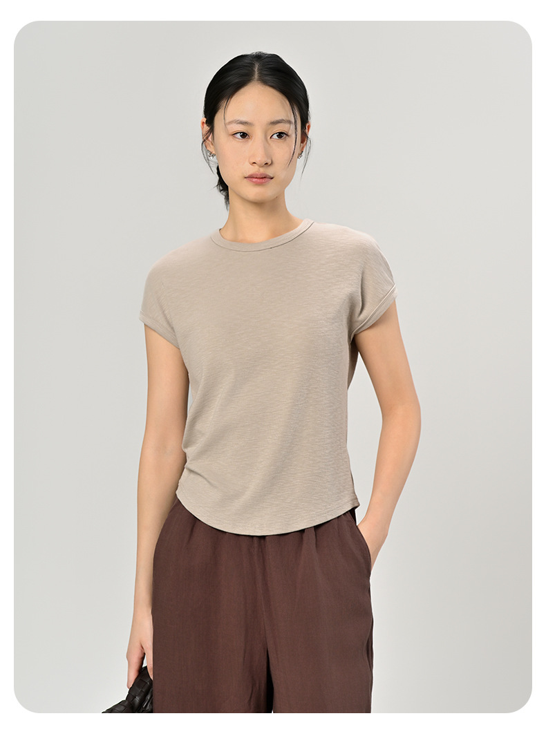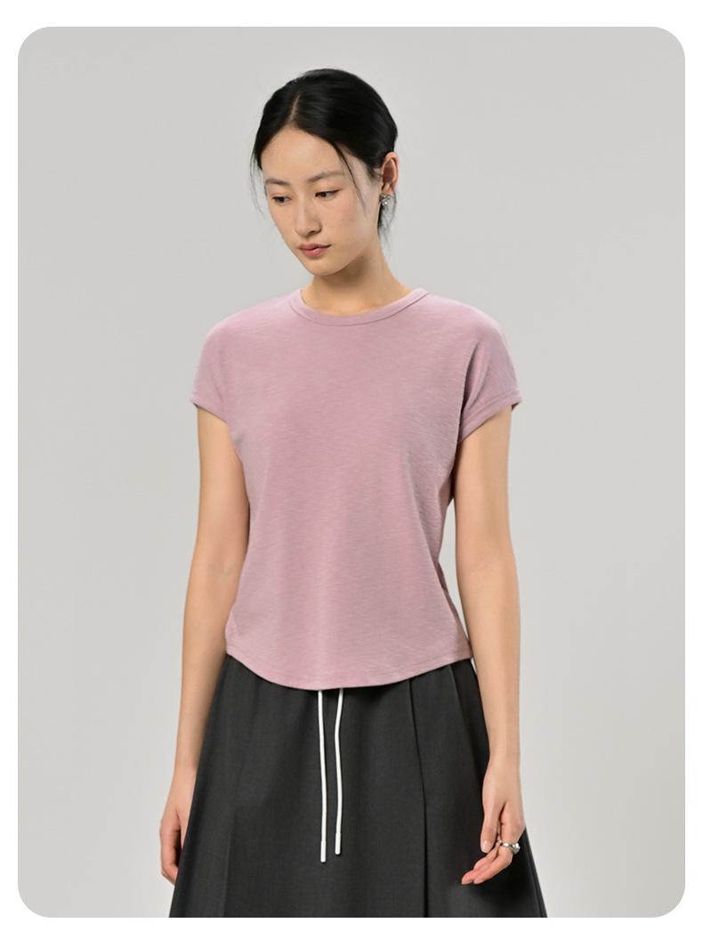 【连肩袖】弧形下摆圆领小飞袖纯色简约T恤女