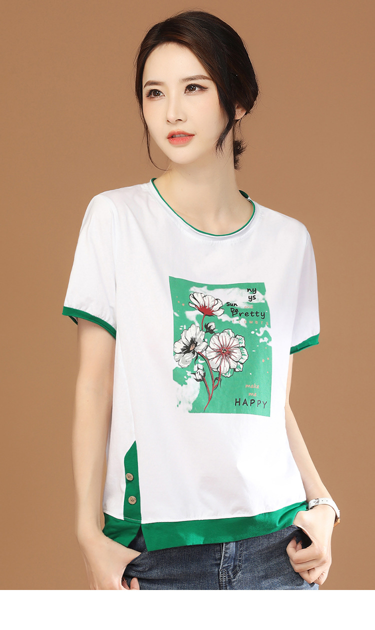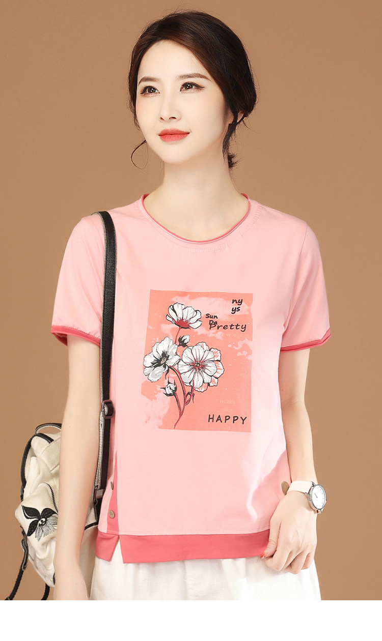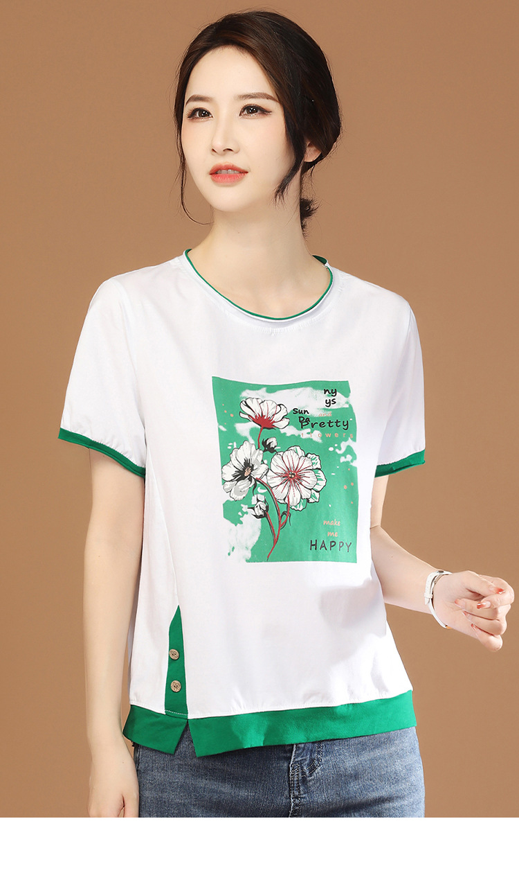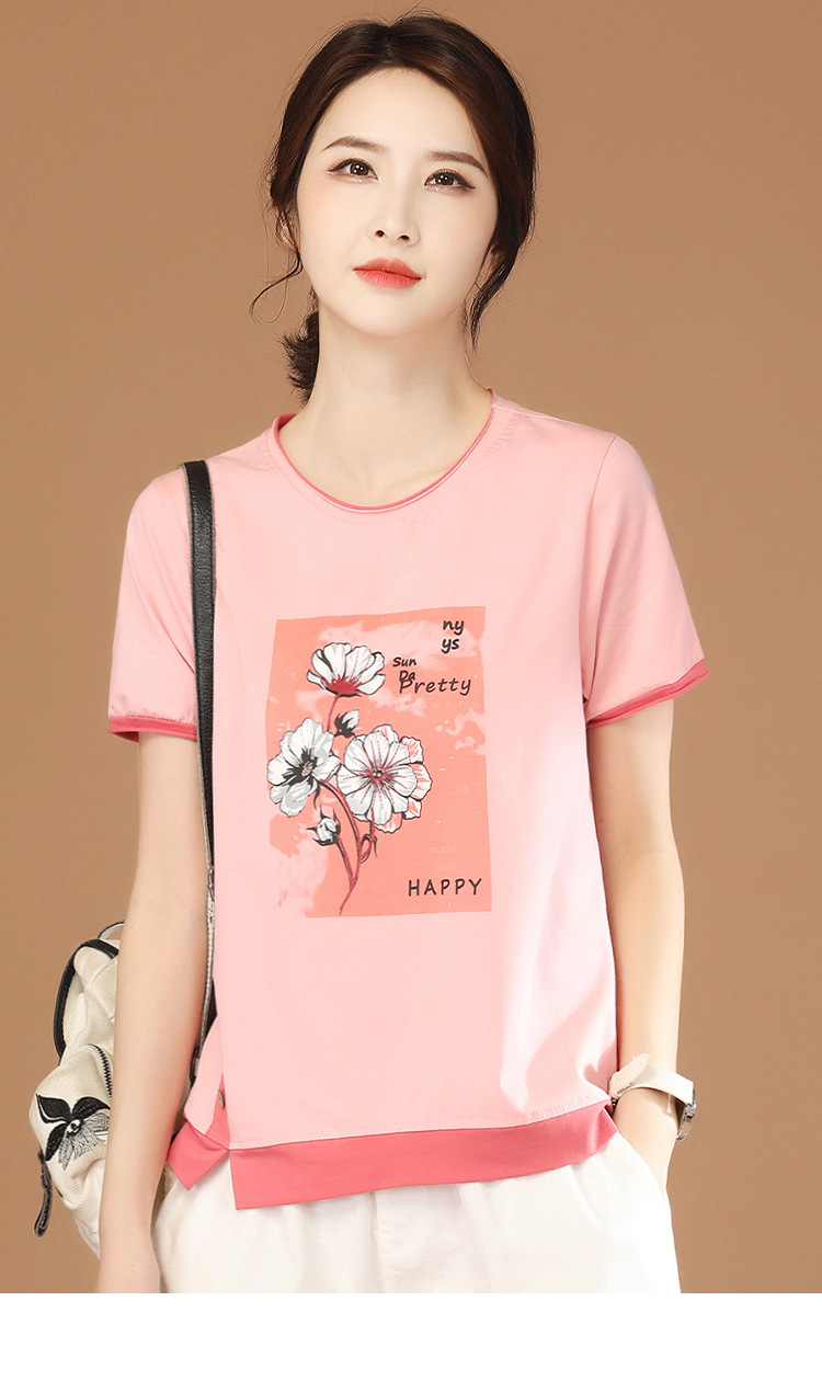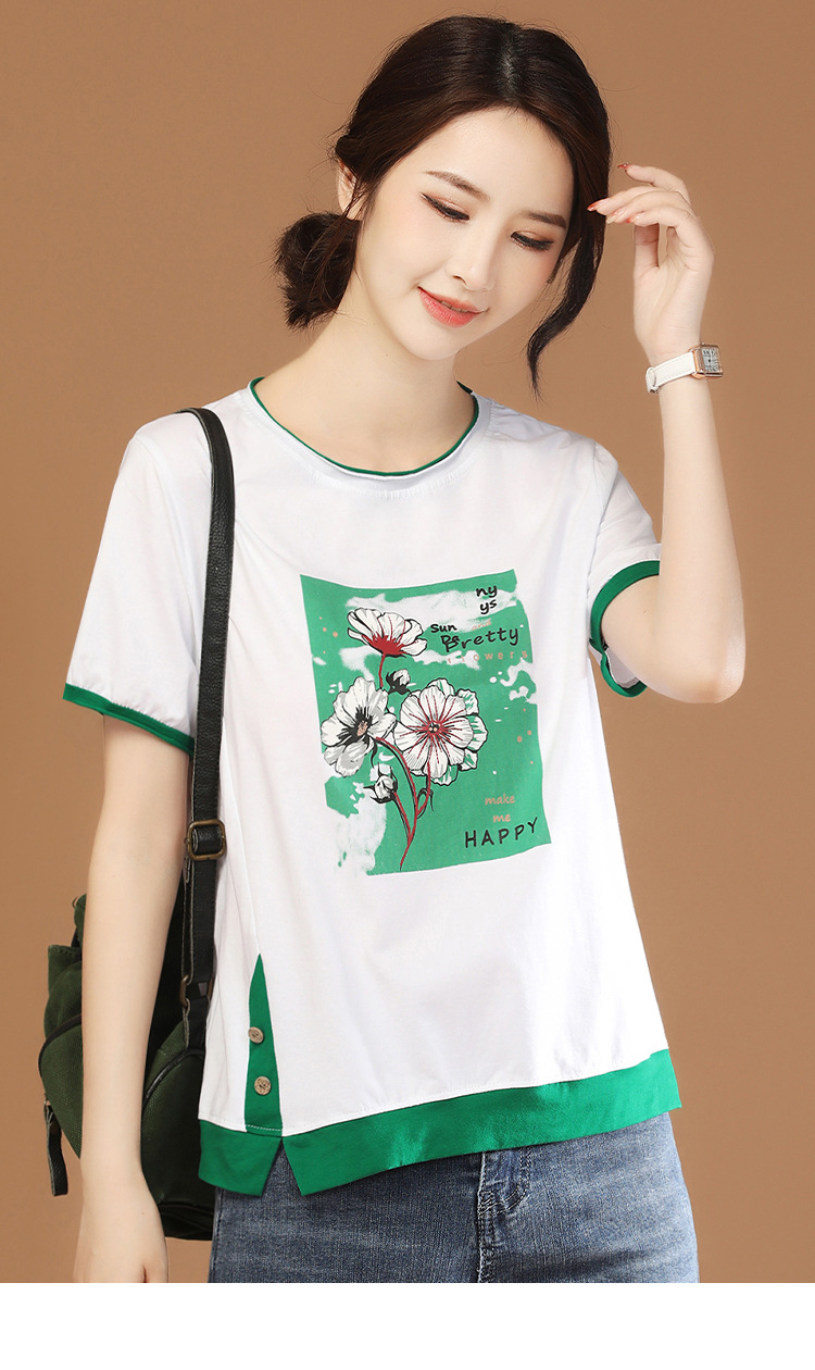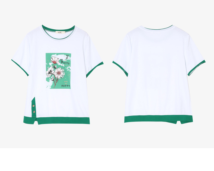 撞色圆领复古印花T恤女,夏装新款宽松显瘦百搭体恤薄GYM-KN0532