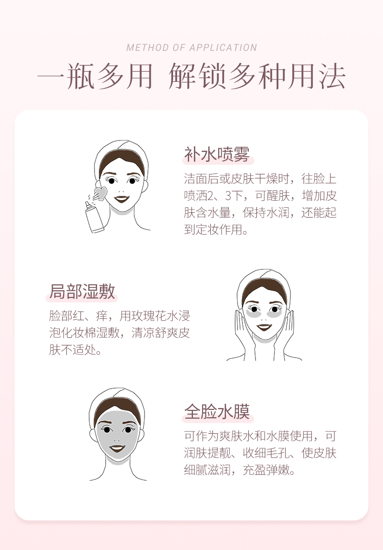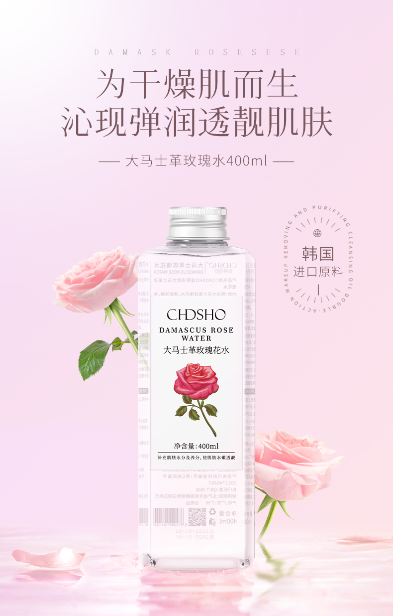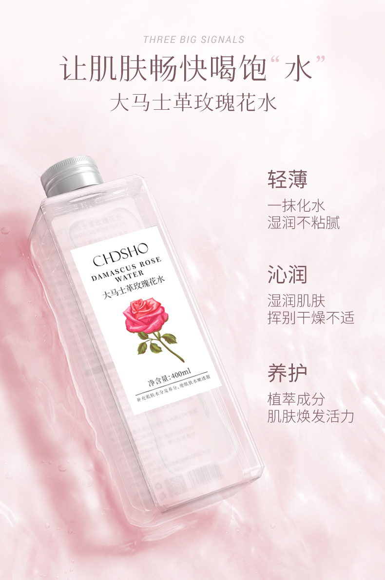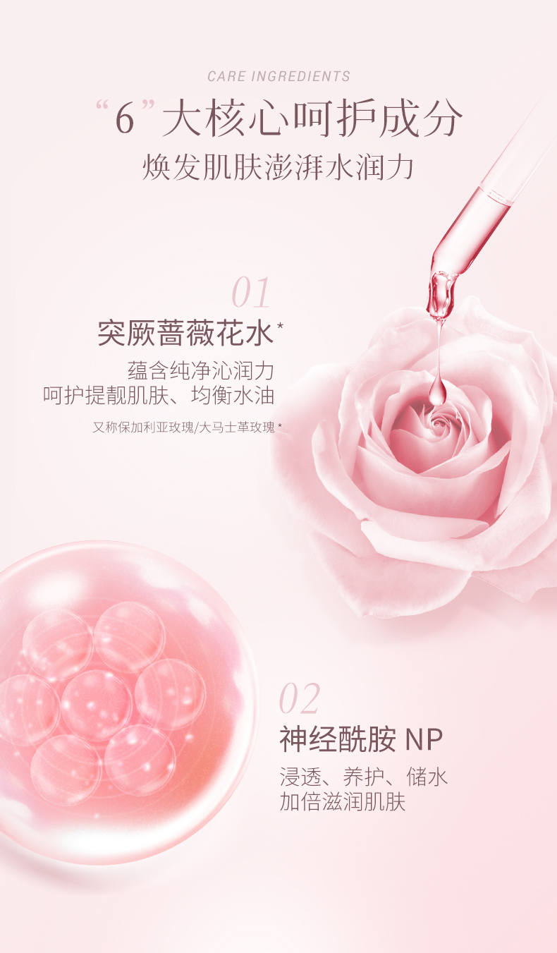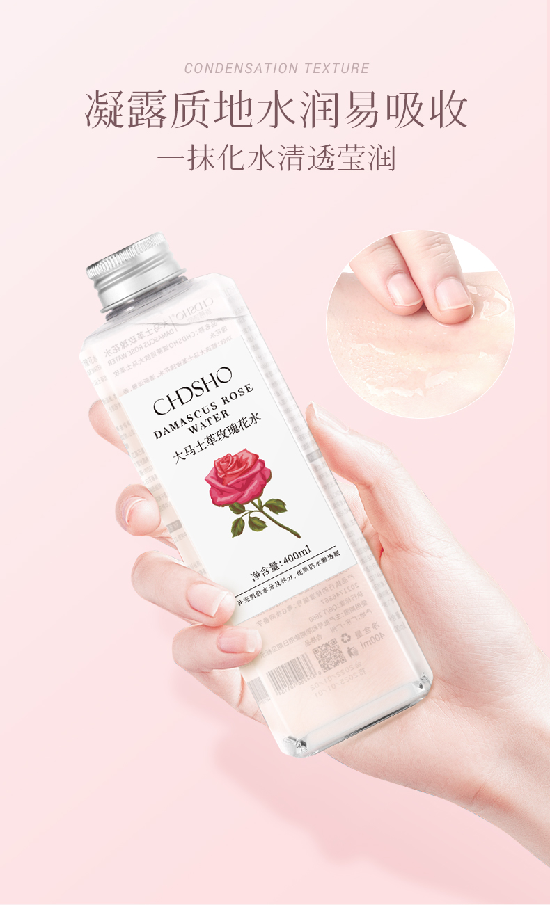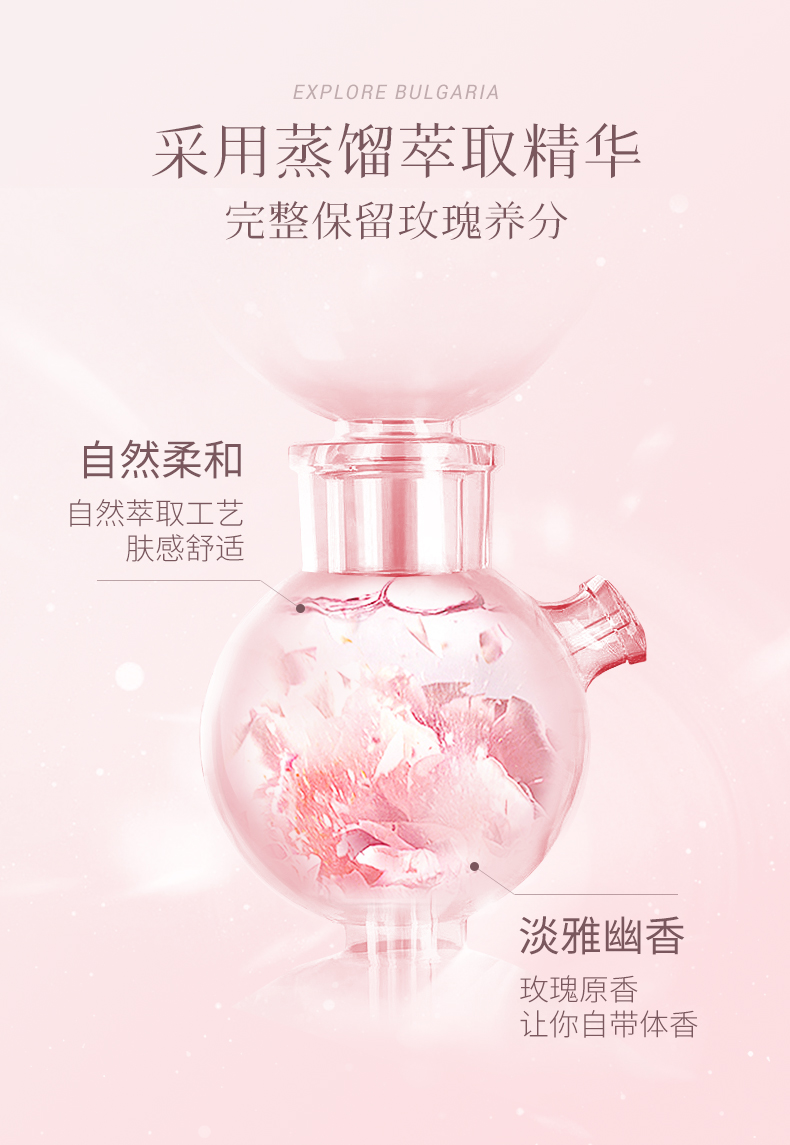 甄选大马士革玫瑰花水,清新淡雅,香味怡人,补充肌肤所需养分及水分,令肌肤弹润透靓。
