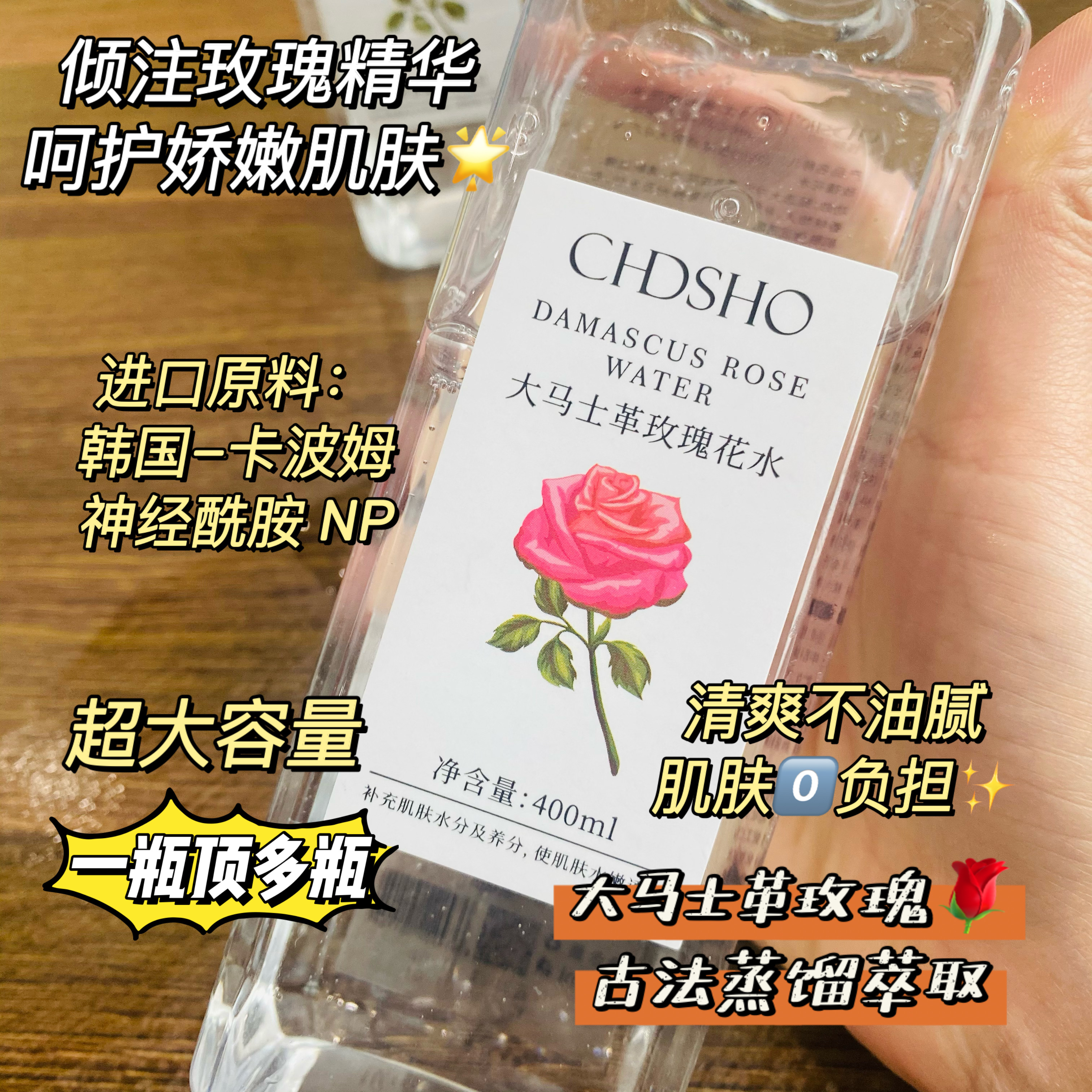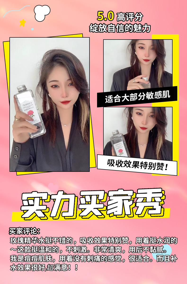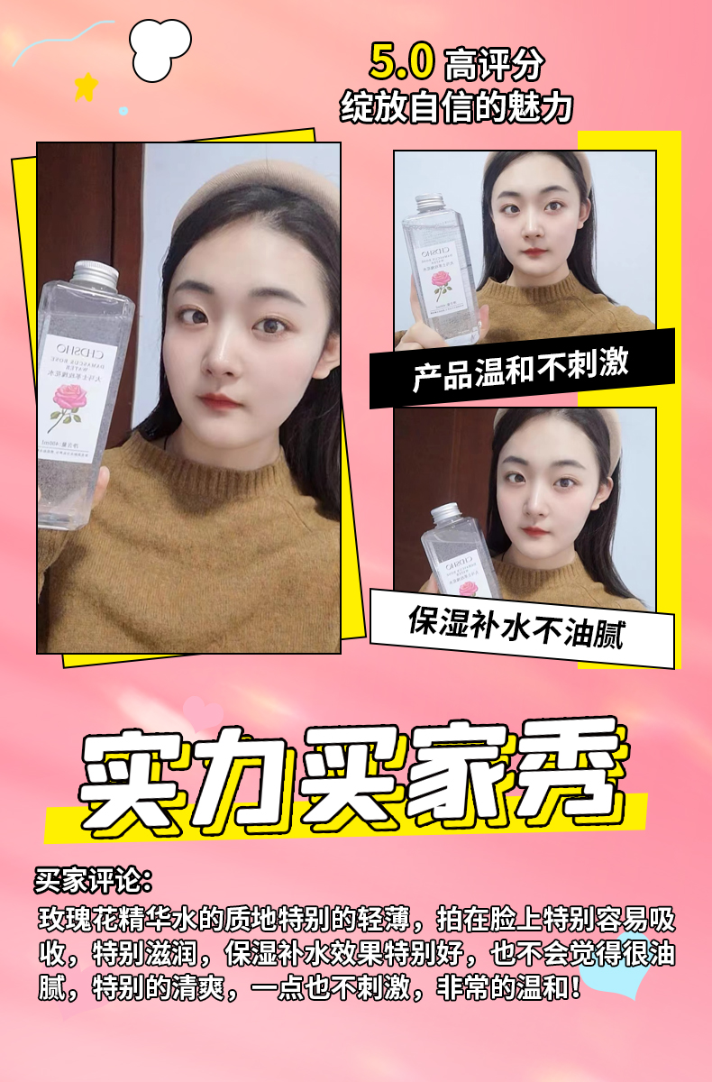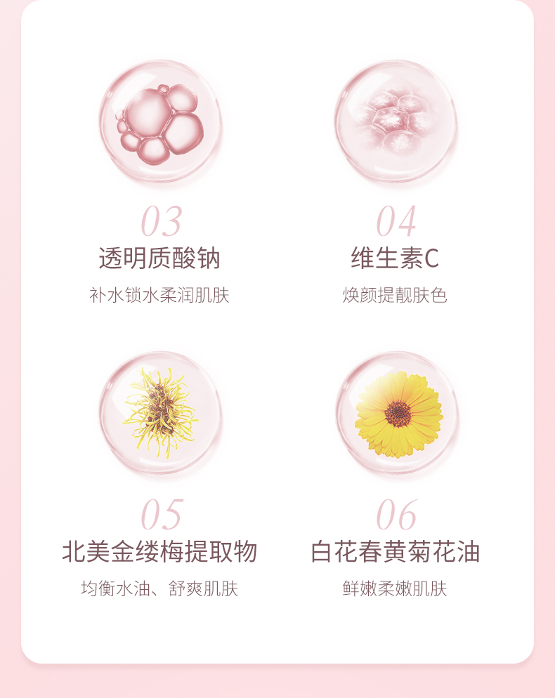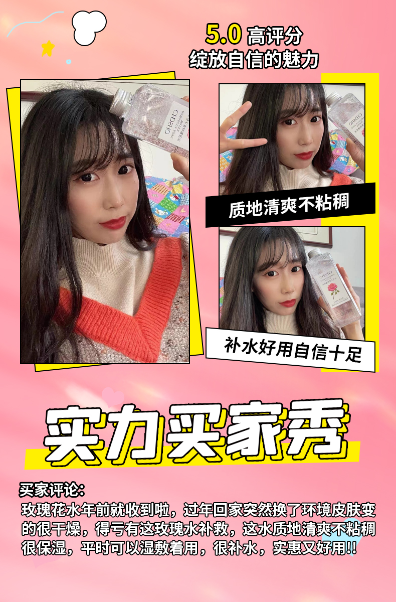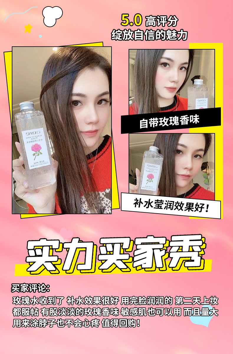 甄选大马士革玫瑰花水,清新淡雅,香味怡人,补充肌肤所需养分及水分,令肌肤弹润透靓。
