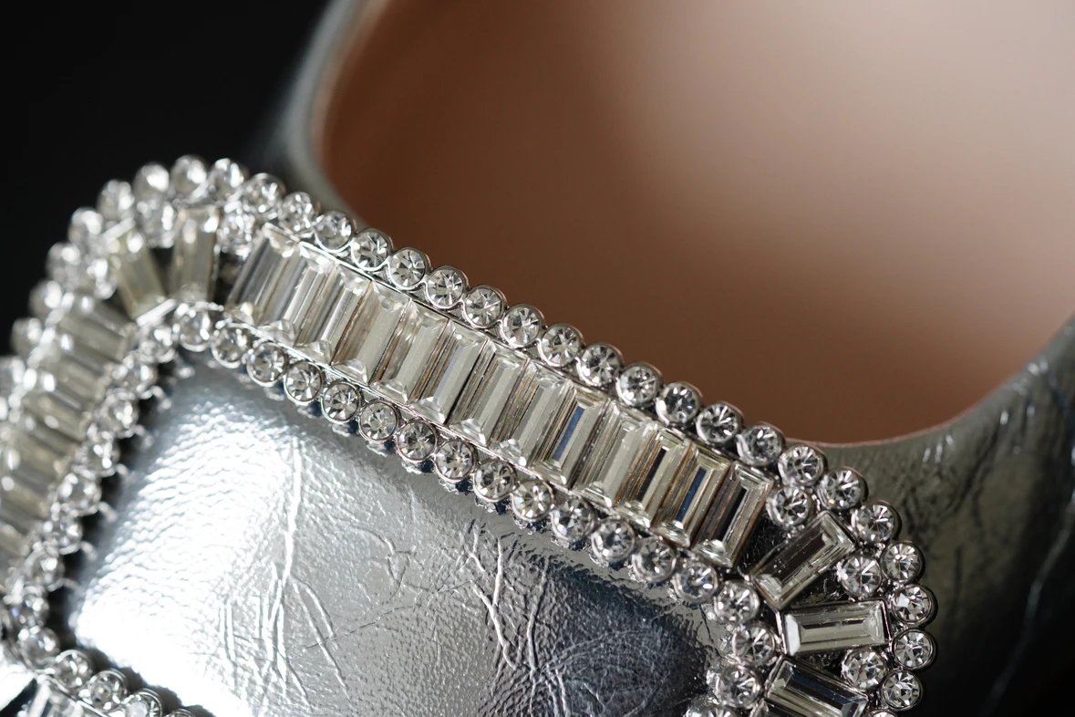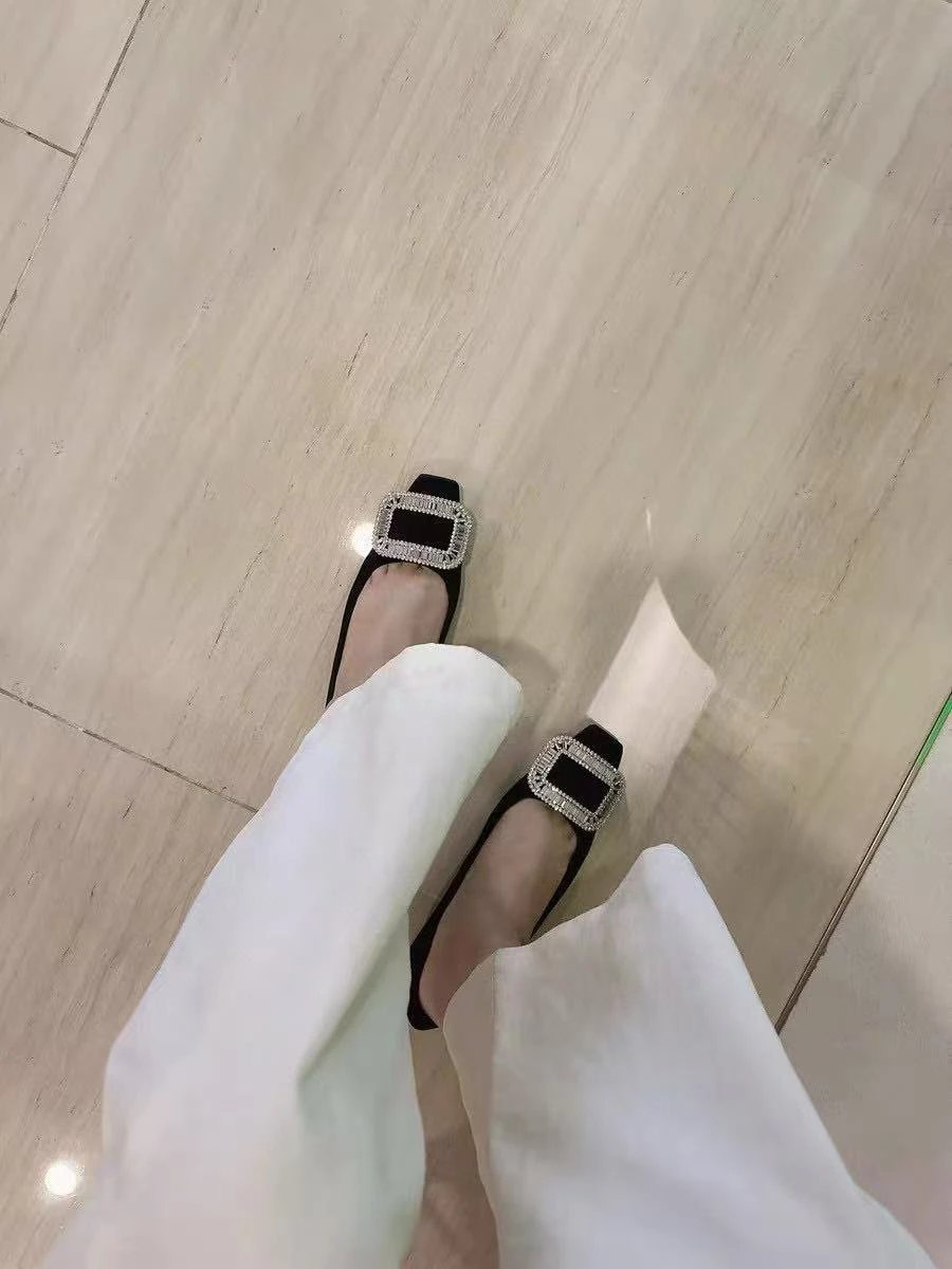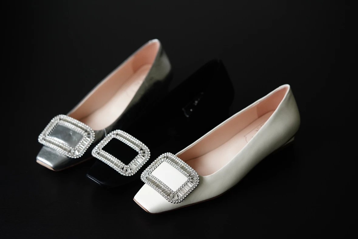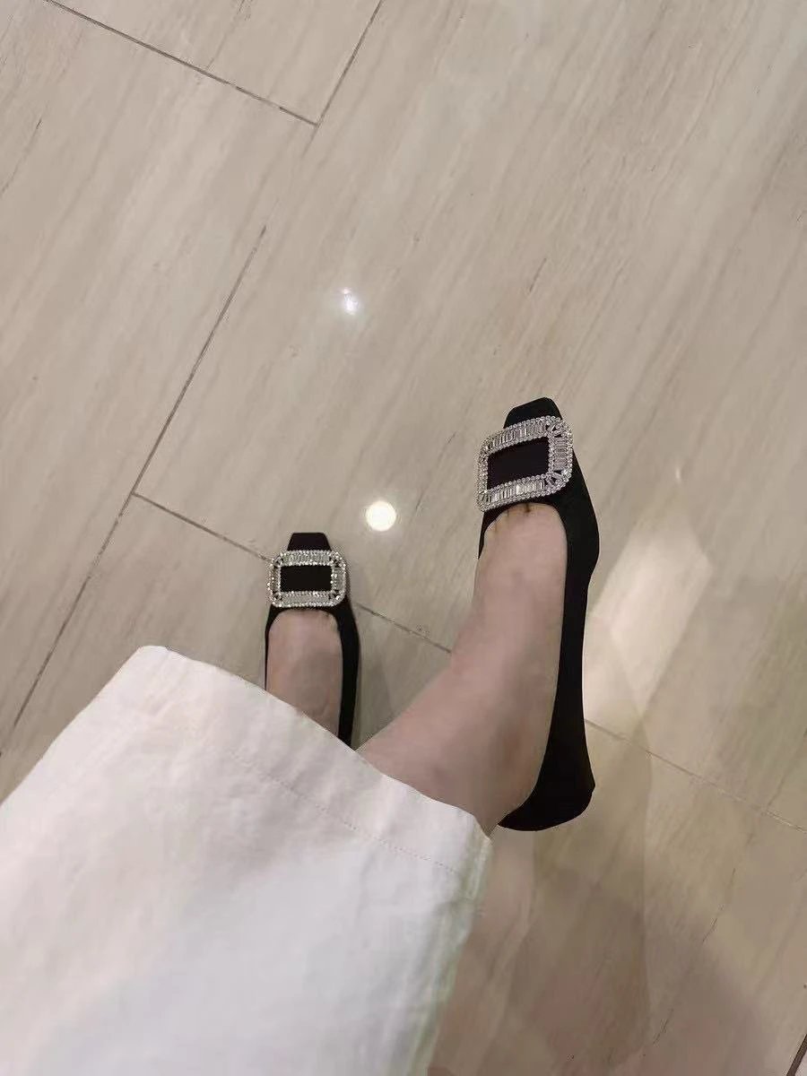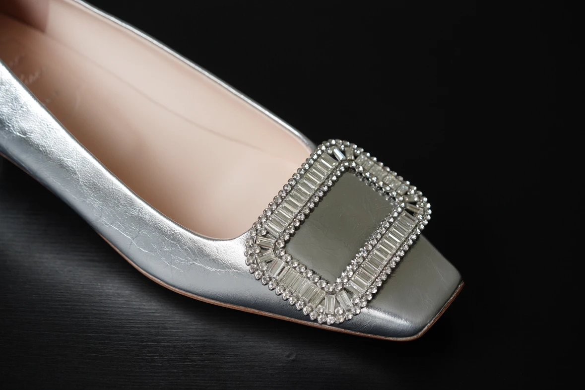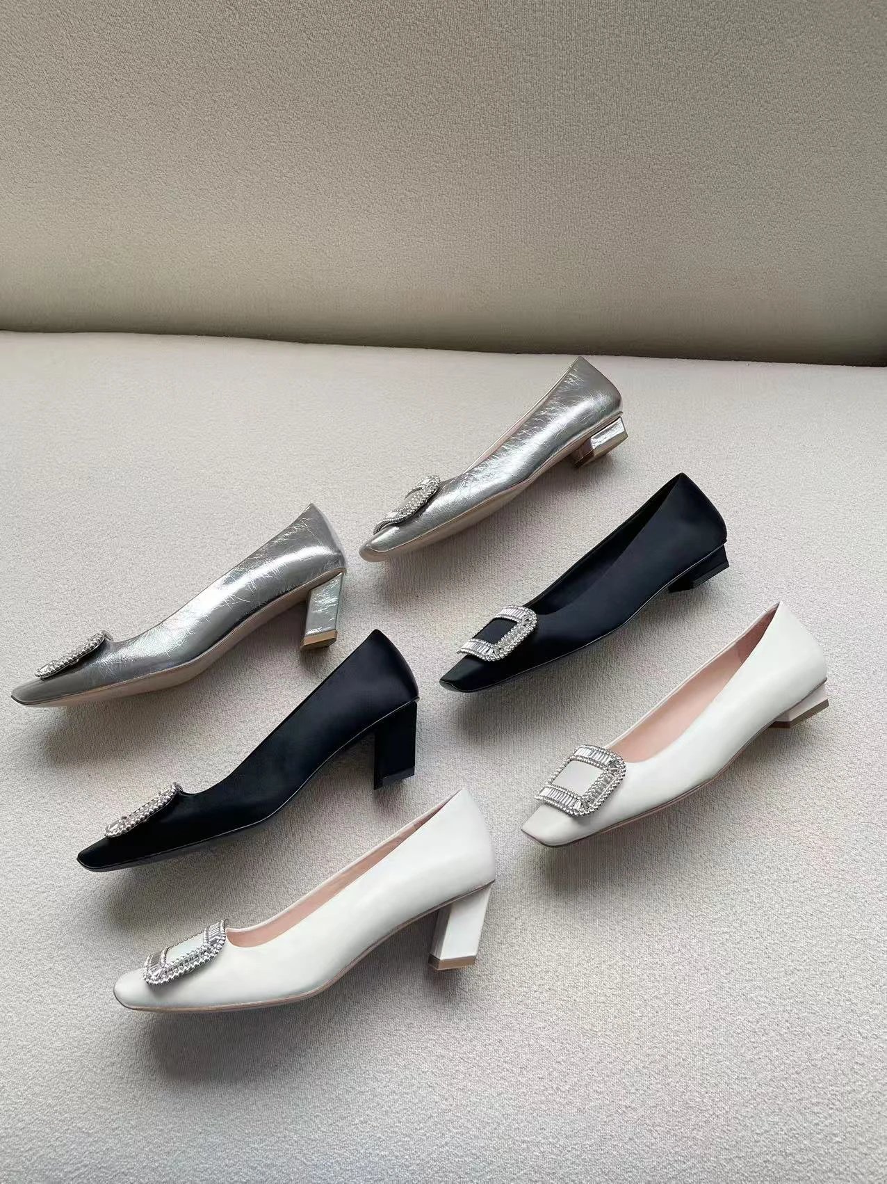 重磅推荐 水钻方扣单鞋 银色褶皱牛皮/白色限定牛皮 经典缎面2.5cm/4.5cm通勤单鞋 优雅老钱风