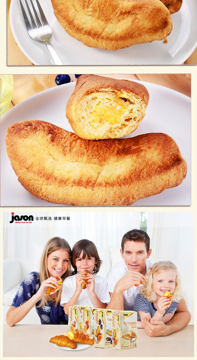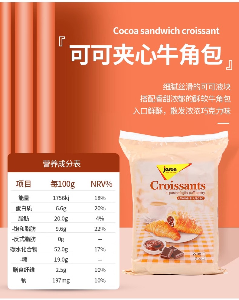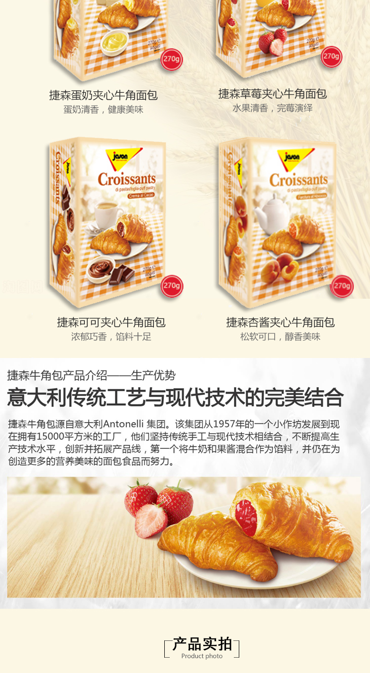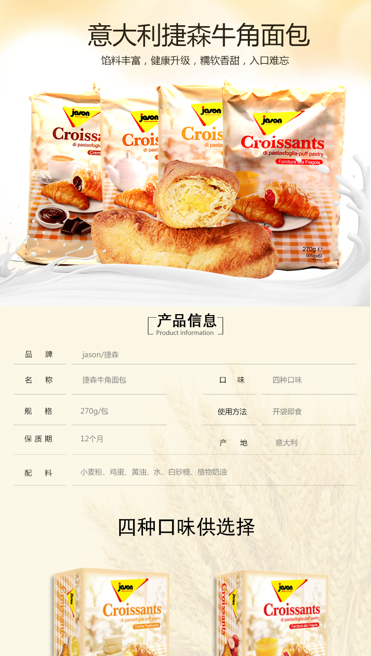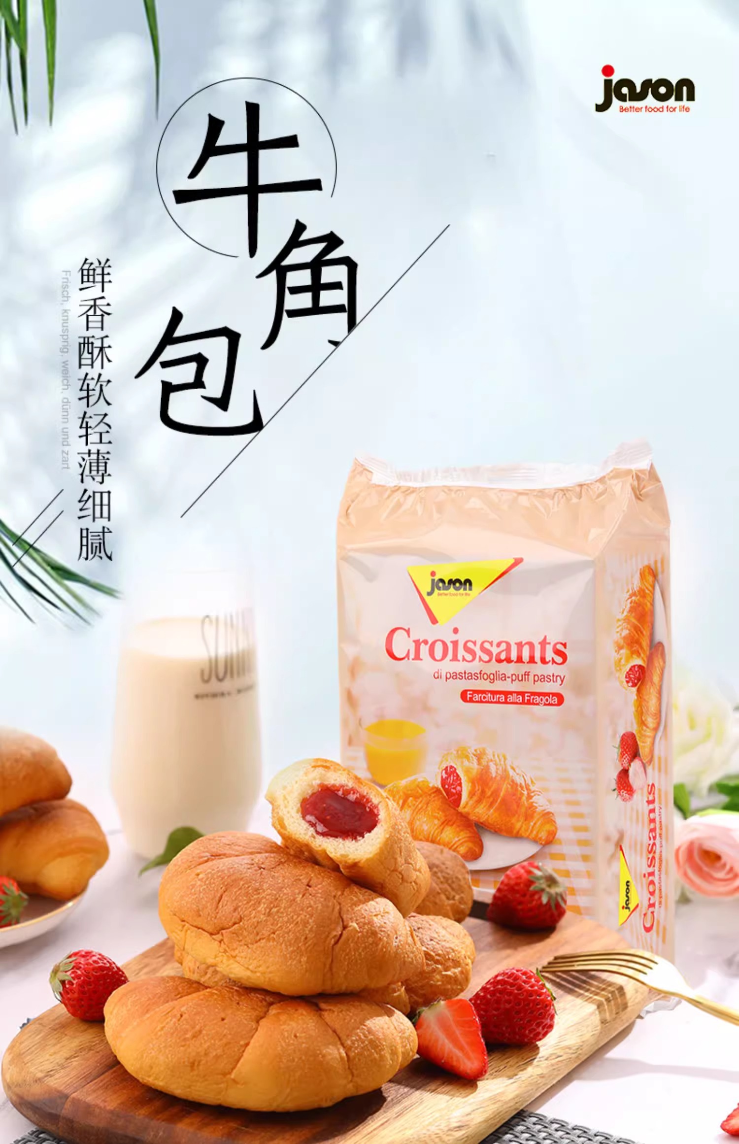 【早餐面包推荐】意大利进口捷森夹心草莓/蛋奶/可可/杏酱夹心牛角面包270g/袋【中欧班列精选】