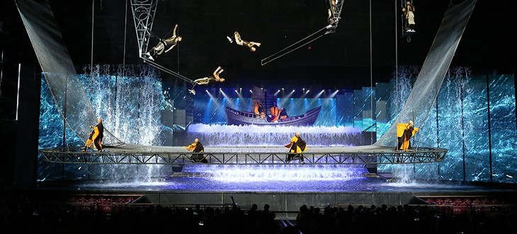 ♡ 《三亚千古情》,演出360度全景剧幕,400平方米的悬空透膜从天而降,可伸手与头上的比基尼美女互动。