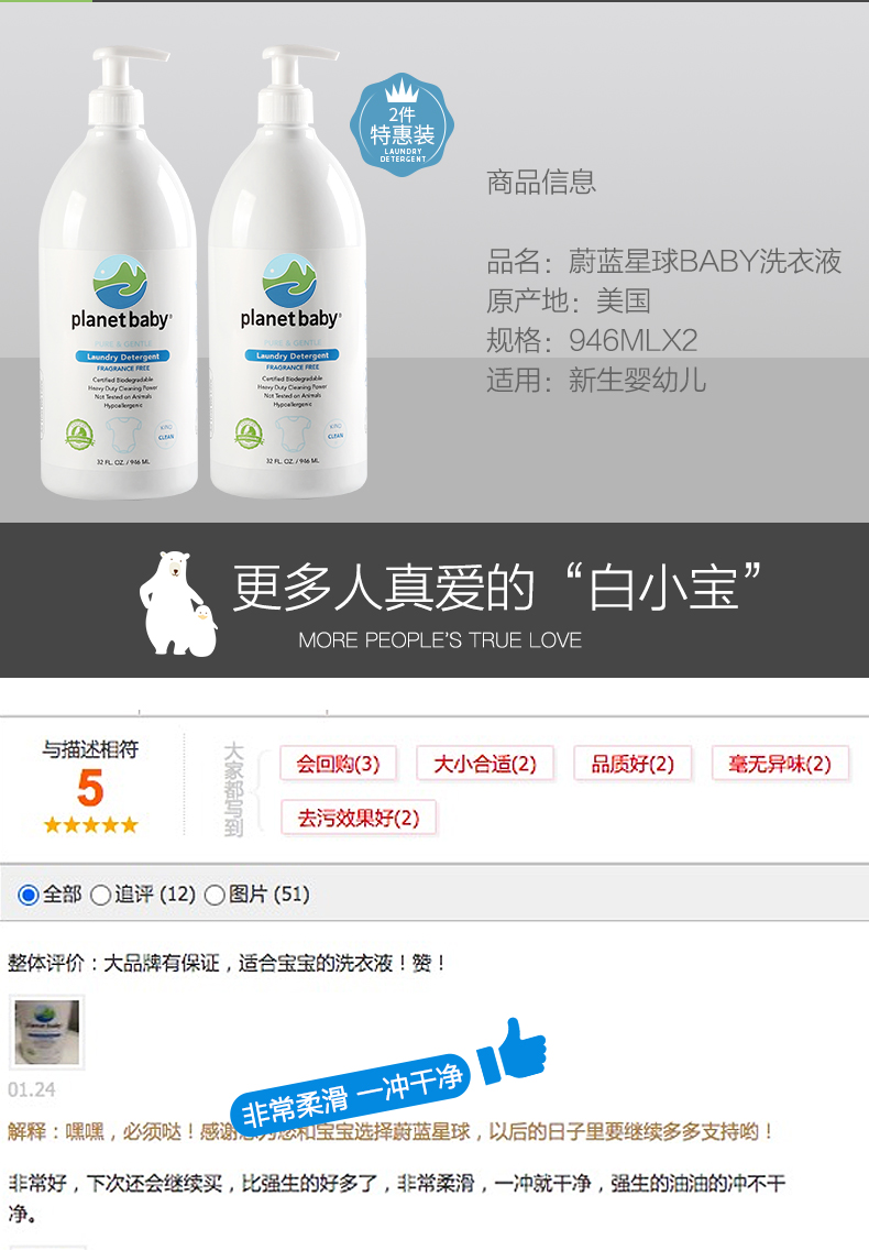美国蔚蓝星球新生婴儿洗衣液宝宝专用低敏手洗专用2瓶特惠装