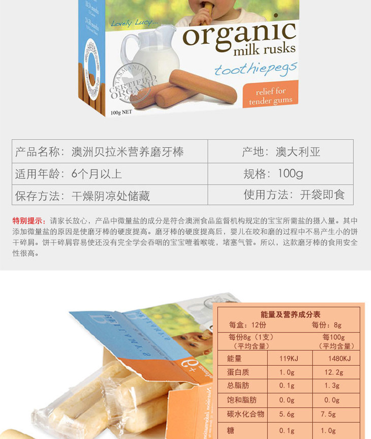 【保税仓】Bellamy's澳大利亚贝拉米磨牙棒饼干6+ 100g/盒 (6个月以上) 商品图0