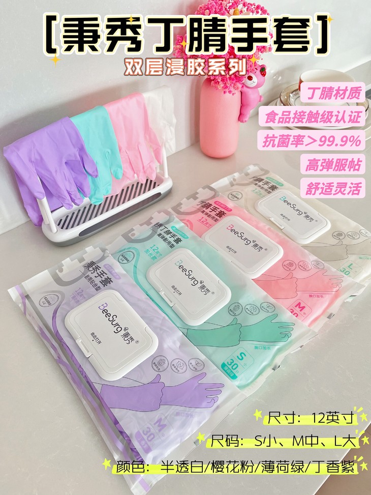 所以要给大家推荐的这一款高弹耐用秉秀丁腈手套🧤 版型好、贴合手型、不紧束、不滑脱 戴上它做家务、洗衣、洗碗、洗宠物 清洁打扫,再也不怕伤到手的 每包都是30只装,防尘翻盖抽取式设计 密封包装 翻盖抽取 防尘防水更卫生 一揭 一撕 一抽 手套就轻松拿出来了