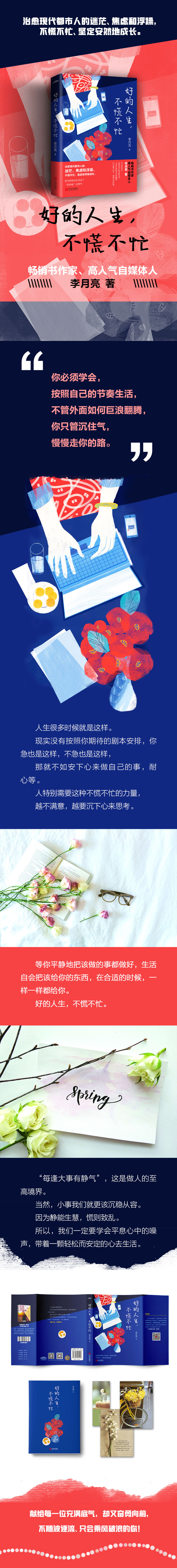 人生很多时候就是这样。现实没有按照你期待的剧本安排,你急也是这样,不急也是这样。那就不如安下心来做自己的事,耐心等。等你平静地把该做的事都做好,生活自会把该给你的东西,在合适的时候,一样一样都给你。好的人生,不慌不忙。本书是一部温暖平和的励志作品,充满了积极向上的力量。以正确的世界观、人生观、价值观为导向,论点清晰而明确。通过职场、生活、交友、爱情、亲情、婚姻等方面阐述了作者独到的见解,帮助读者在浮躁的当下社会,能专注自己,找到适合自己的节奏,活出自己独特的人生。这本书对那些对目前生活状态感到迷茫、过度努力、假装努力等人群有很好的引导作用。