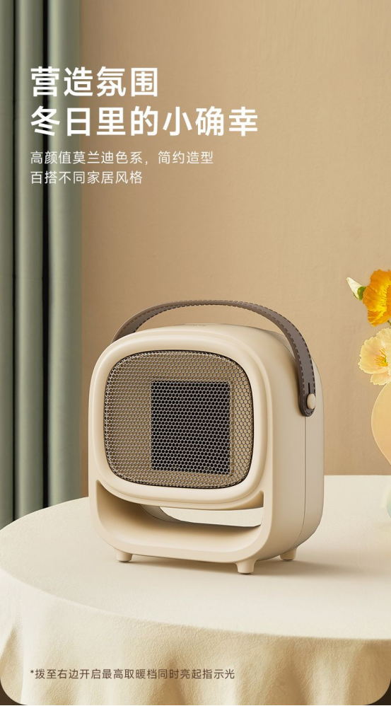 加宽出风口设计,送去舒适暖风构建专属温暖小角 高颜值百搭不同场景,营造家居温馨氛围 机身阻燃材质,阻燃隔热又防烫,守护使用安全 轻音运行,取暖不打扰