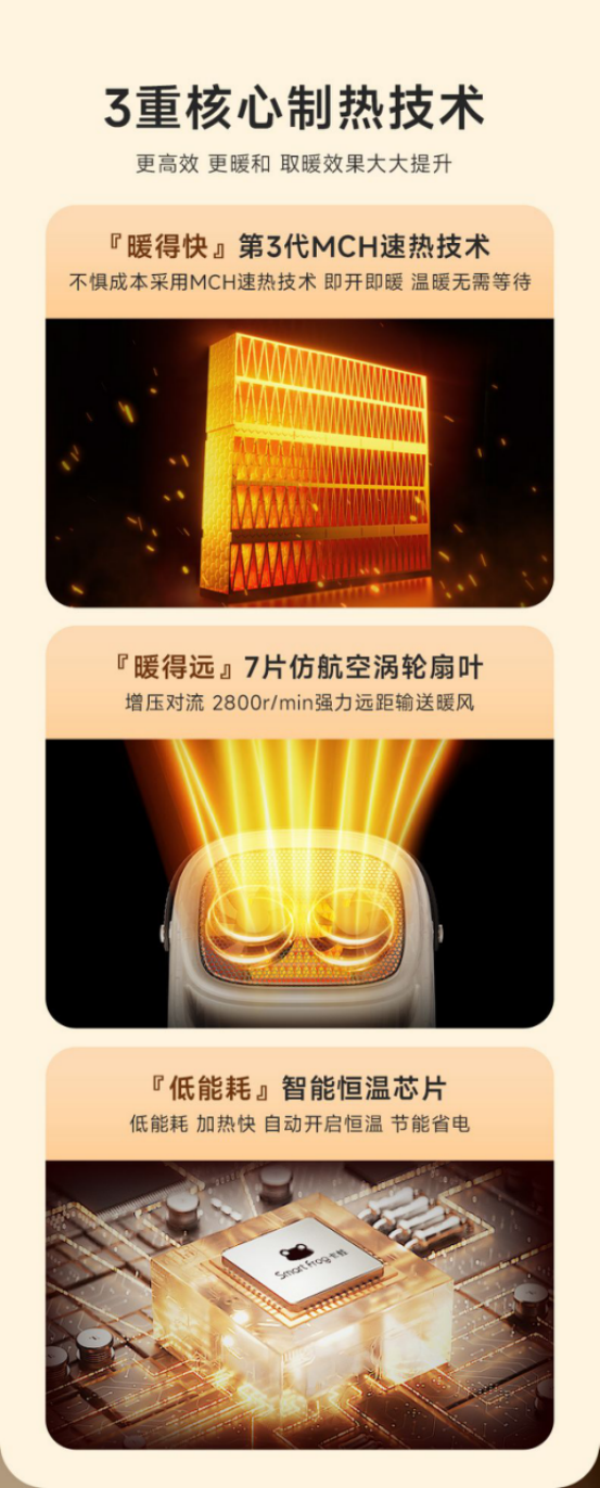 还有低能耗智能恒温芯片,高精温度传感搭配AI智控算法, 减少热能流失,实现低能耗状态维持加热
