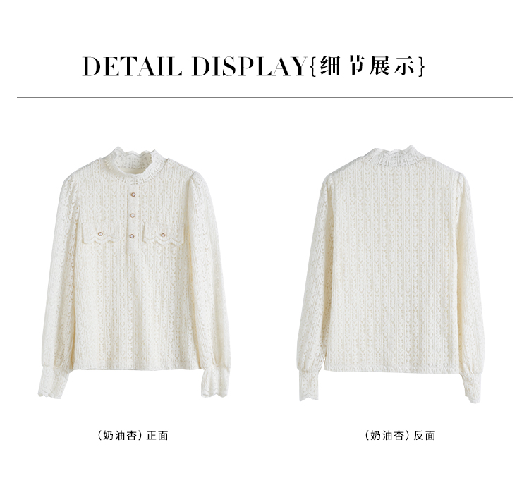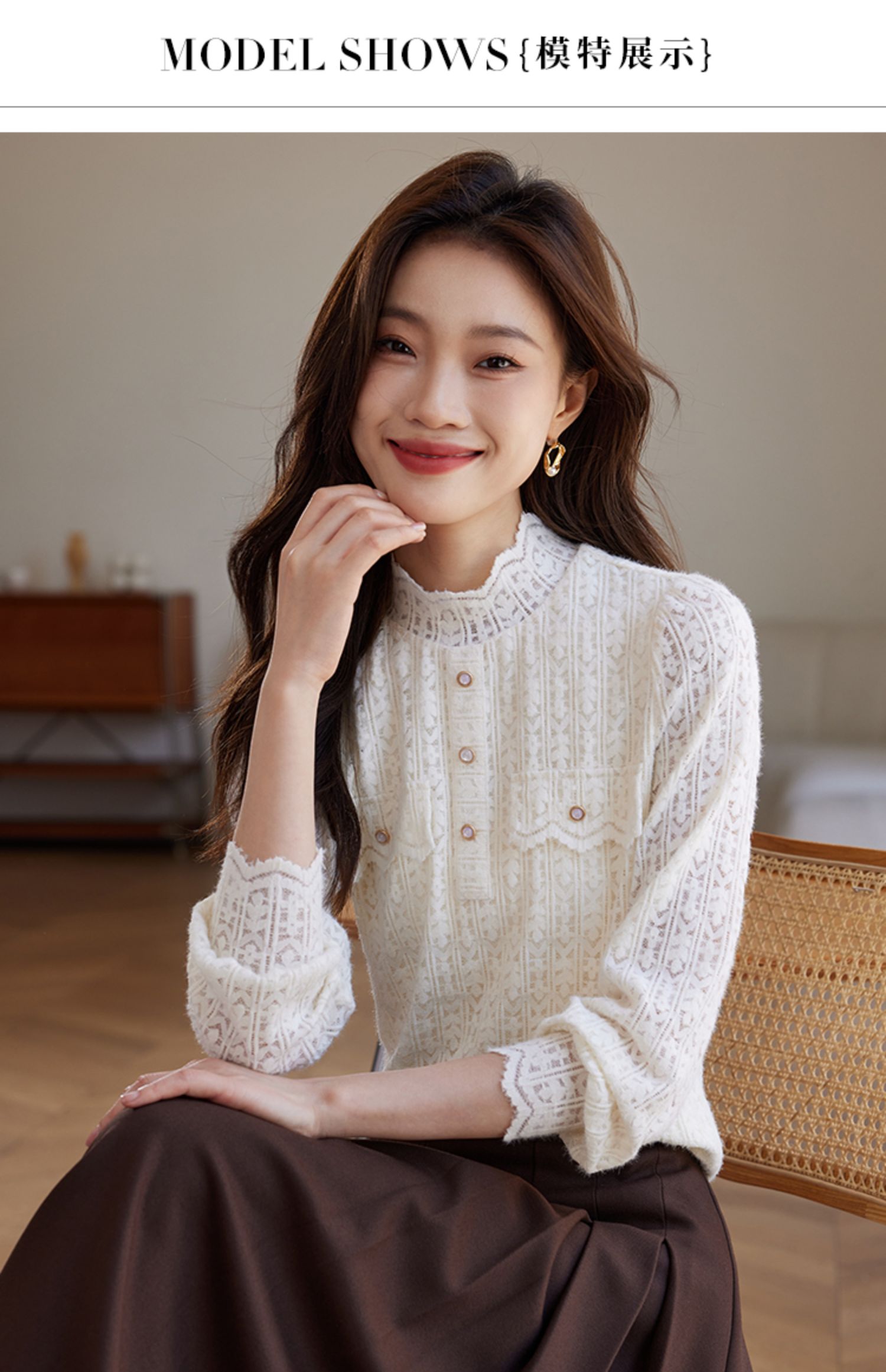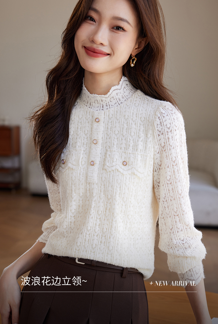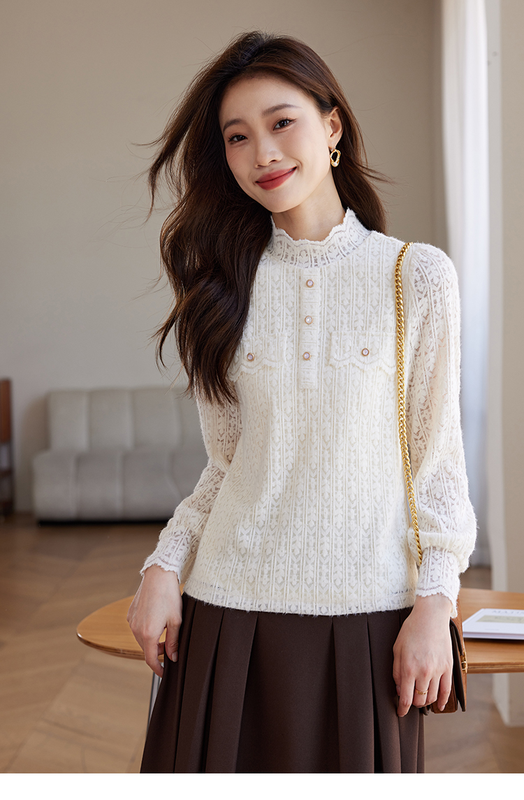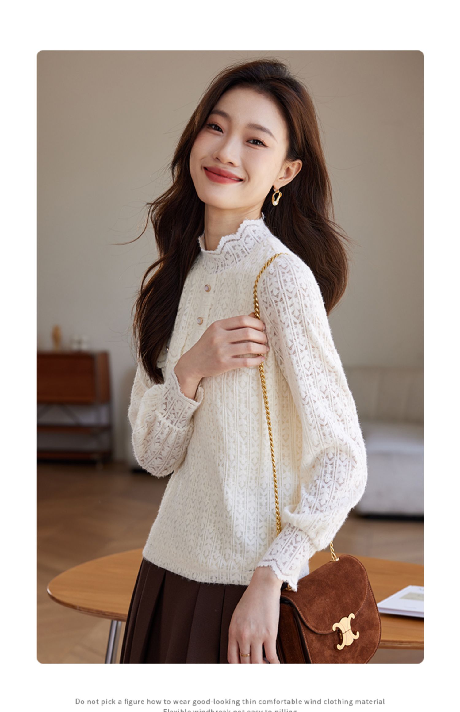 【年终特卖】熙世界杏色花边立领蕾丝衫女2025冬新款内搭磨毛抓绒小衫洋气上衣