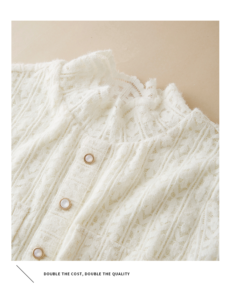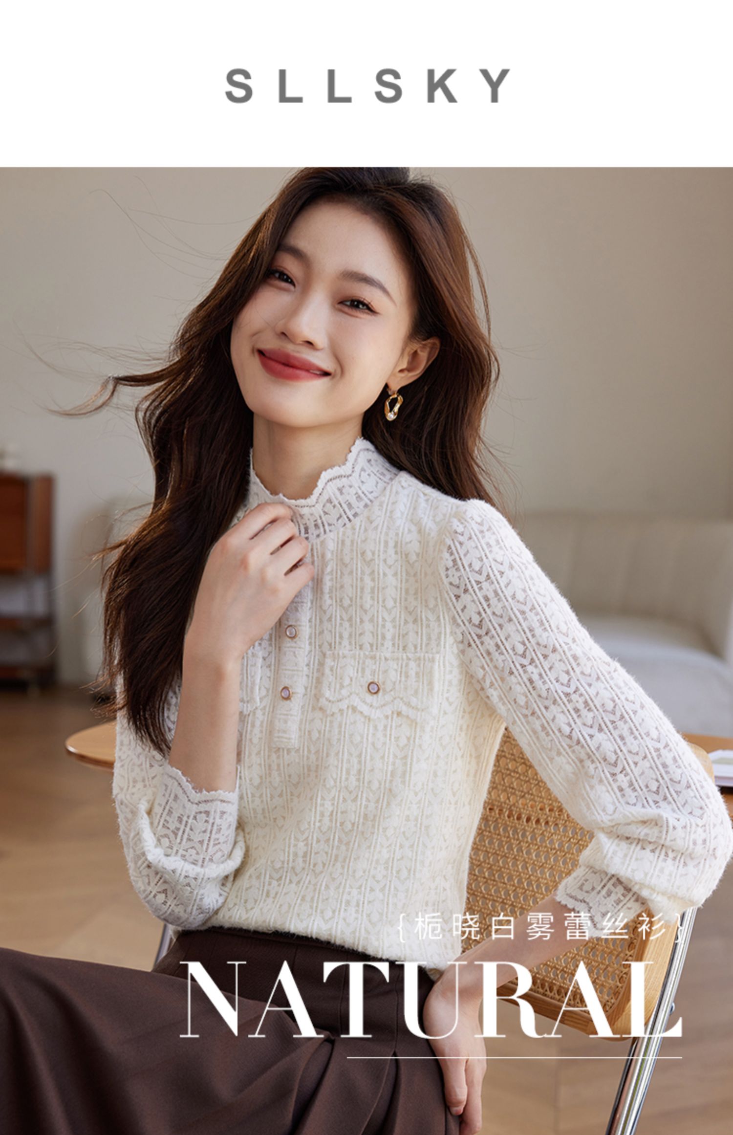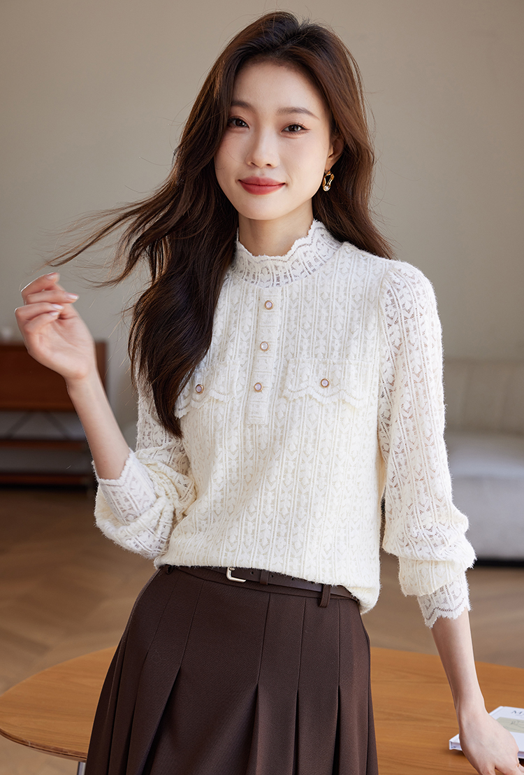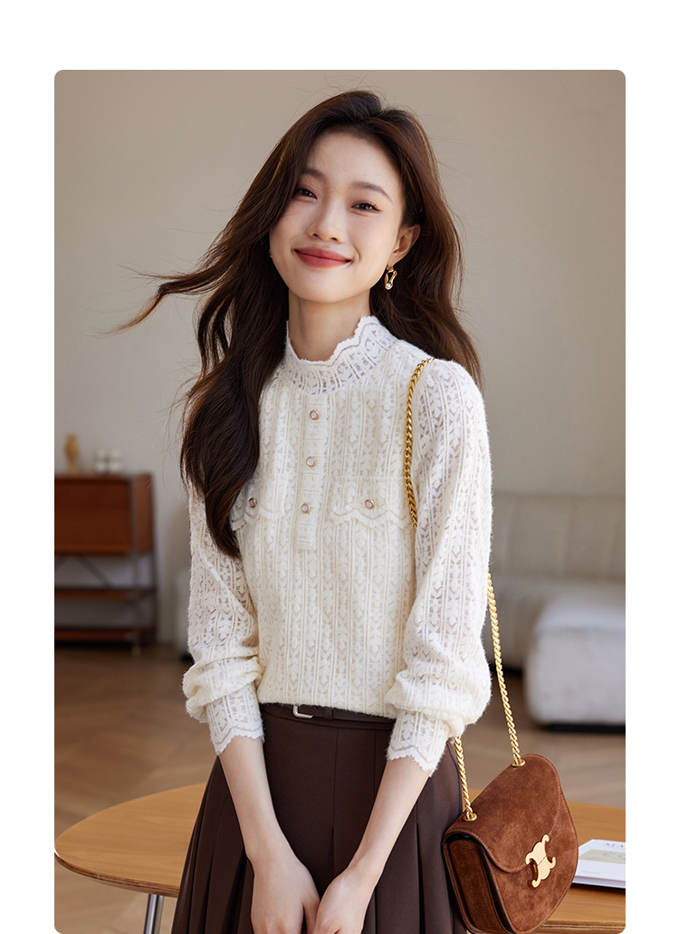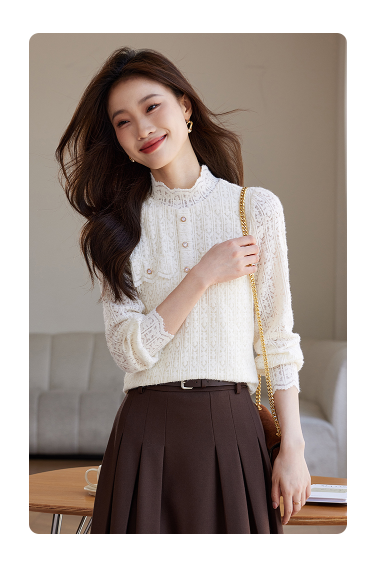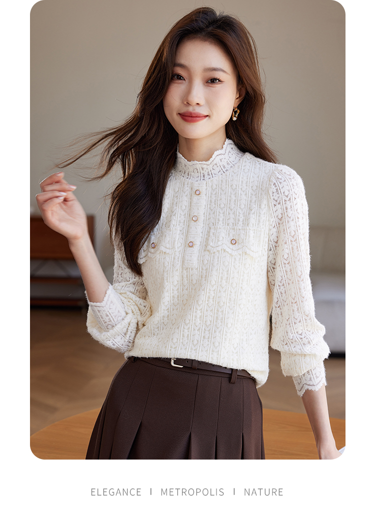 【年终特卖】熙世界杏色花边立领蕾丝衫女2025冬新款内搭磨毛抓绒小衫洋气上衣