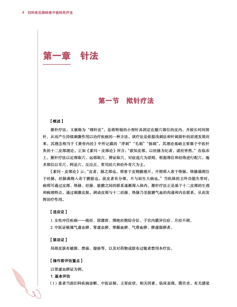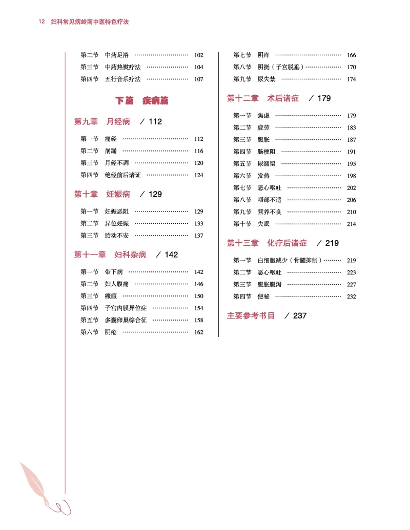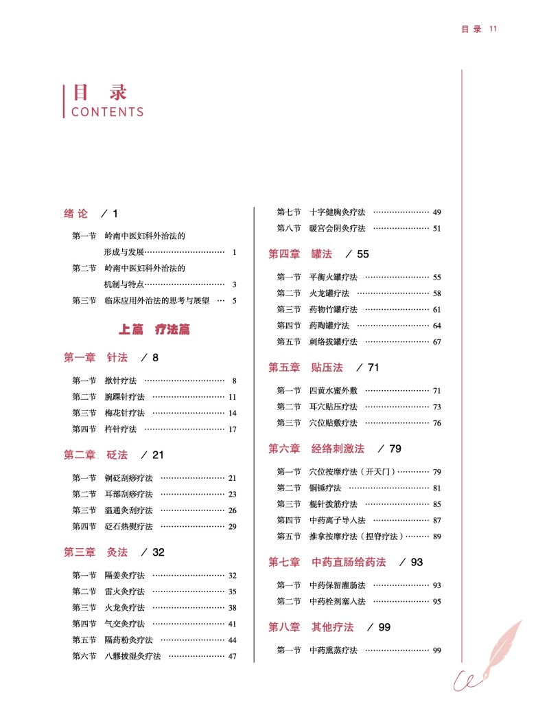 《妇科常见病中医特色疗法》一书,全书分为绪论、上篇、下篇。绪论介绍妇科疾病特点、外治法形成与历史沿革。上篇含有6章30节,将妇科常用中医特色疗法从针法、砭法、拔罐法、罐法、贴压法、经穴刺激法等进行分类介绍,共纳入30种特色疗法,内容全面、新颖,特别增加了近年来新开展的传统疗法,如铜锤疗法、棍针疗法、红外艾灸罐疗法、贴针疗法、刺穴疗法、喷灸疗法等,其病变病种特色,分别从概述、适应、护理评估重点、操作流程规范、注意事项等进行介绍,提供临床实践者学习参考。下篇共七个章节,选择妇科常见30个病症,对施护过程中选用外治法的临床思维和实践进行阐述,详细介绍了每个病症的临床辨证思路、特色疗法治疗方案、操作方法、总结分析、辨证饮食、生活调护等,以既往真实的病案为基础,介绍应用中医特色疗法的效果与经验,供同行学习借鉴。