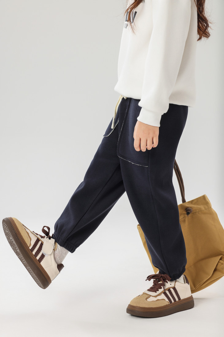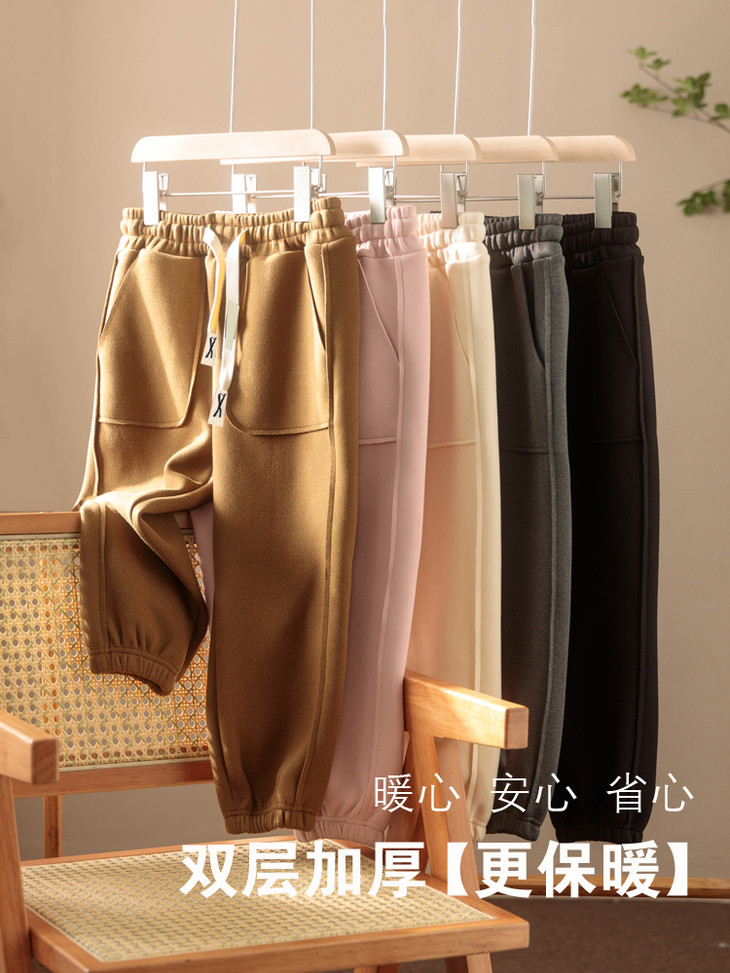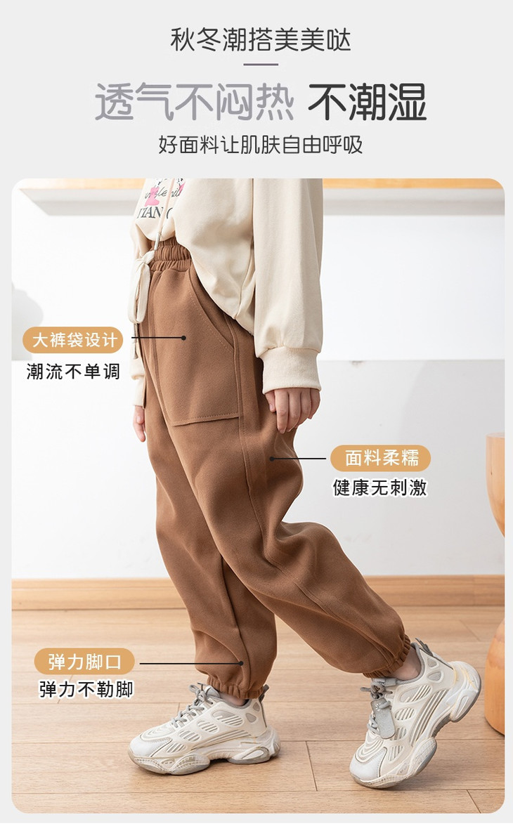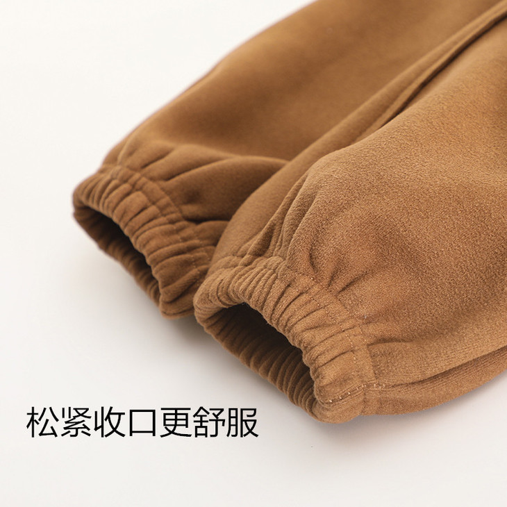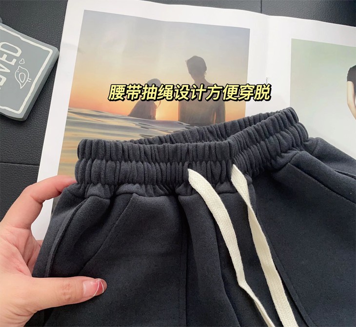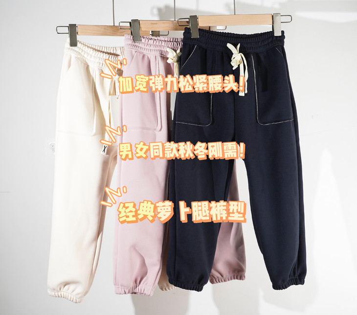 配件辅料都是按照专柜标准给你们定做的😎 内里整身都是更加舒服的超柔绒,特别保暖亲肤! 加宽弹力腰头,小朋友自主穿脱也很方便! 经典束脚卫裤版型,宽松舒适又百搭!闭眼抢啊💥