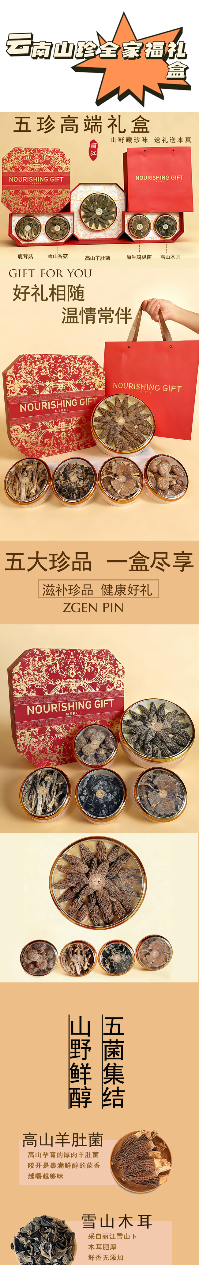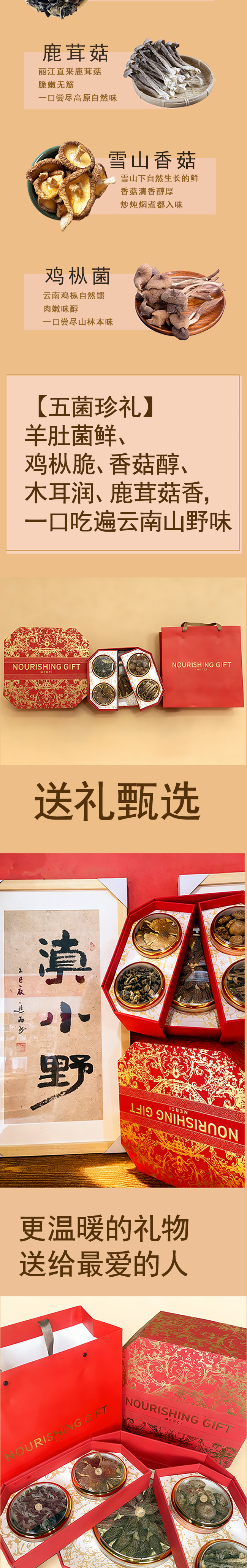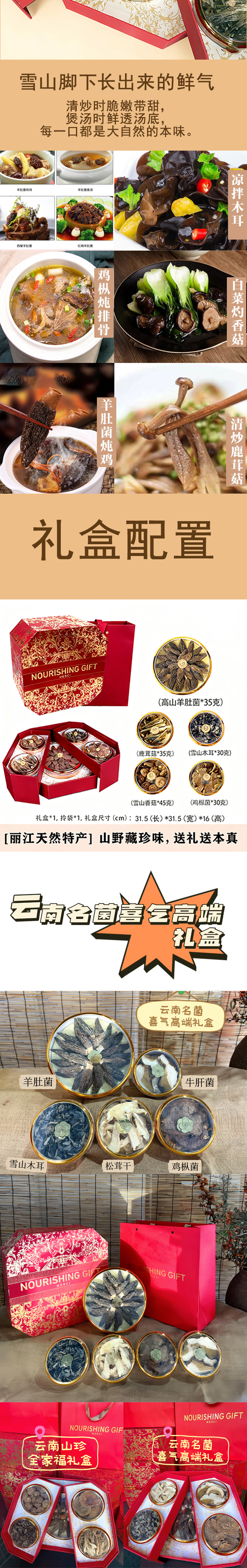 云南名菌喜气高端礼盒(高山羊肚菌35克 +松茸干25克+雪山木耳30克+鸡枞菌30克+牛肝菌30克)一款网罗经典名菌+稀缺干货,不管是春节走亲访友、孝敬长辈,还是商务馈赠,拿得出手倍有面。