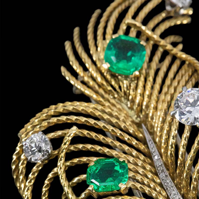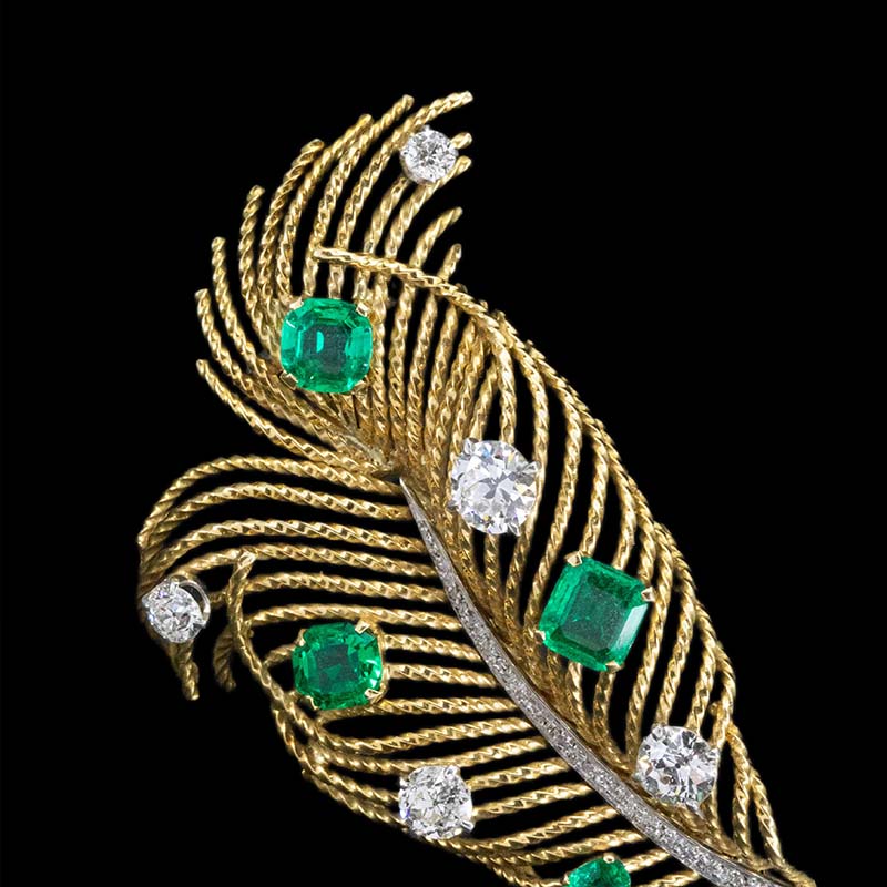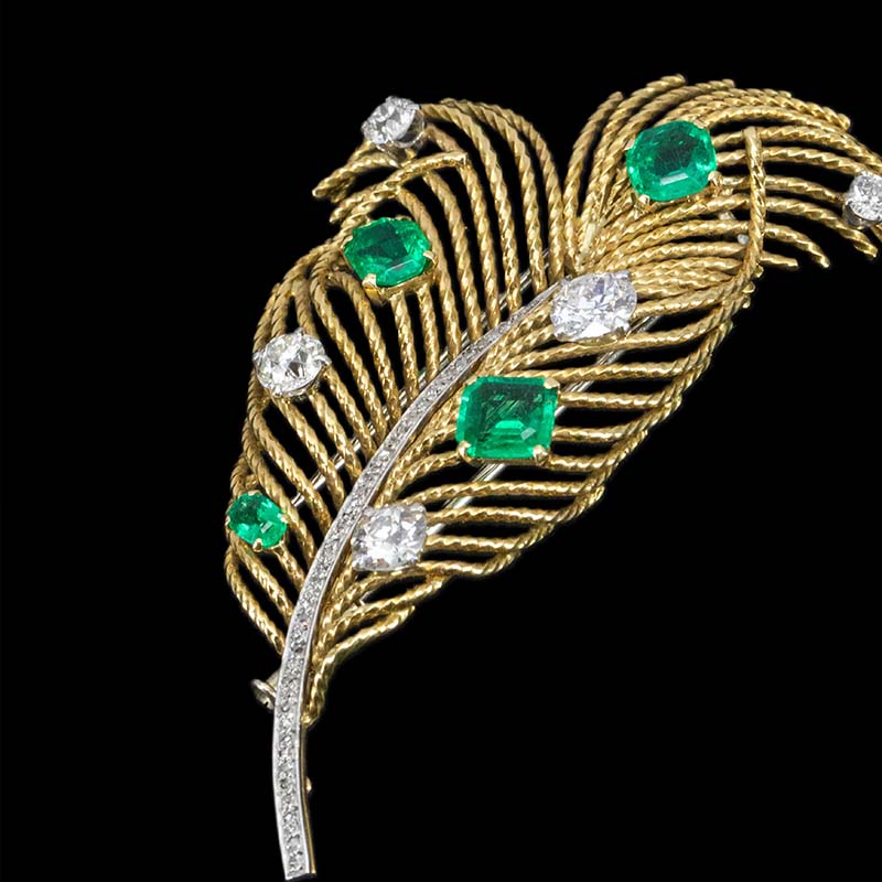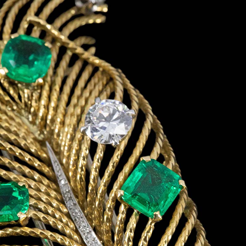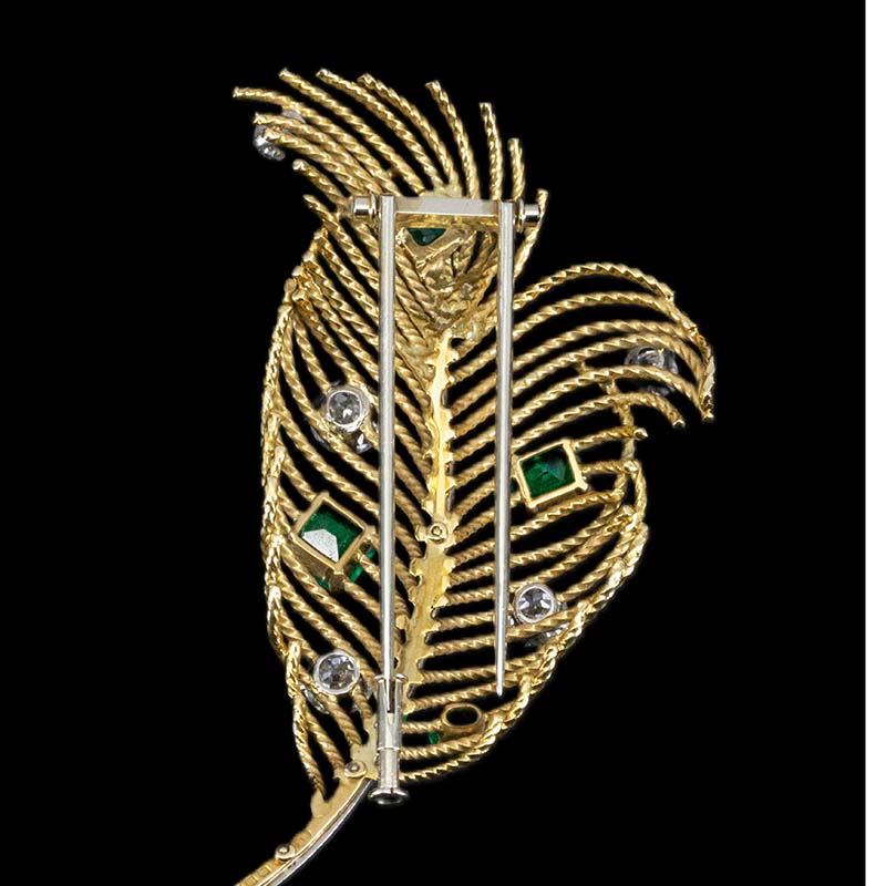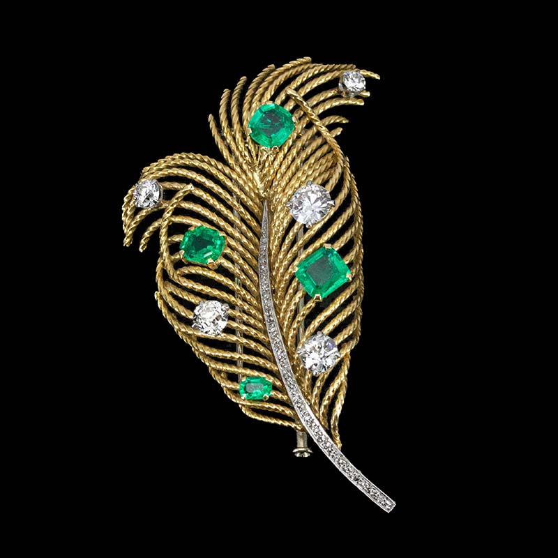 1960年代欧洲出品羽毛造型18K黄金镶嵌哥伦比亚祖母绿及钻石胸针