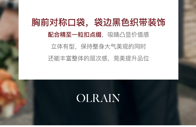 - “精致”是欧芮儿olrain品牌文化的核心,欧芮儿认为,精致的女人,不但要外在动人,更要内在迷人,内外兼修,有魅力、有气质、有内涵,自信而不自傲,优雅而不矫揉,自有万种风情而不轻浮,更不故作矜持。