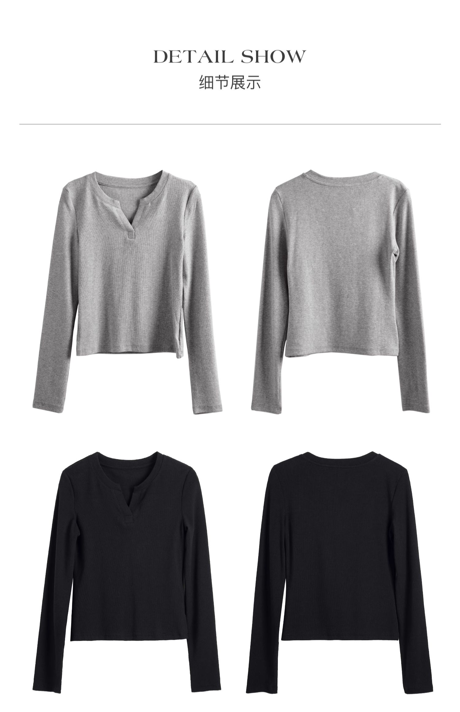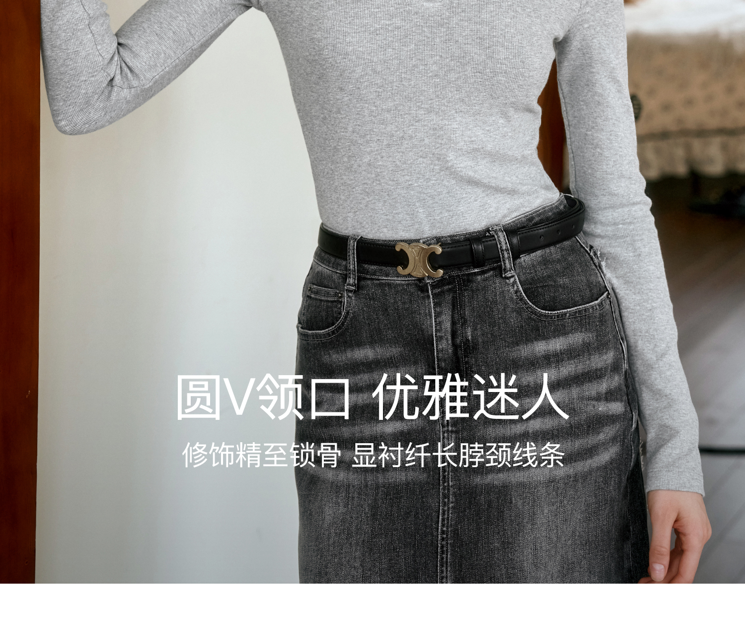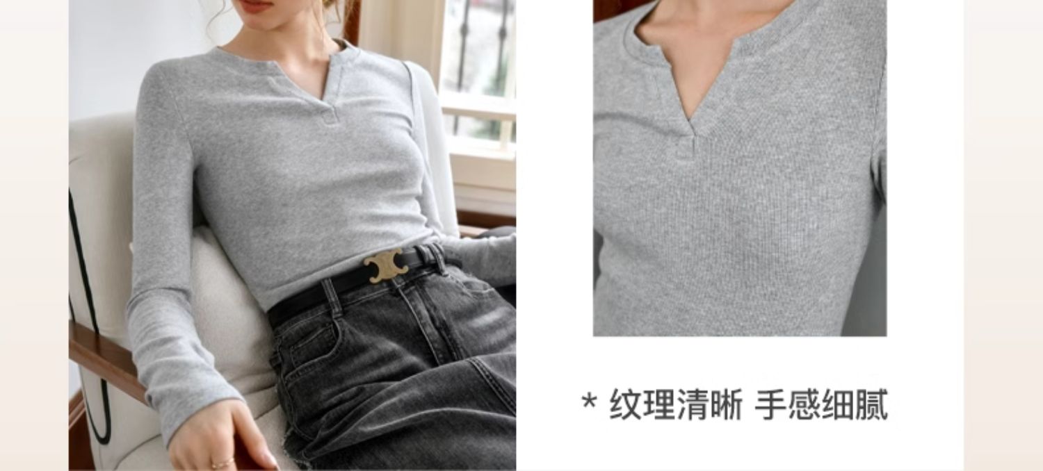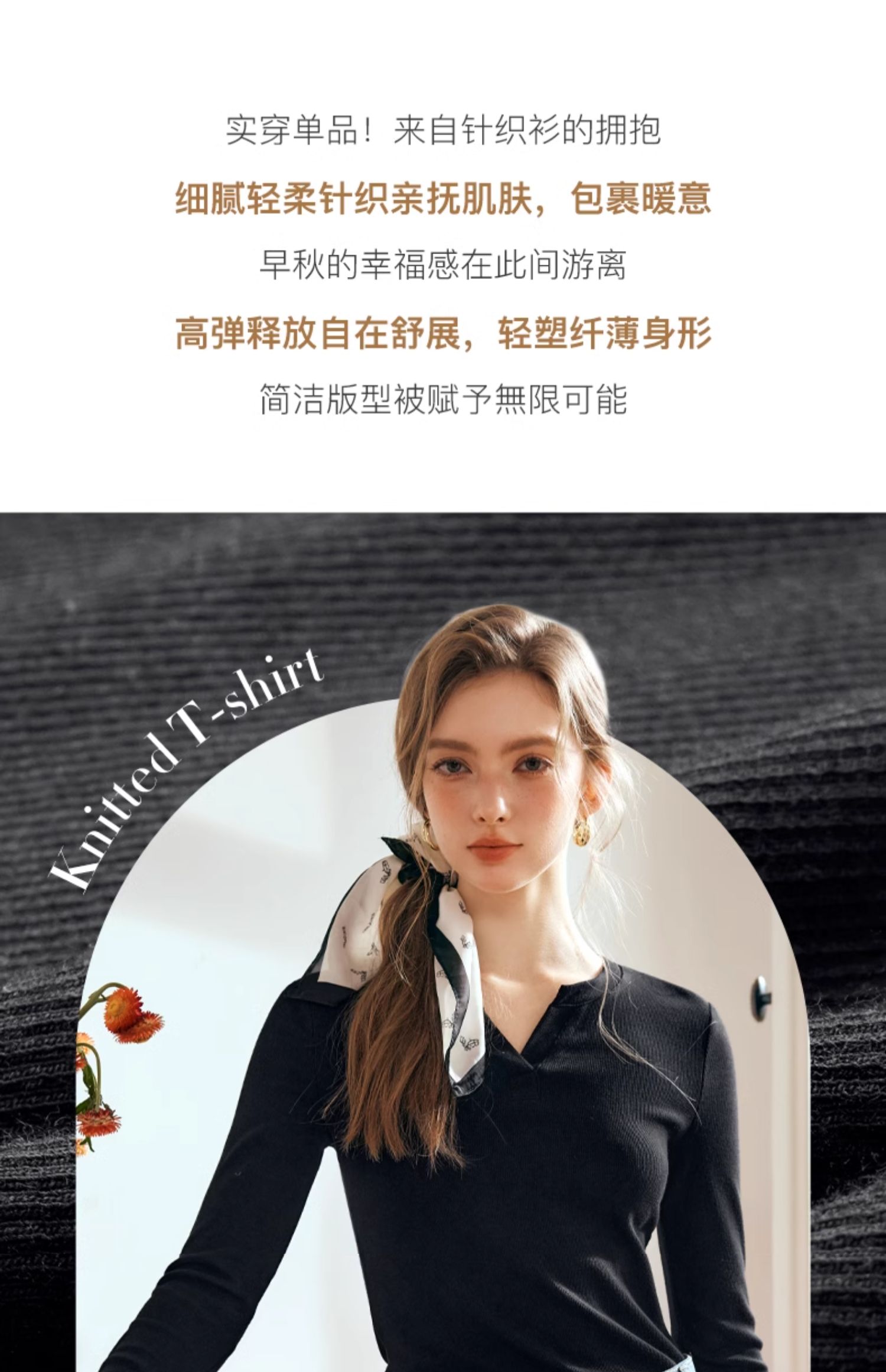 OLrain欧芮儿法式花灰色圆V领T恤女早秋2024新款简约长袖针织上衣