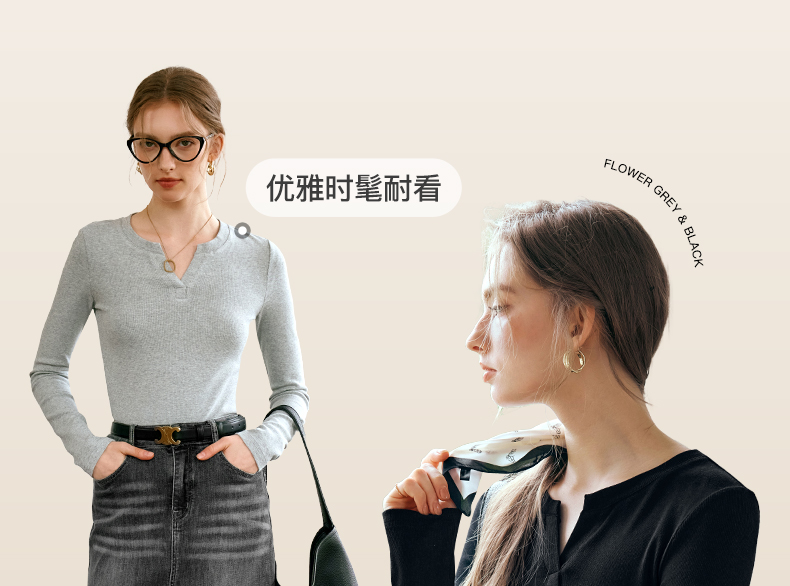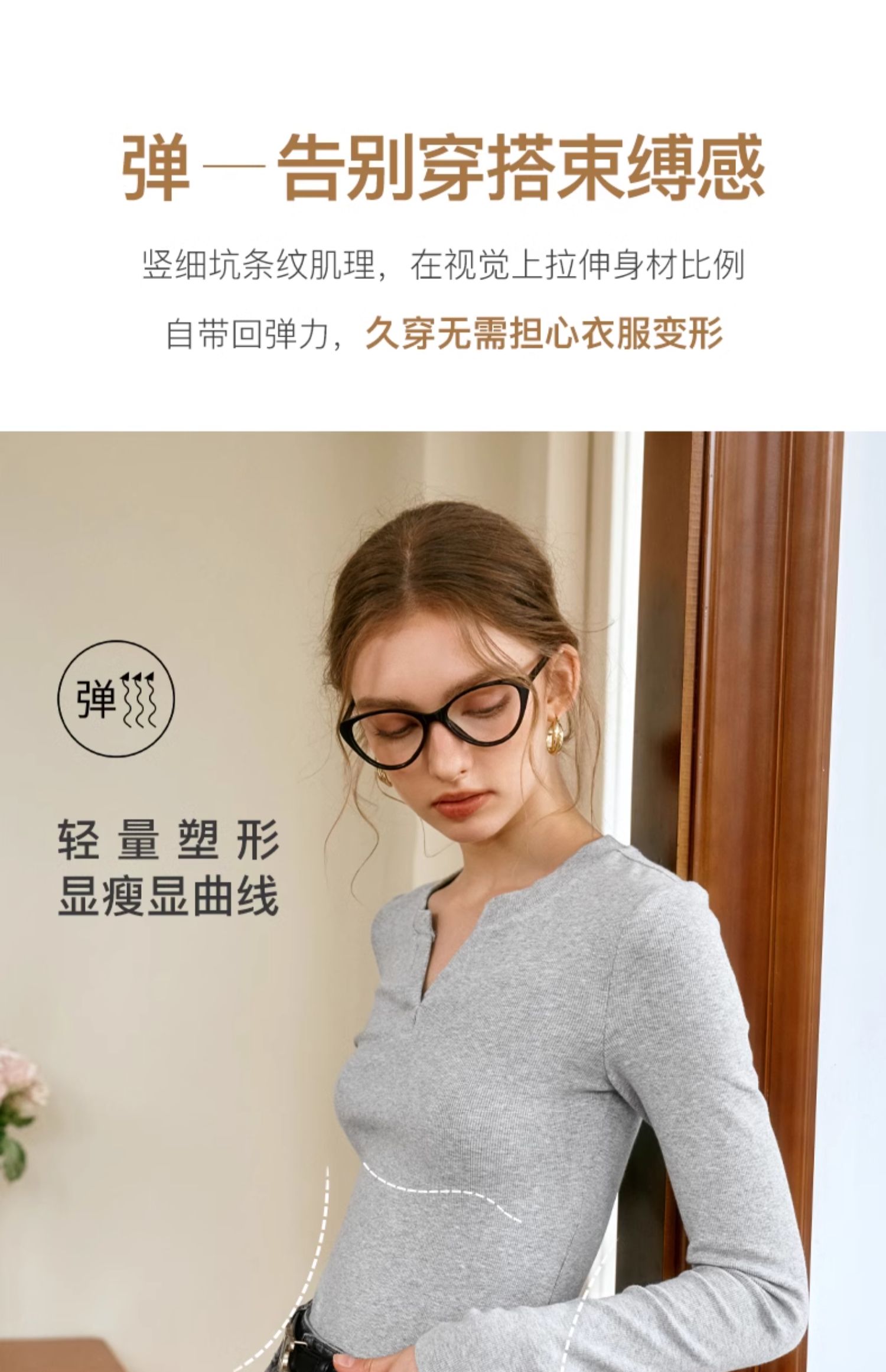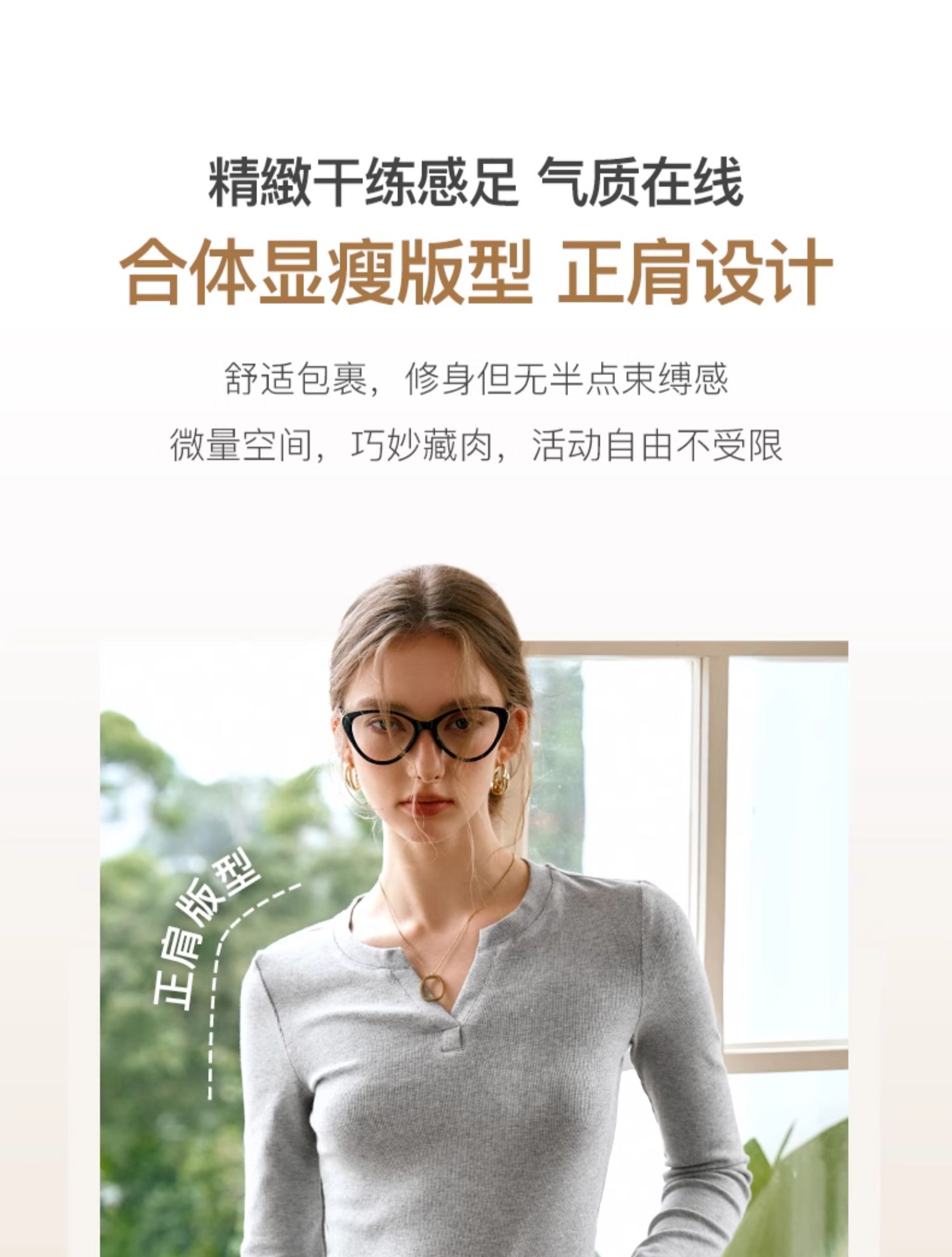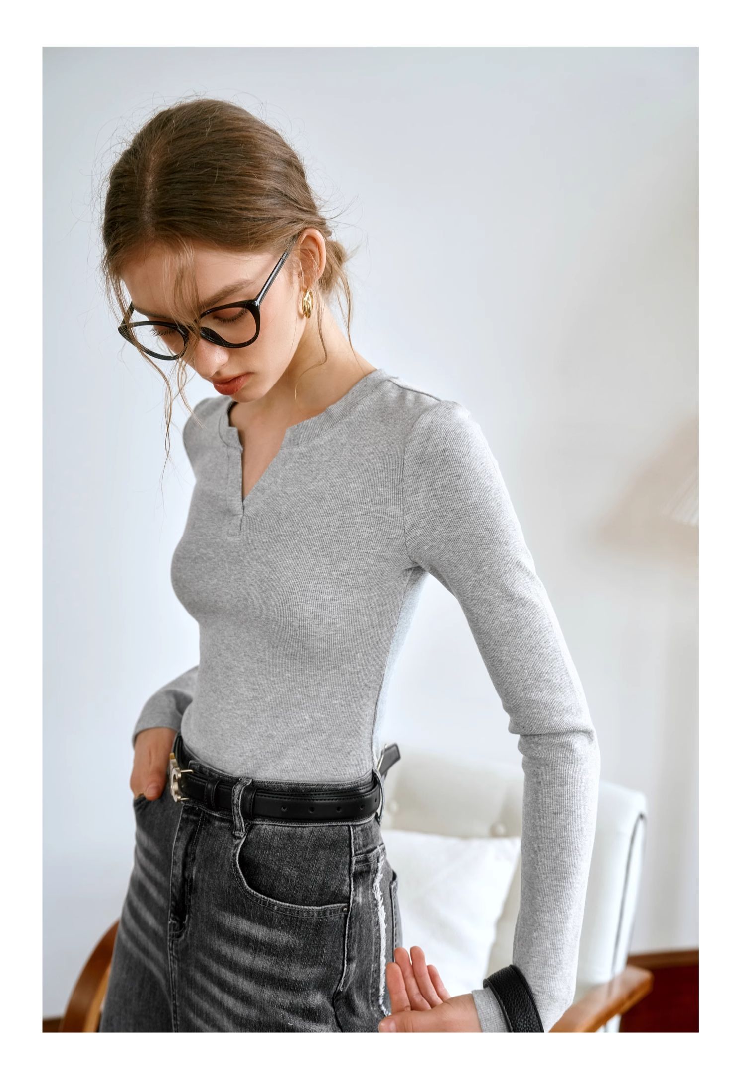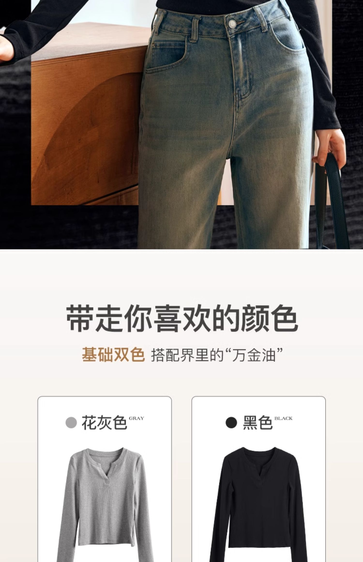 OLrain欧芮儿法式花灰色圆V领T恤女早秋2024新款简约长袖针织上衣