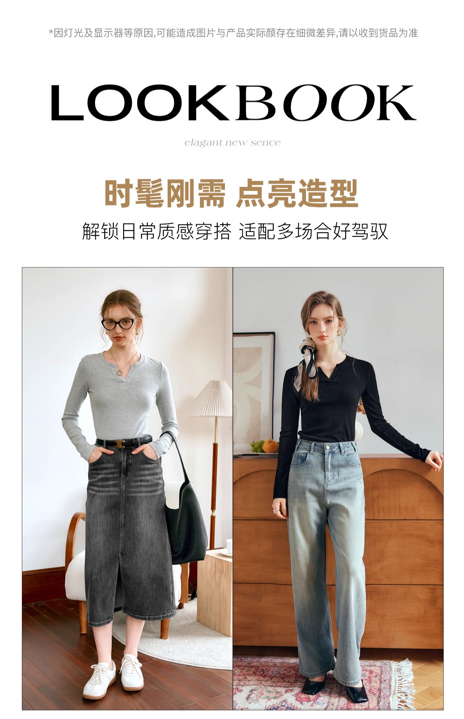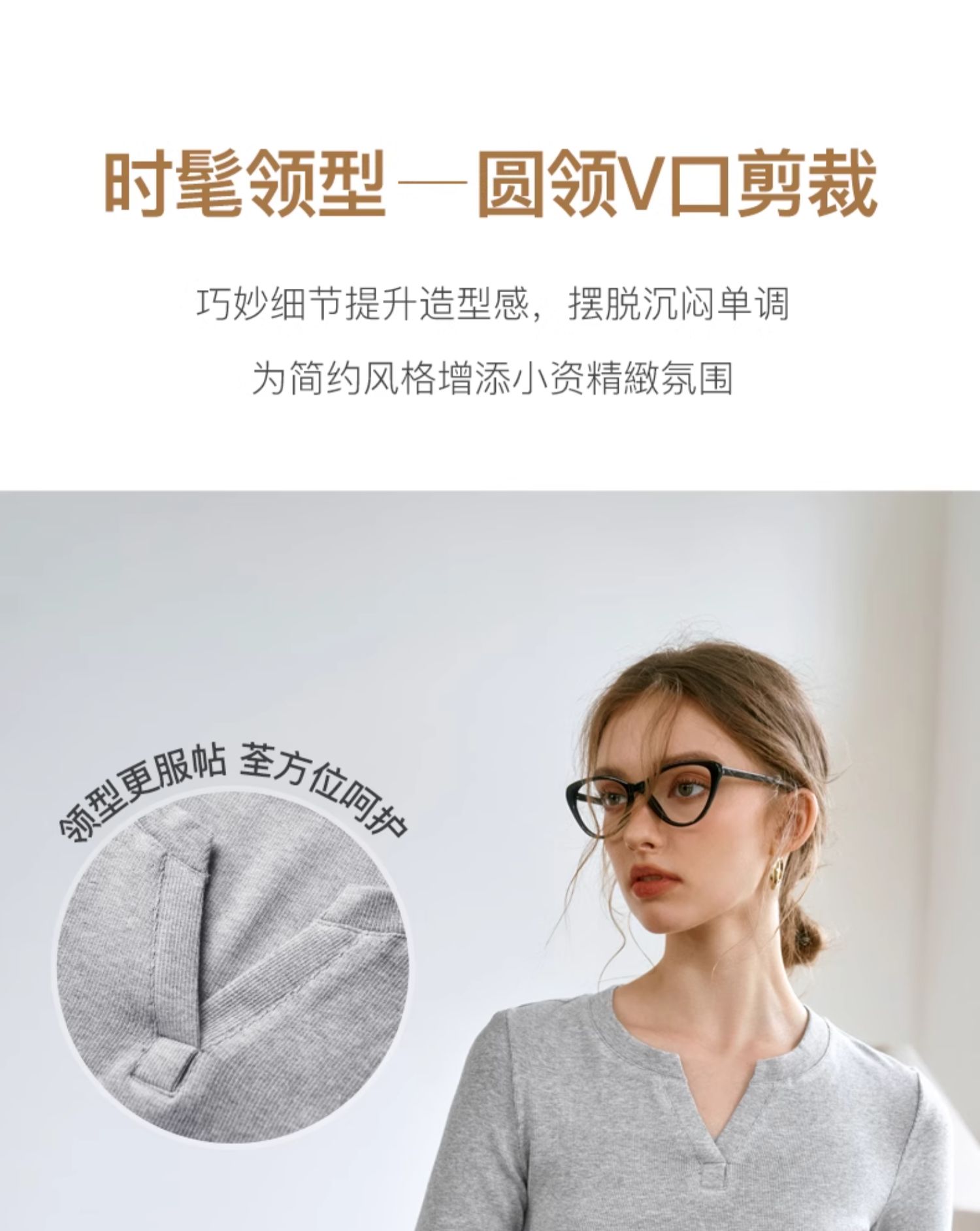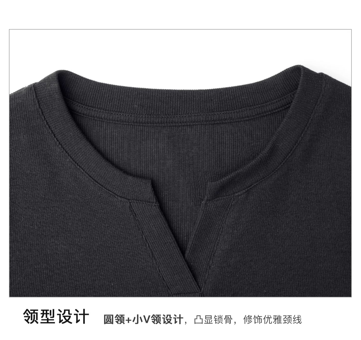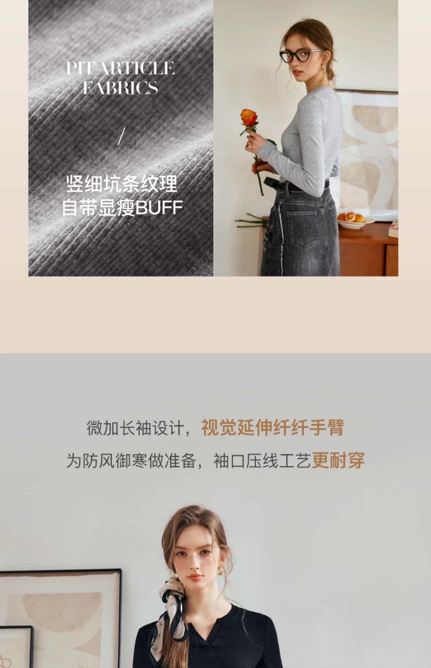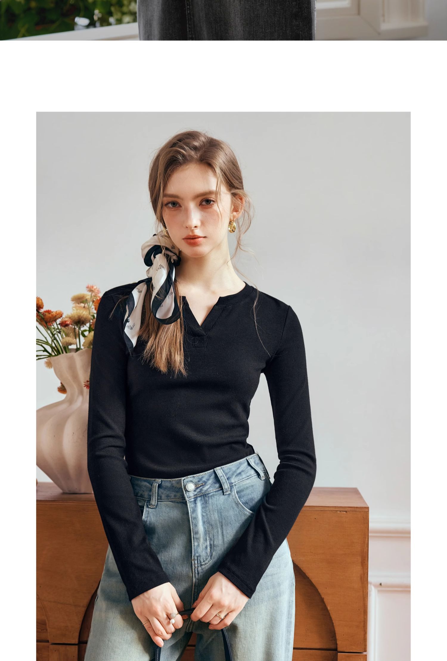 OLrain欧芮儿法式花灰色圆V领T恤女早秋2024新款简约长袖针织上衣