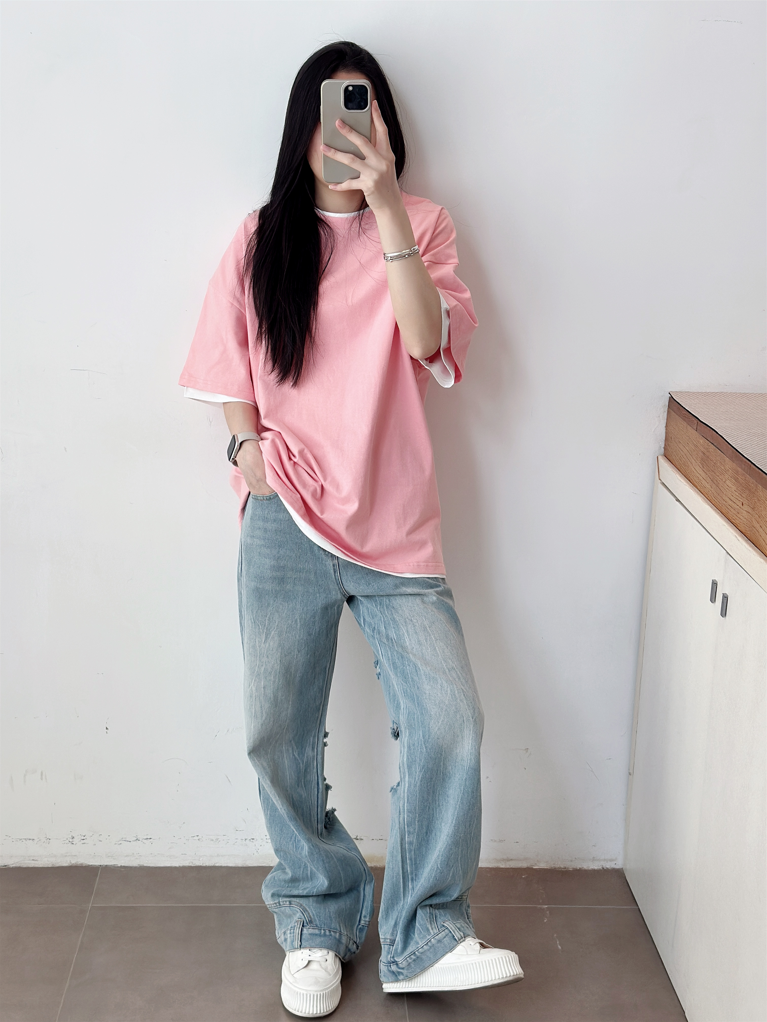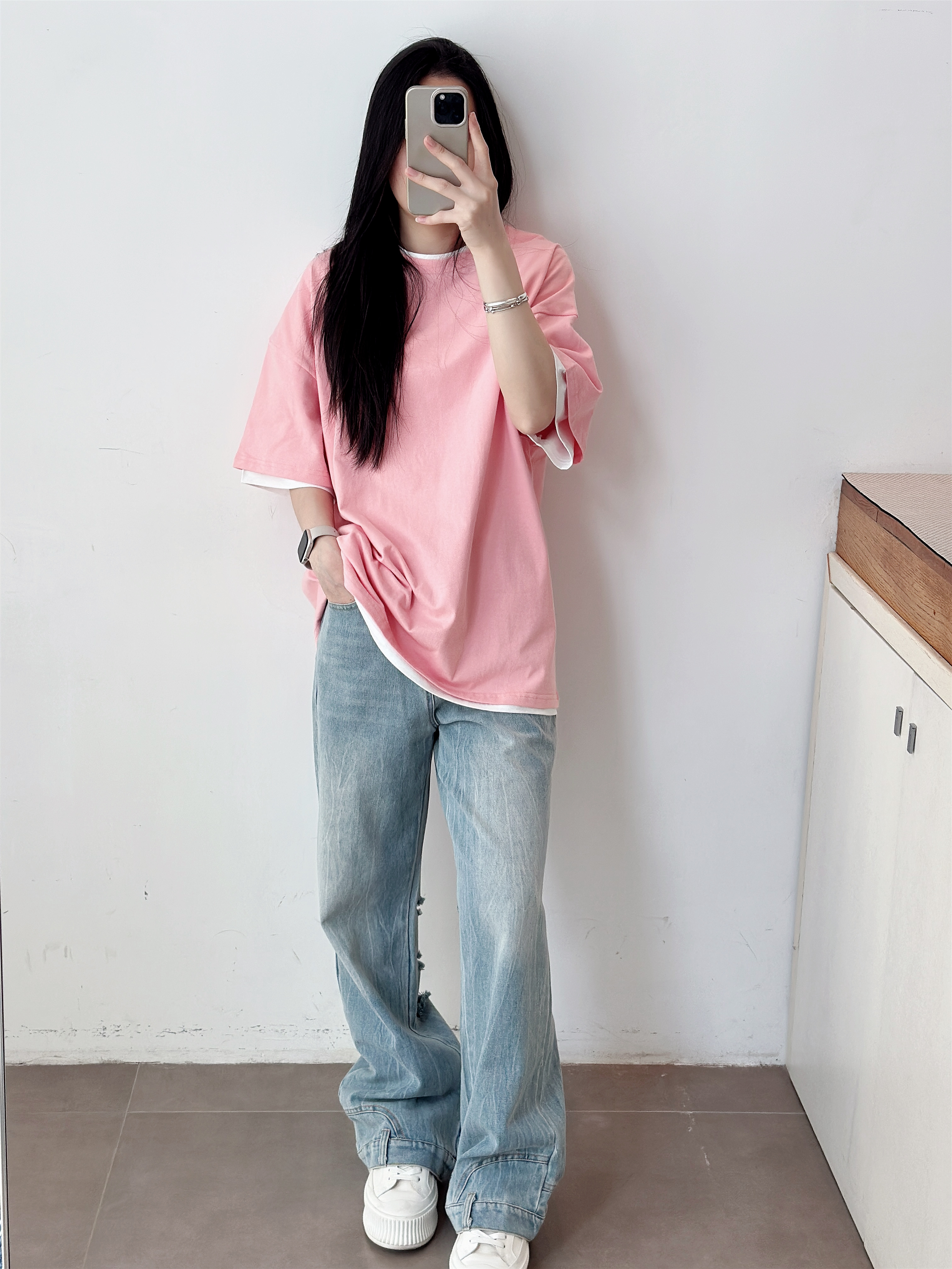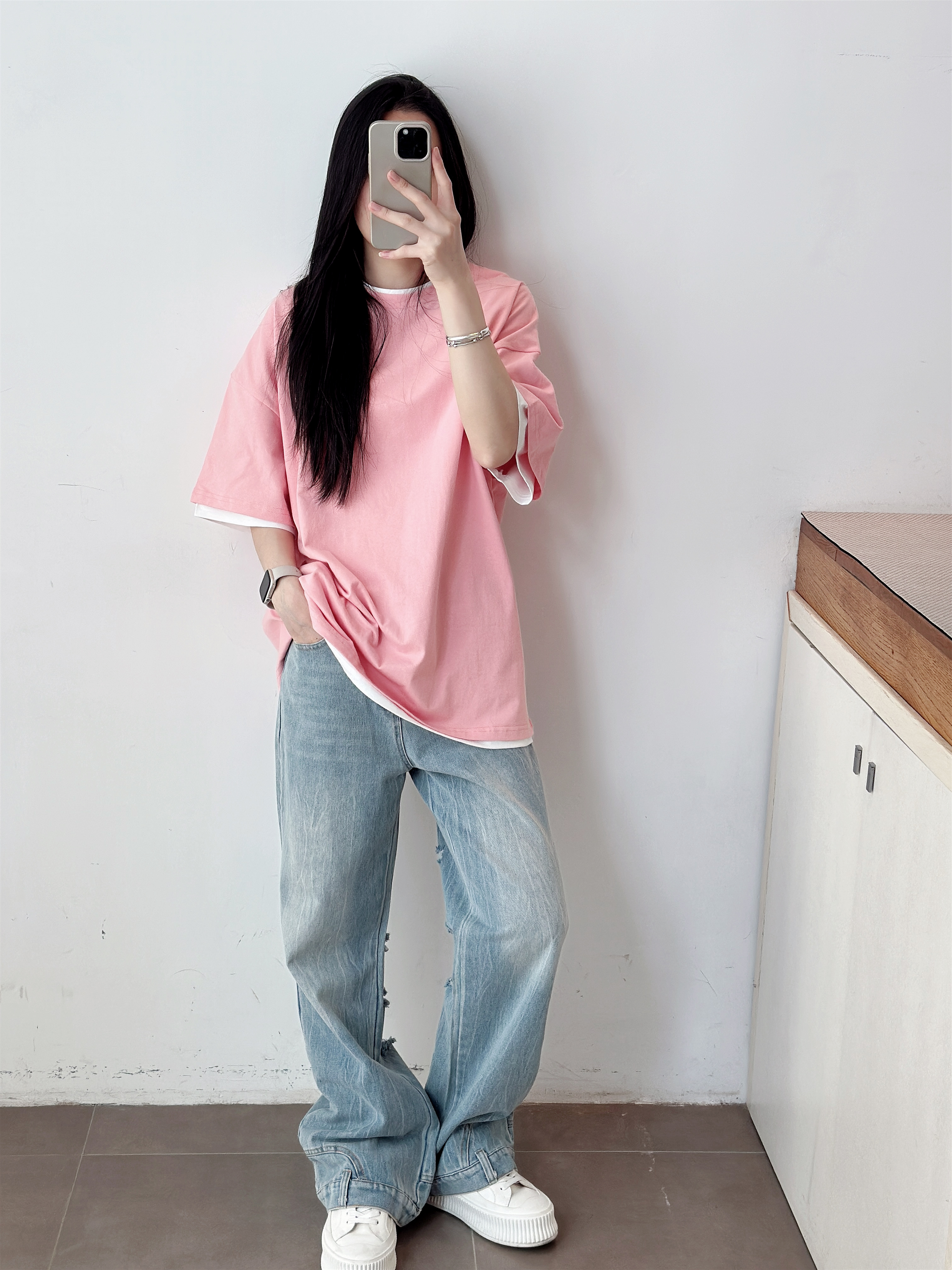极简风后背字母 假两件叠穿宽松短袖T恤