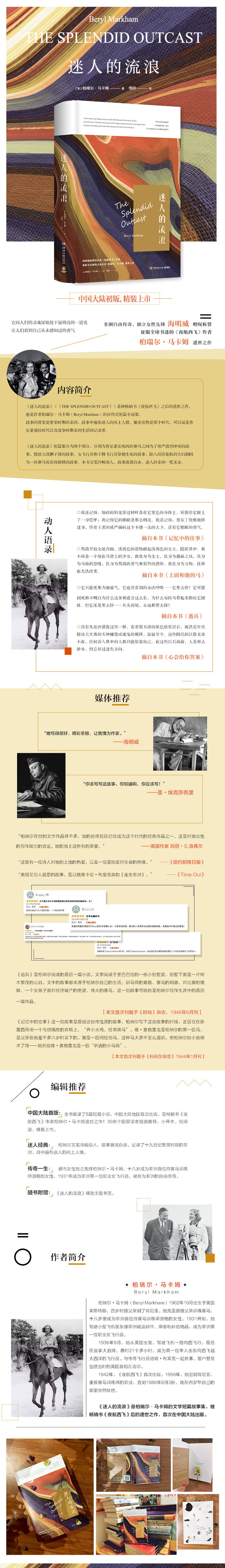 《迷人的流浪》(《THE SPLENDID OUTCAST》)是继畅销书《夜航西飞》之后的遗世之作,也是作者柏瑞尔·马卡姆(Beryl Markham)的自传式短篇小说集。