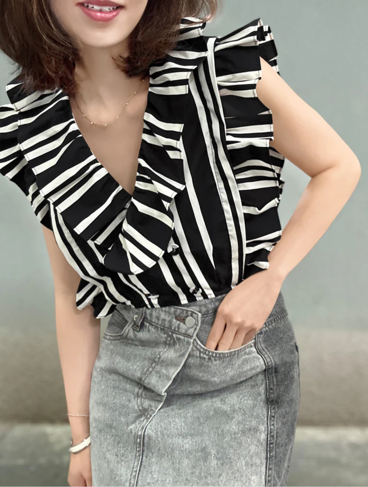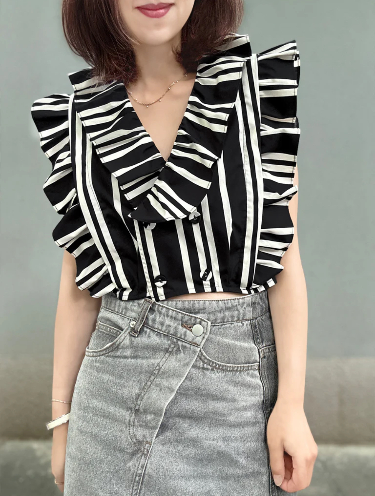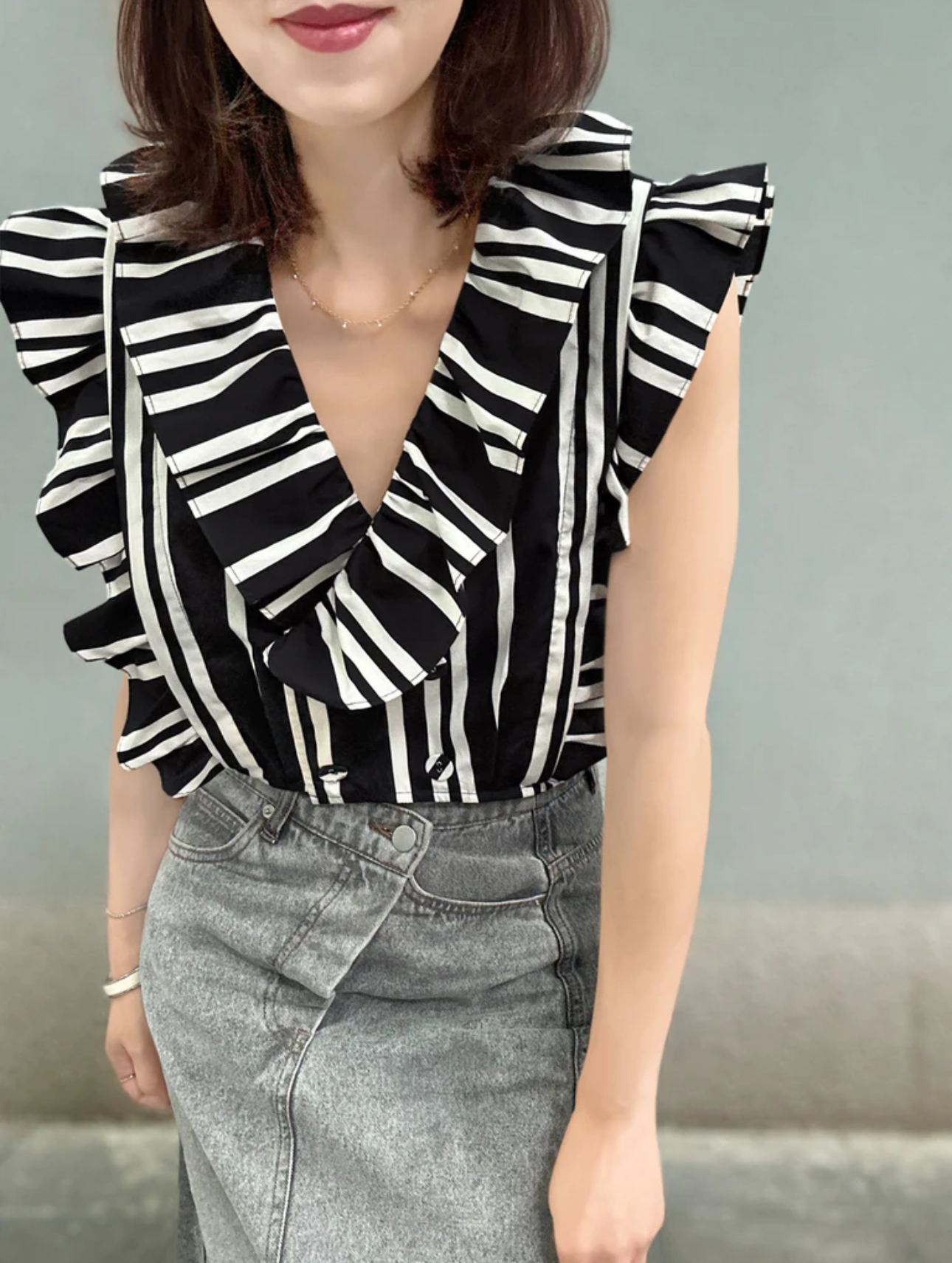 TYNVIE 宽花边装饰双排扣上衣 - 黑条纹