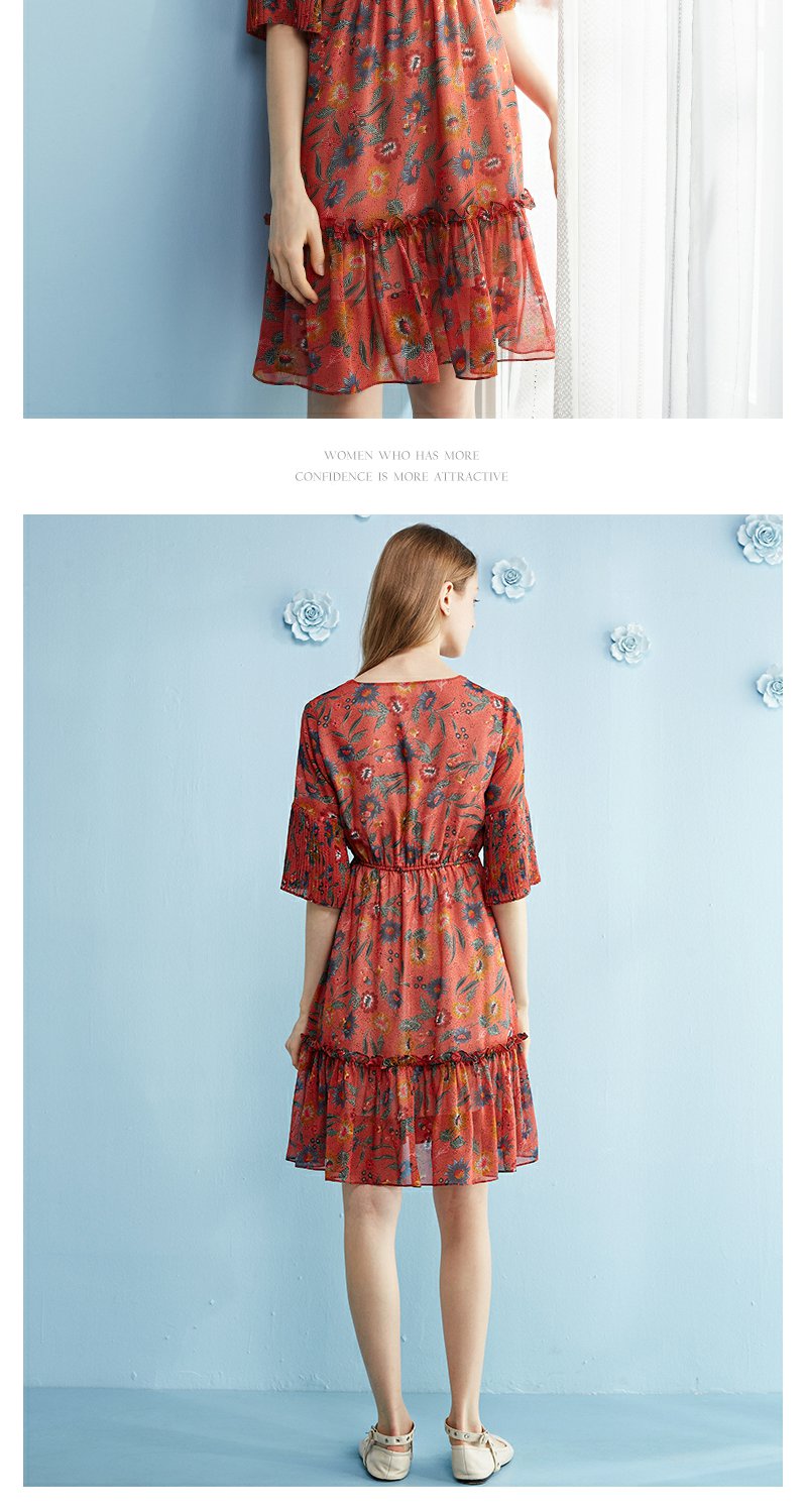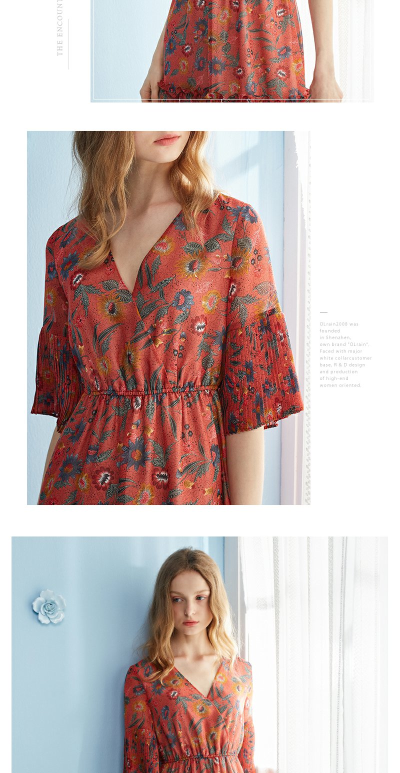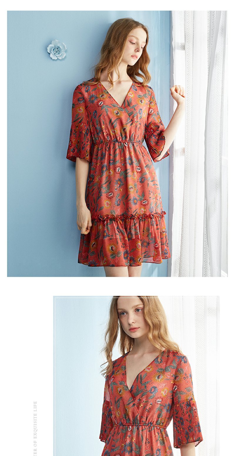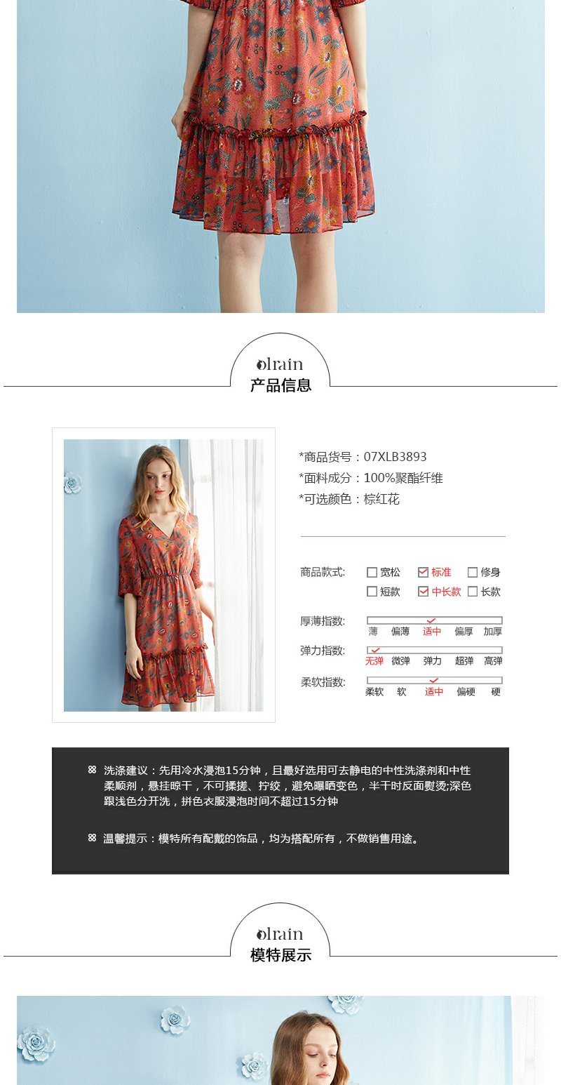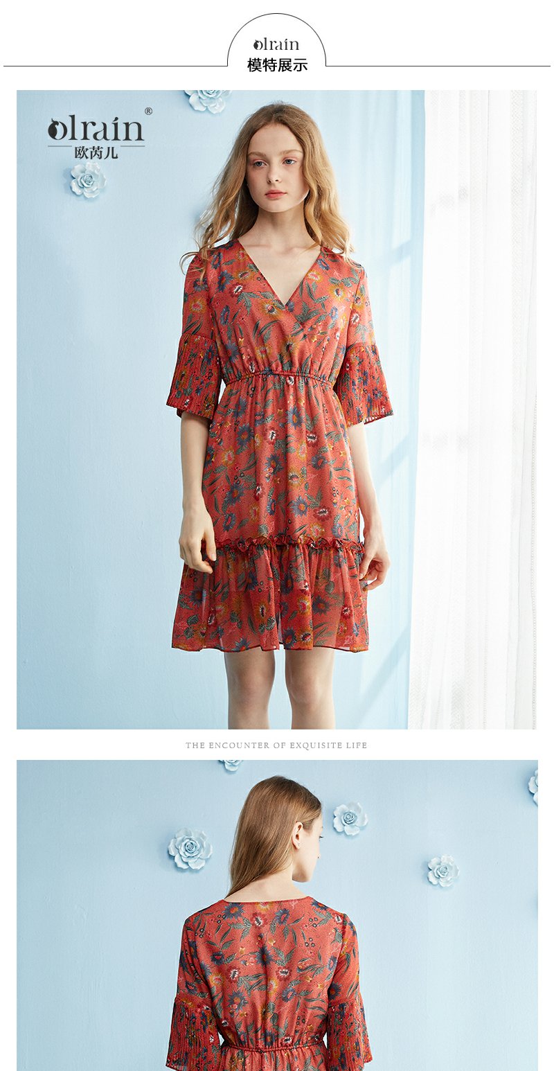欧芮儿 夏装新款红色碎花雪纺连衣裙V领印花收腰a字中长款裙子07XLB3893