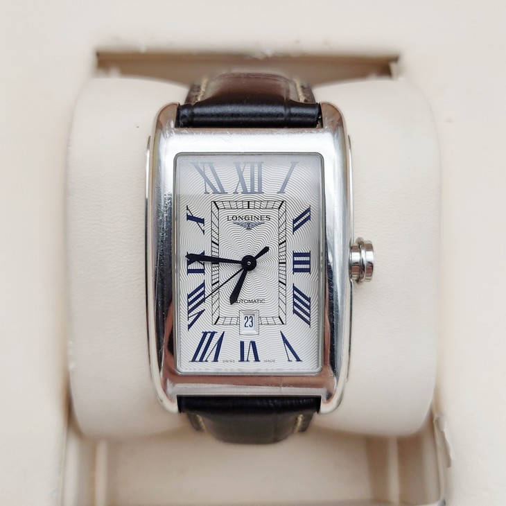 浪琴优雅系列L5.757.4.71.9男款机械表,27.2*43.8mm表径,银白色方盘,精钢表壳后换皮带,罗马数字时标,(浪琴大号坦克)日期显示,9成新单表,专柜价12500,现好价