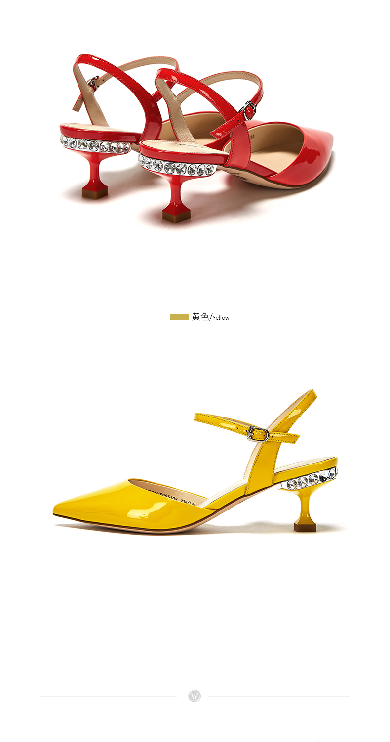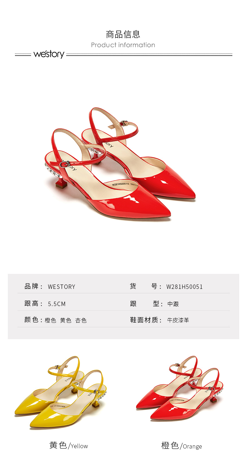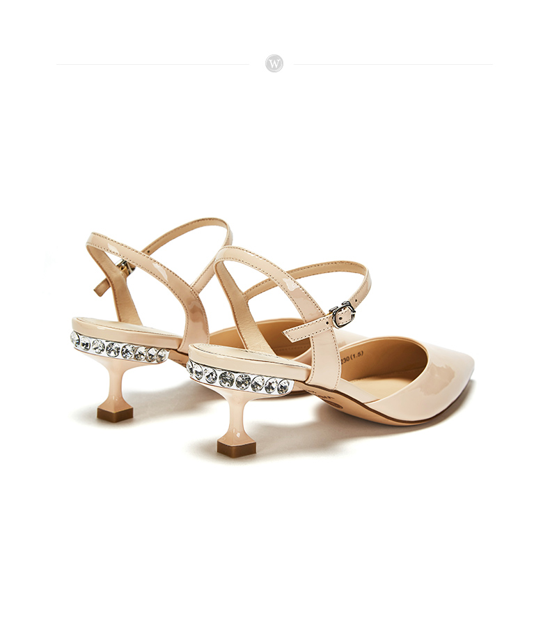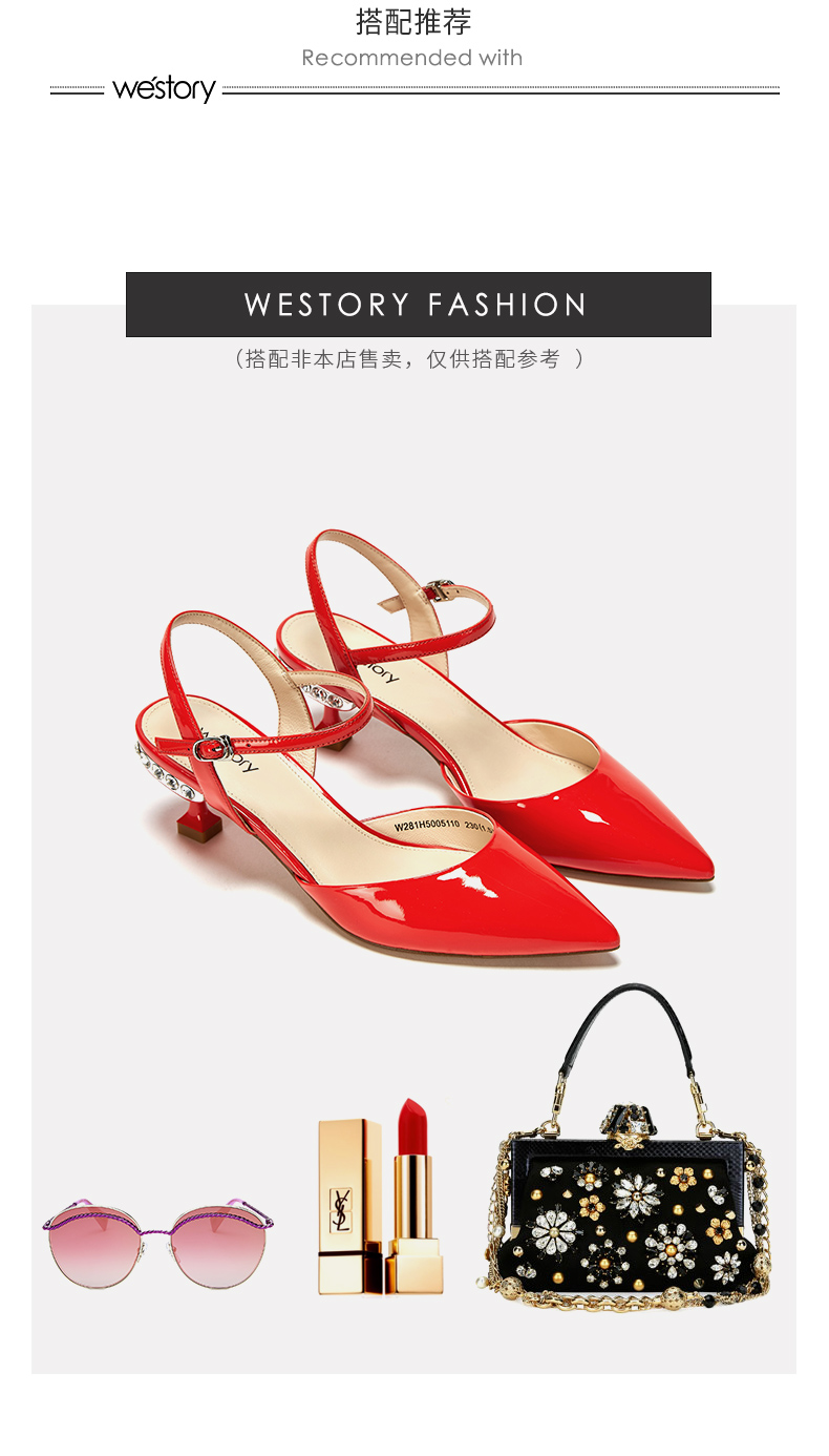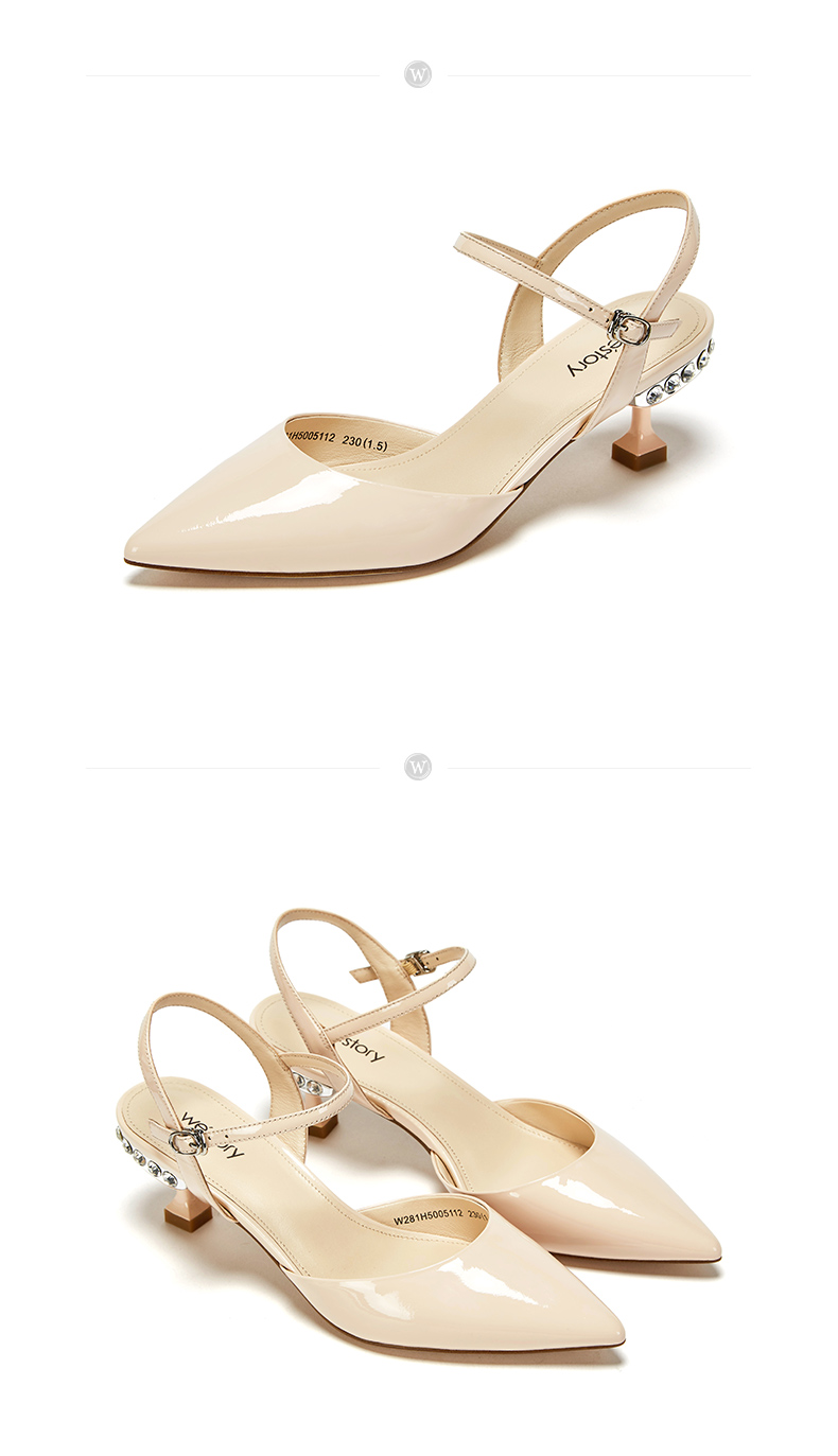 westory23年春新款时尚尖头方形水钻扣高跟鞋细跟女气质名媛55381