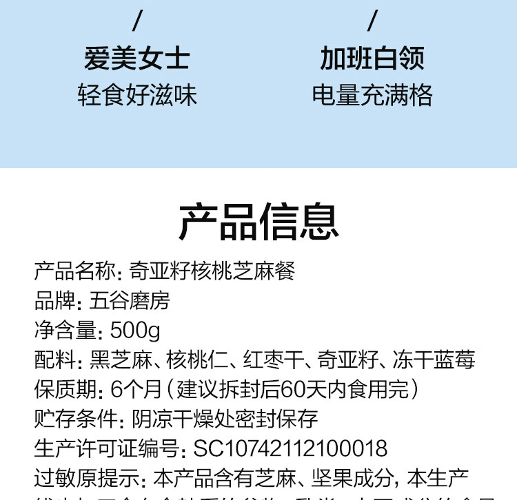 五谷磨房奇亚籽核桃芝麻餐500g/盒