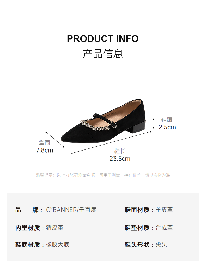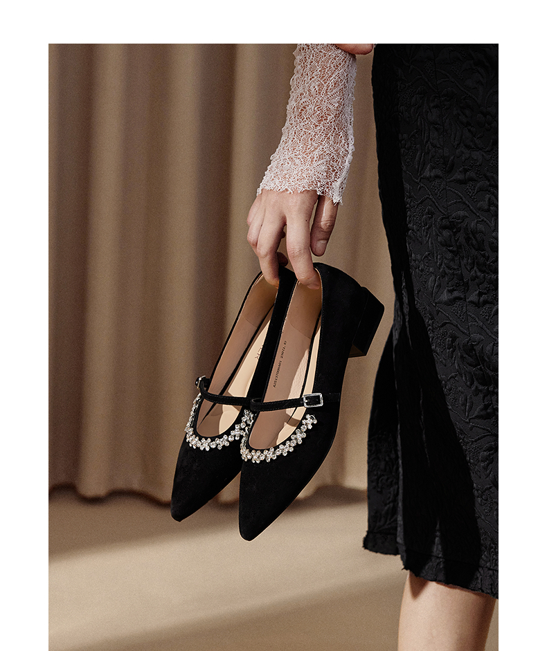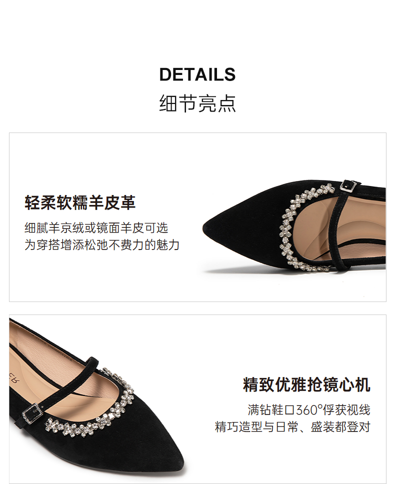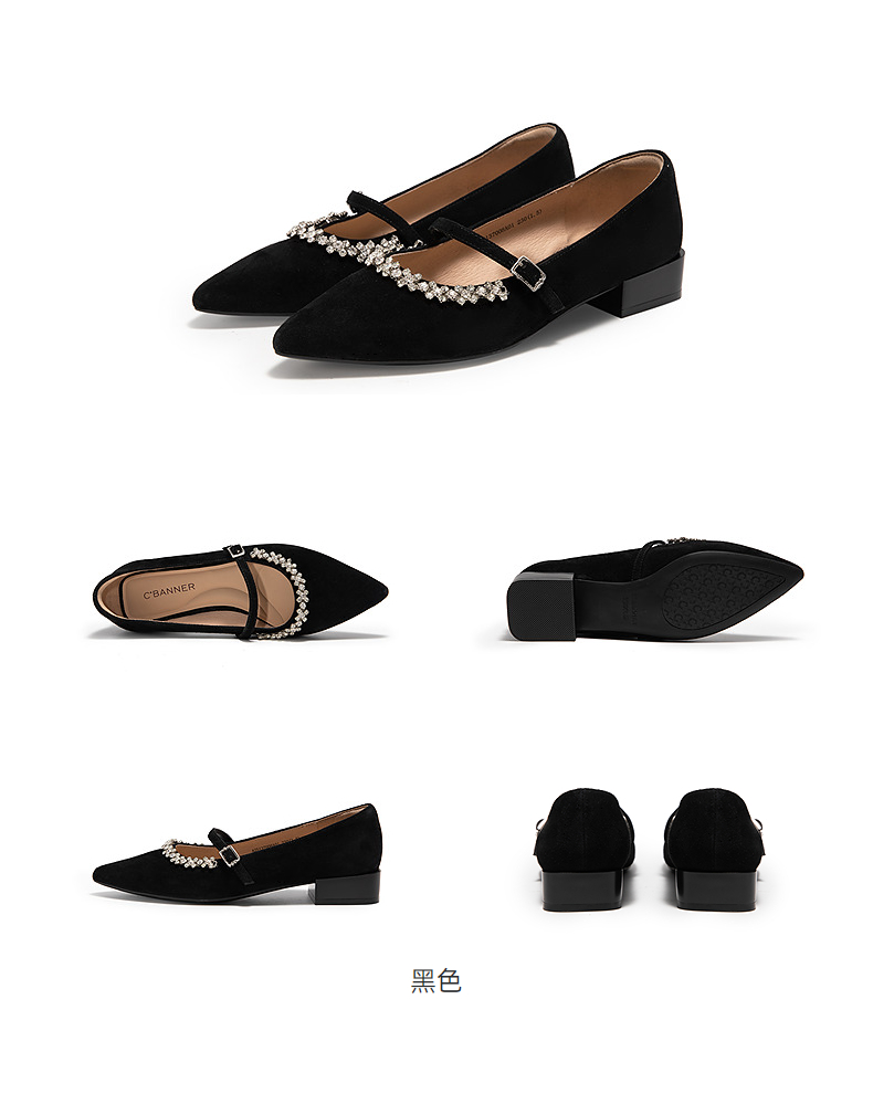 千百度钻饰尖头羊皮玛丽珍鞋女气质百搭新款低跟通勤舒适浅口单鞋A25137008