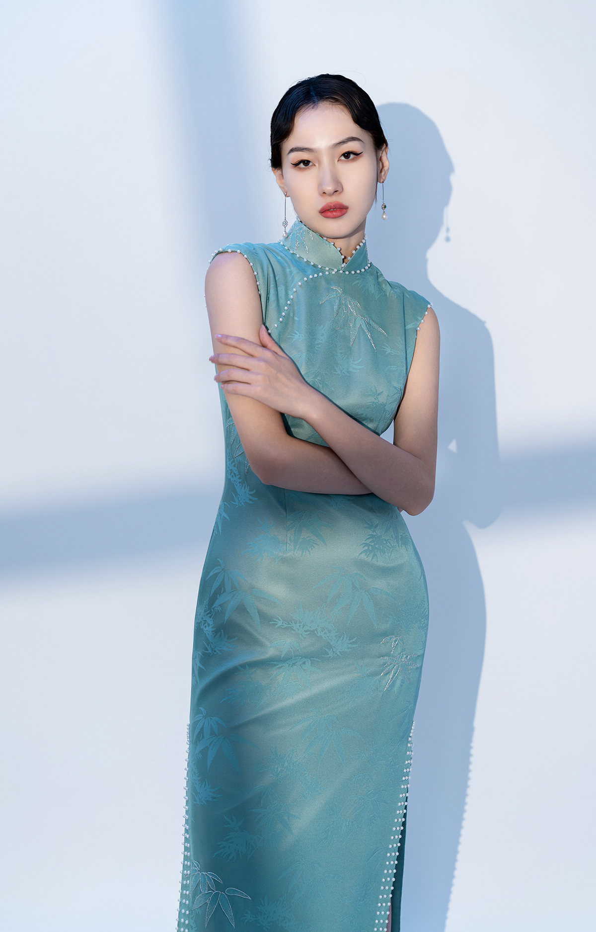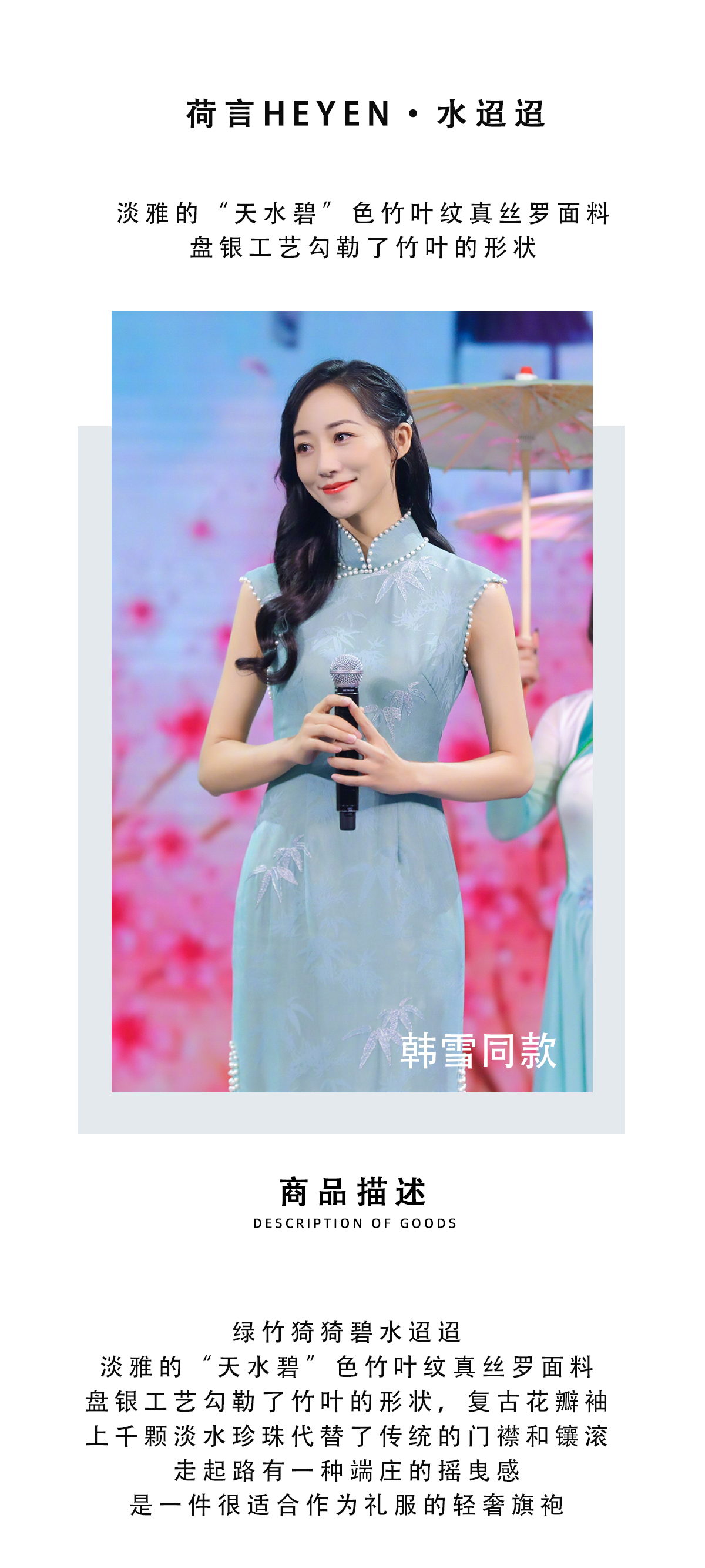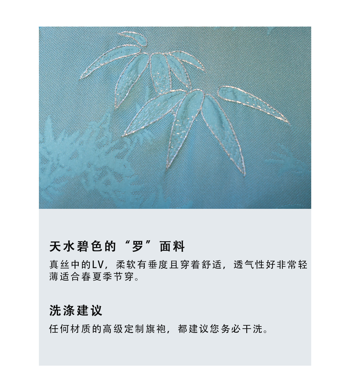 【明星同款】荷言HEYEN 水迢迢 天水碧色非遗花罗旗袍花瓣袖手工钉珠高级定制