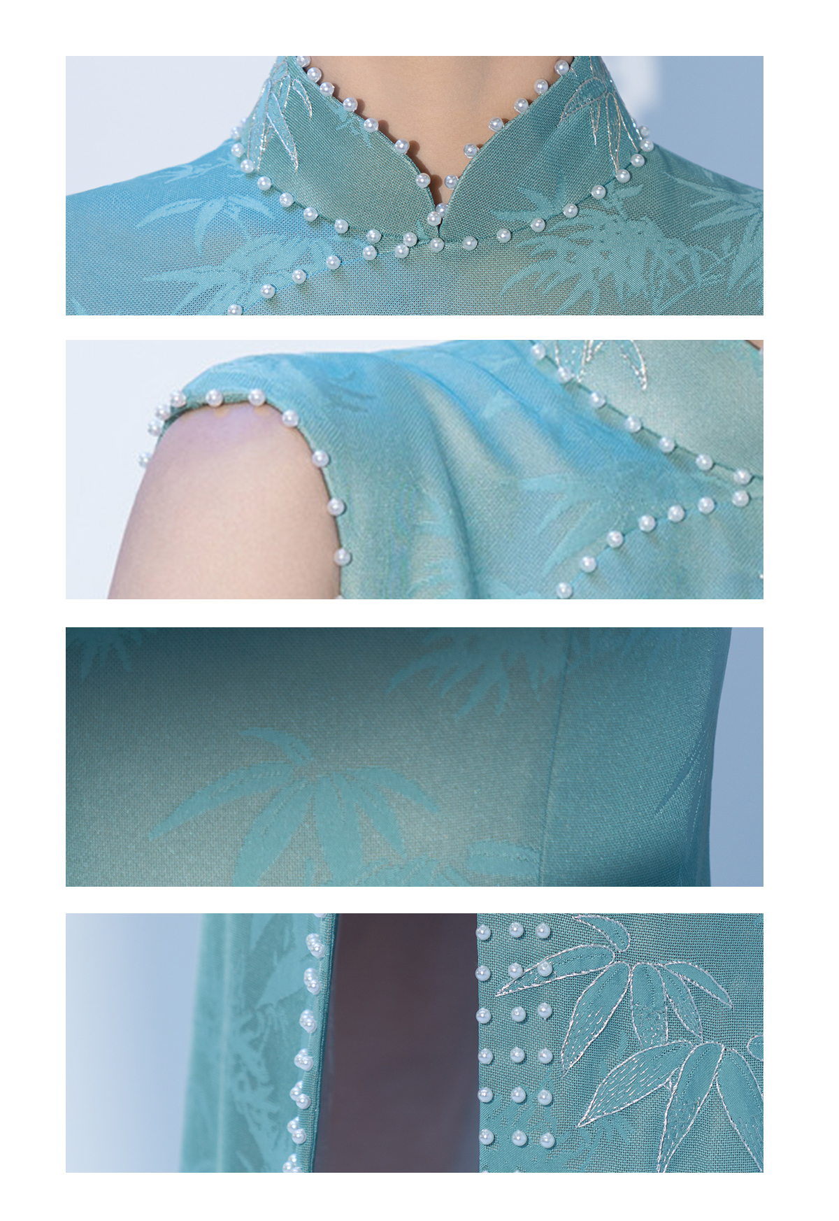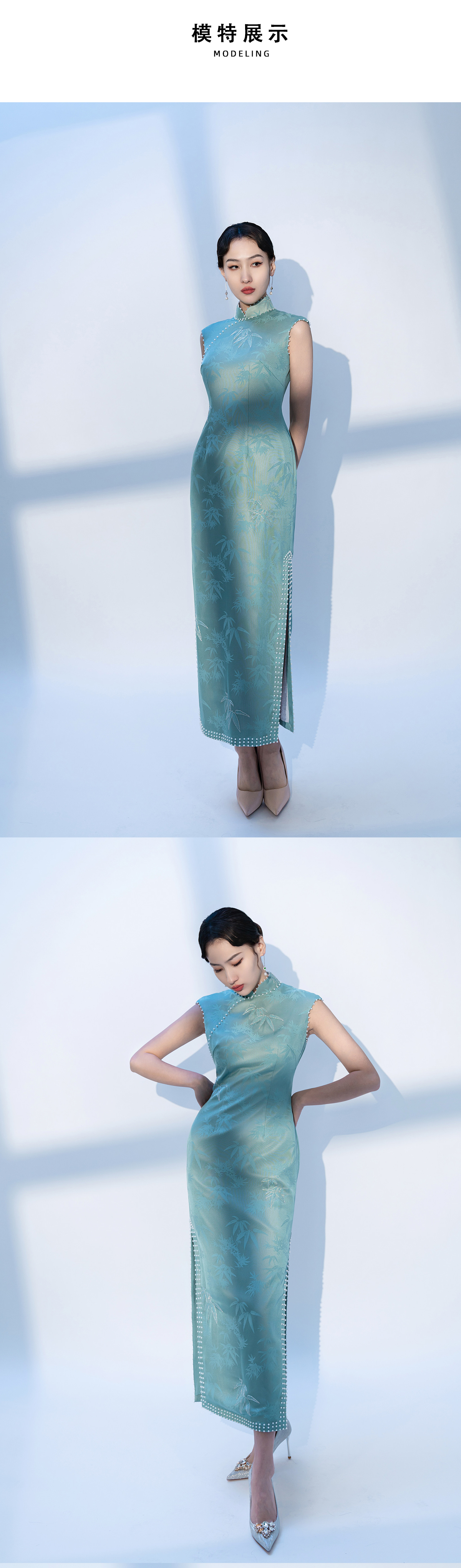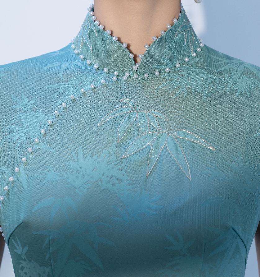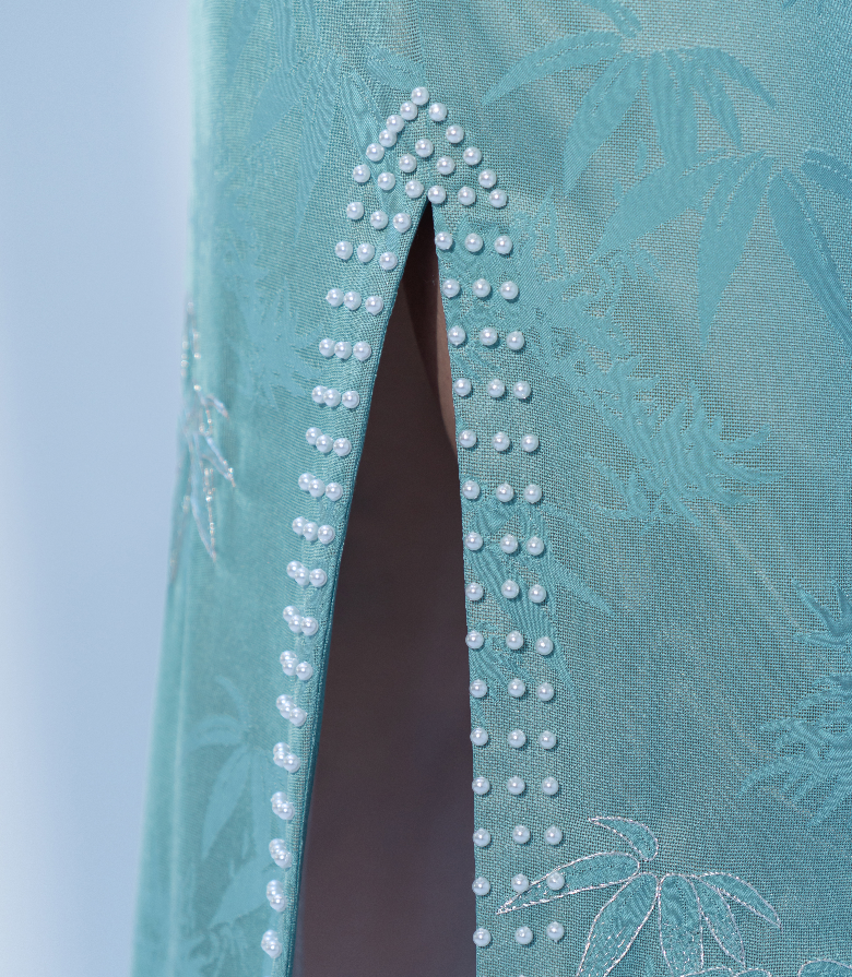 【明星同款】荷言HEYEN 水迢迢 天水碧色非遗花罗旗袍花瓣袖手工钉珠高级定制