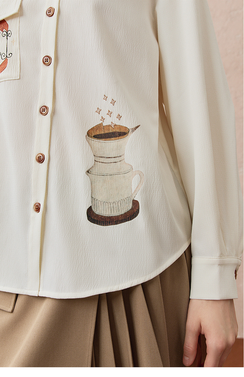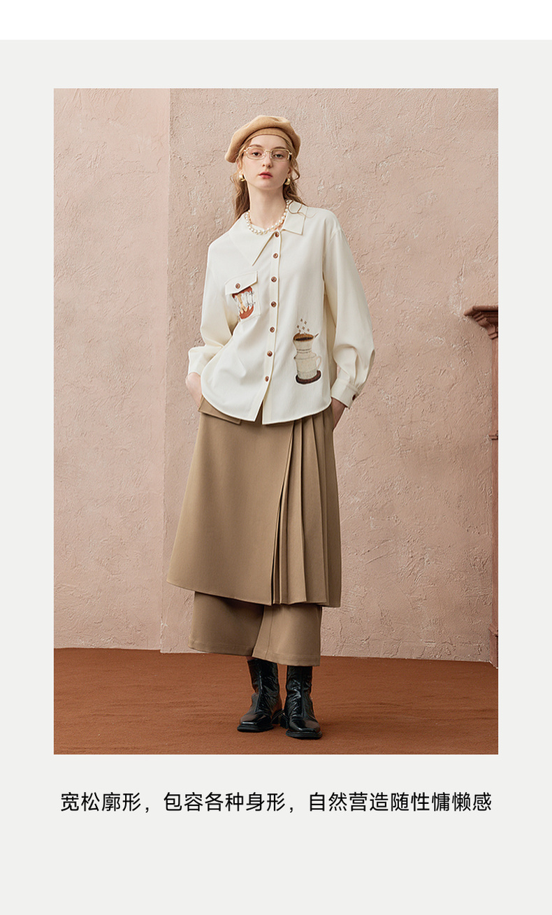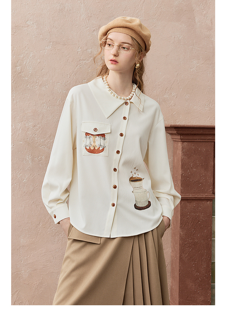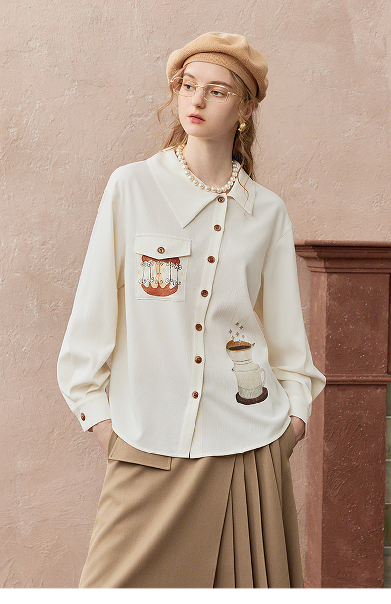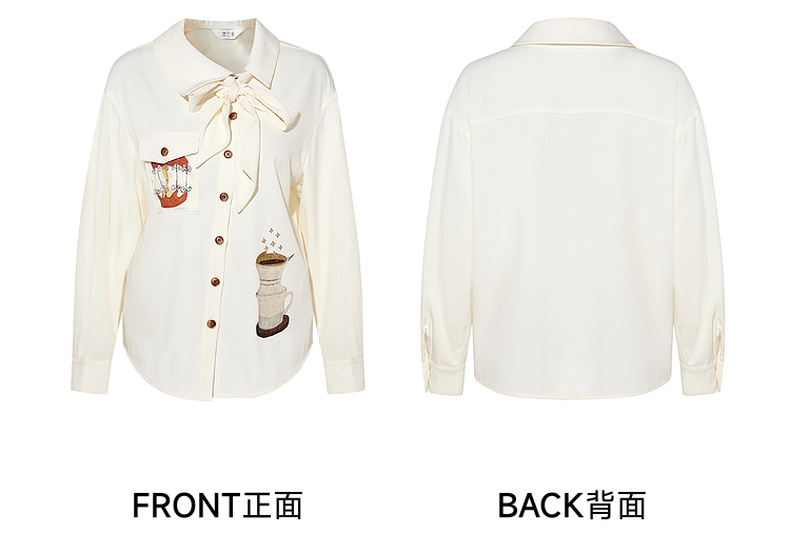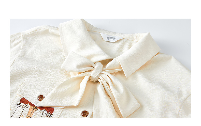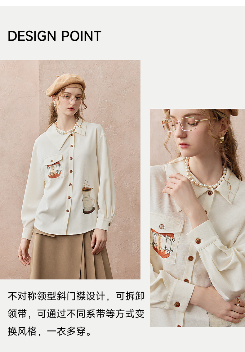 两三事焦香果咖2025秋新款森系风不对称翻领印花刺绣衬衫女配领带