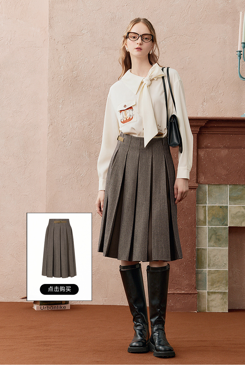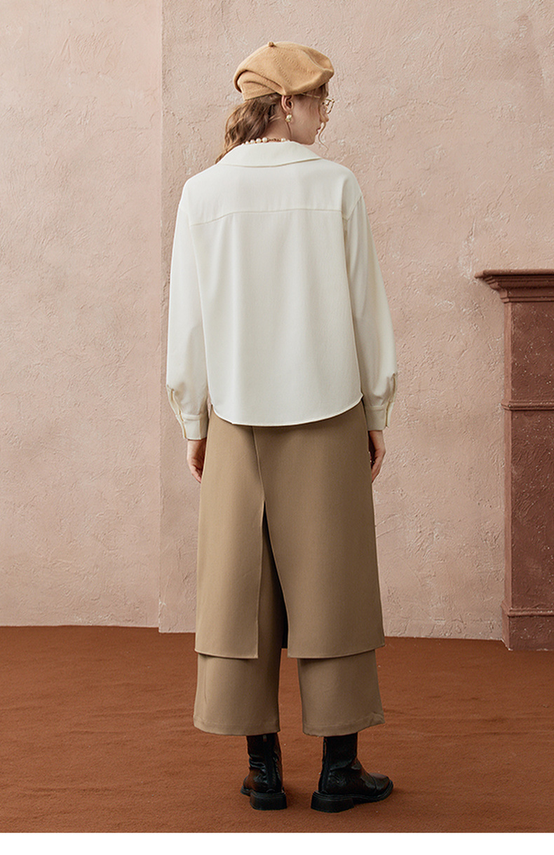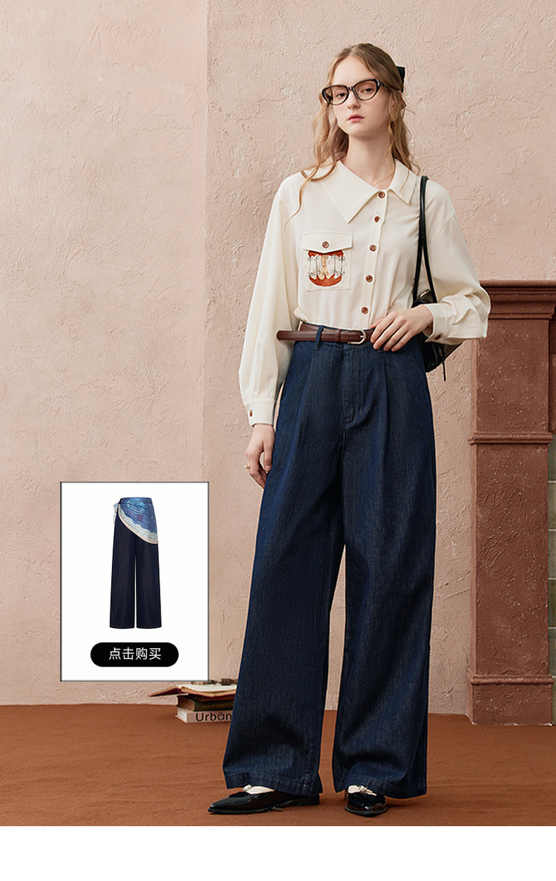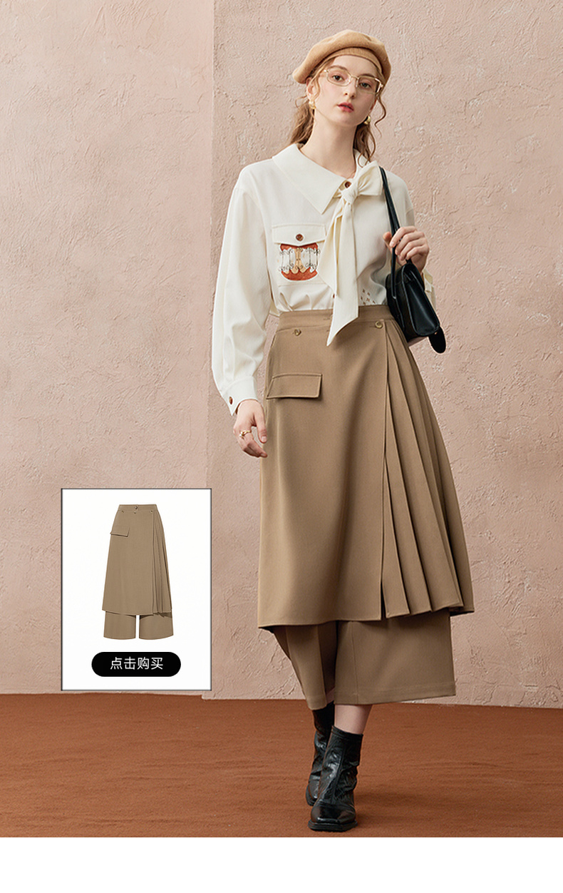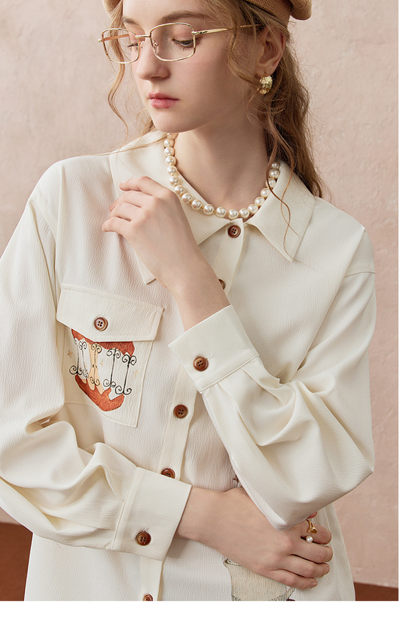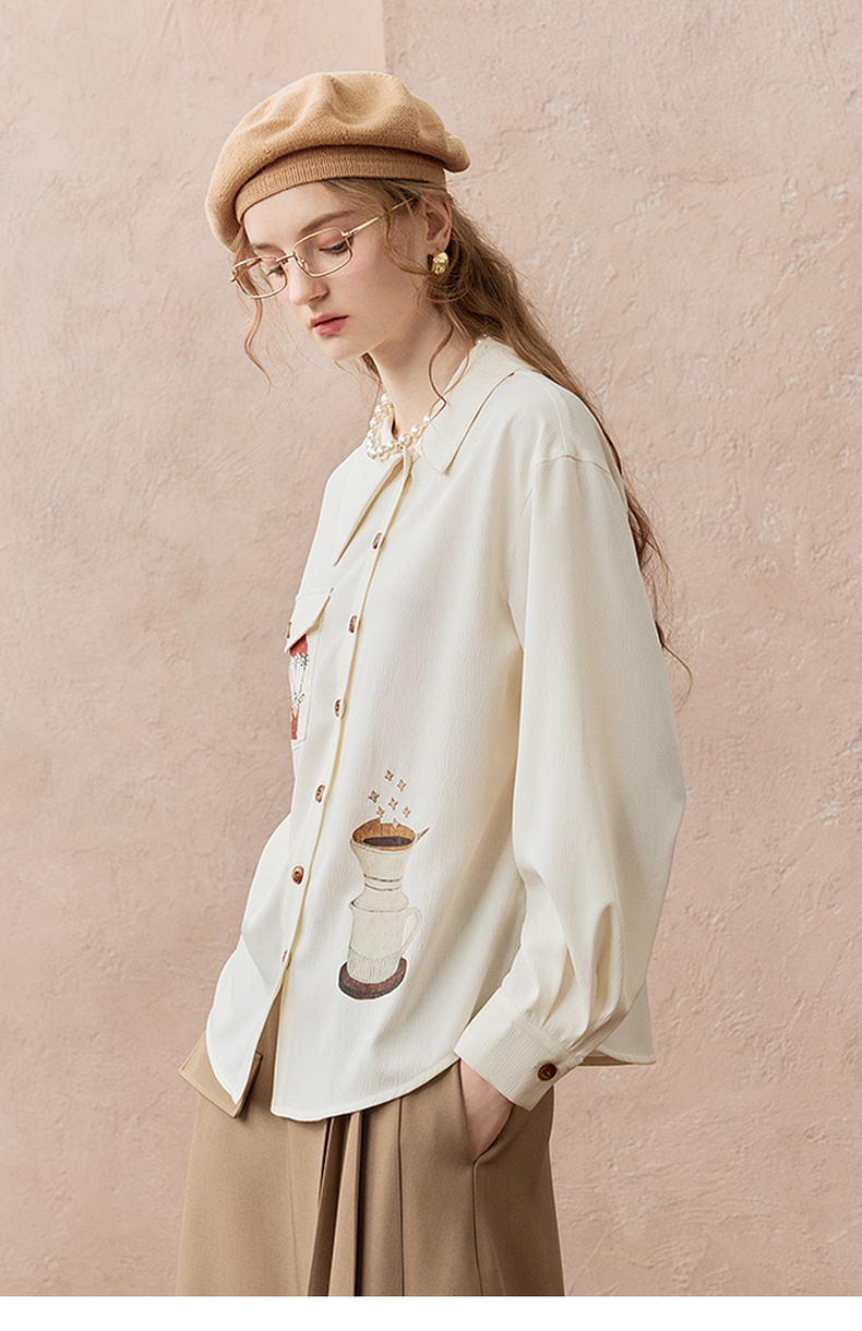 两三事焦香果咖2025秋新款森系风不对称翻领印花刺绣衬衫女配领带