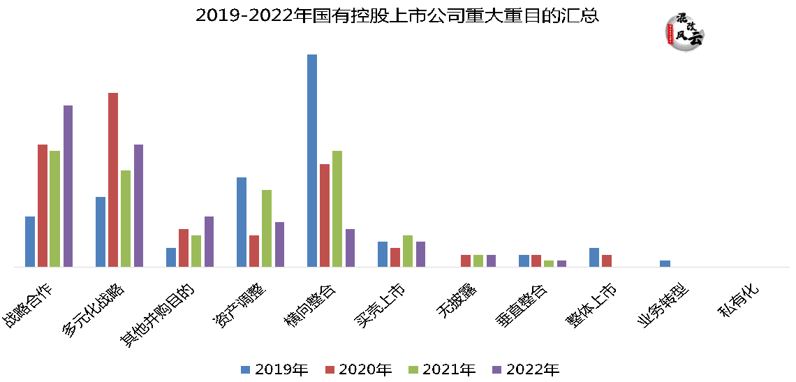 本报告,知本咨询从数据的角度进行了不完全统计,以国有控股上市公司为例,进行整合重组的目的包括战略合作、横向整合、多元化战略、资产调整等。