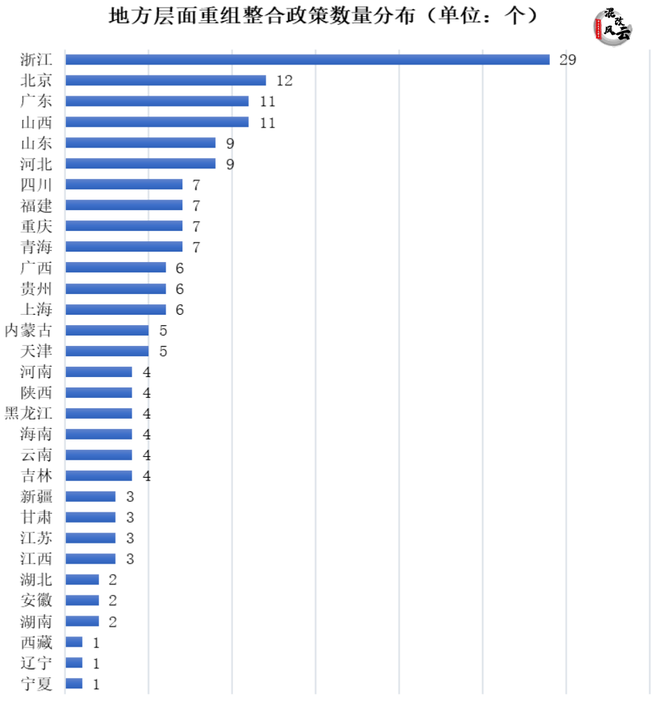 随着中央层面整合重组政策的相继出台,地方层面也积极响应,不过响应程度不同,出台的相关政策数量及种类,具有显著的差异性,尤其以浙江最多。