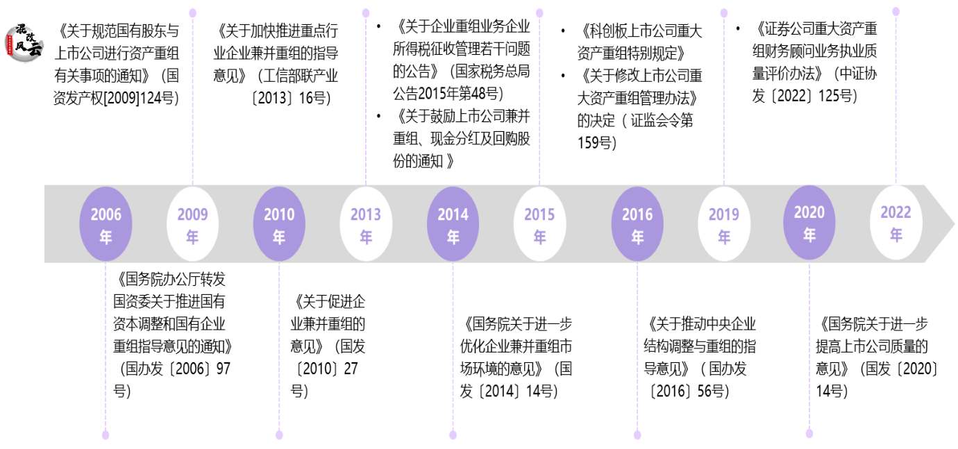 近年来,中央层面颁布的上市公司重大重组政策包括2009年的《关于规范国有股东与上市公司进行资产重组有关事项的通知》,2015年的《关于鼓励上市公司兼并重组、现金分红及回购股份的通知》,到2019年的《科创板上市公司重大资产重组特别规定》和《关于修改上市公司重大资产重组管理办法》,再到2020年《关于进一步提高上市公司质量的意见》。