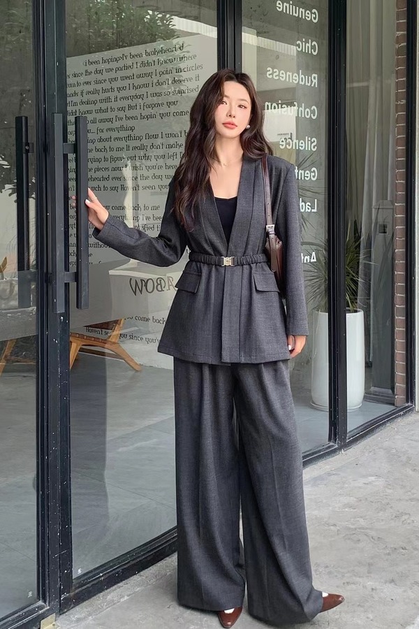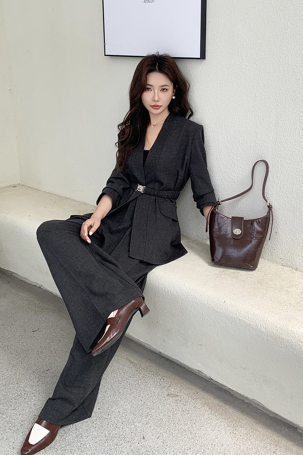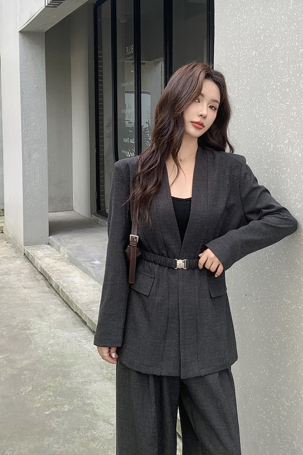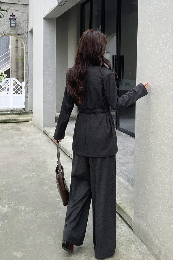 ESTELLICA 通勤气质风无领西装腰带长裤套装 21064