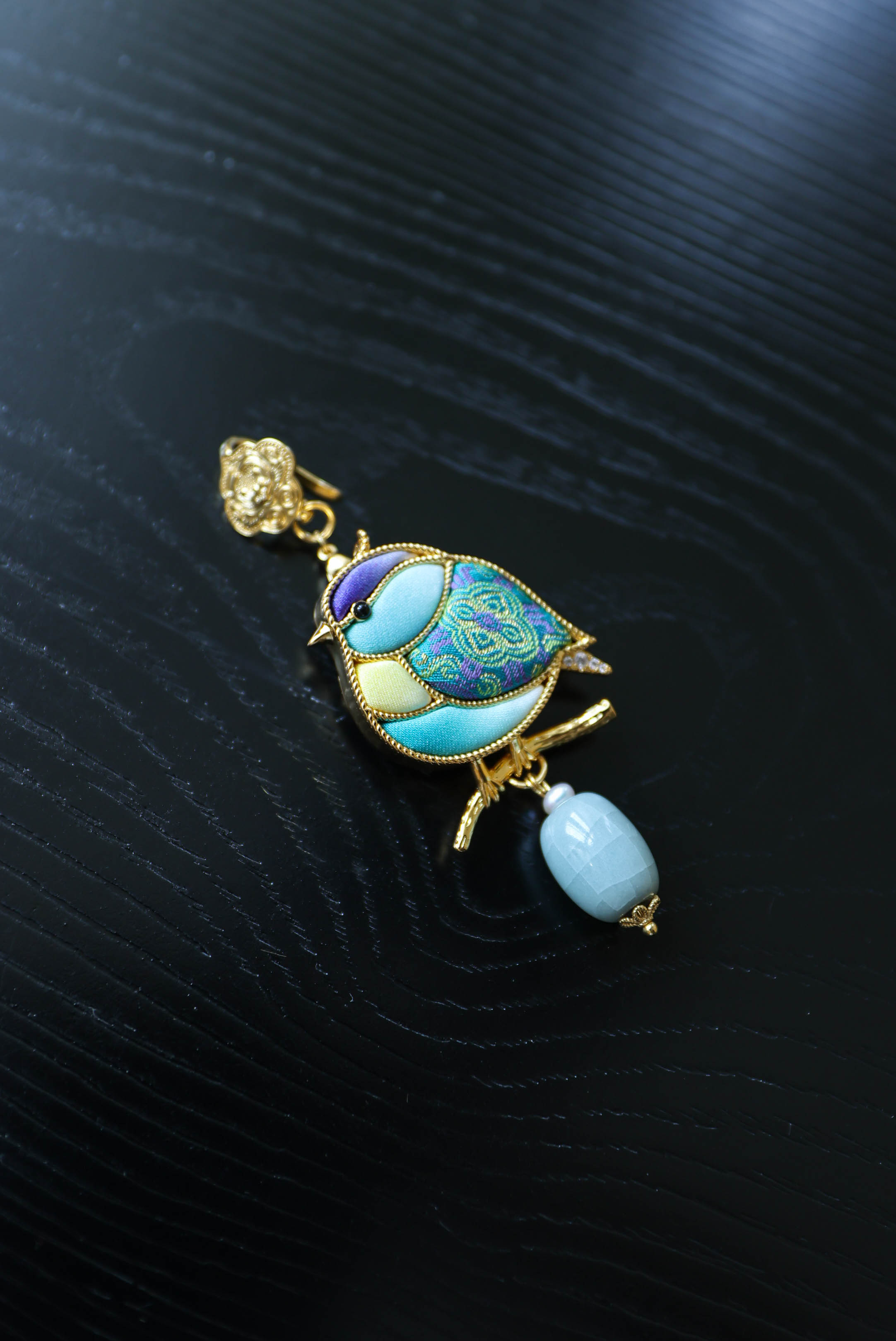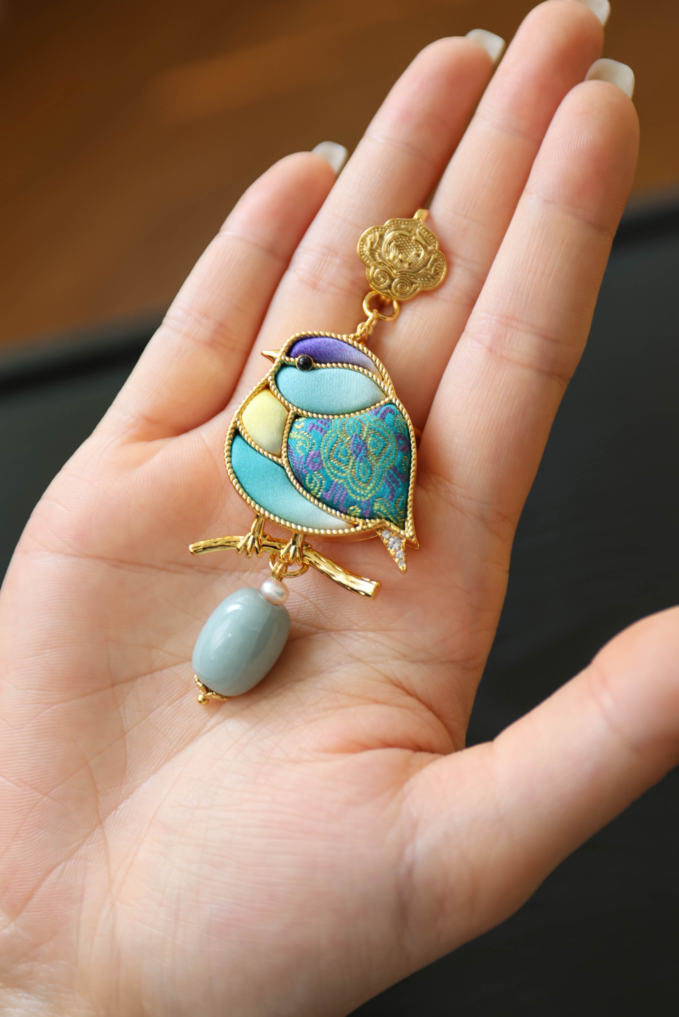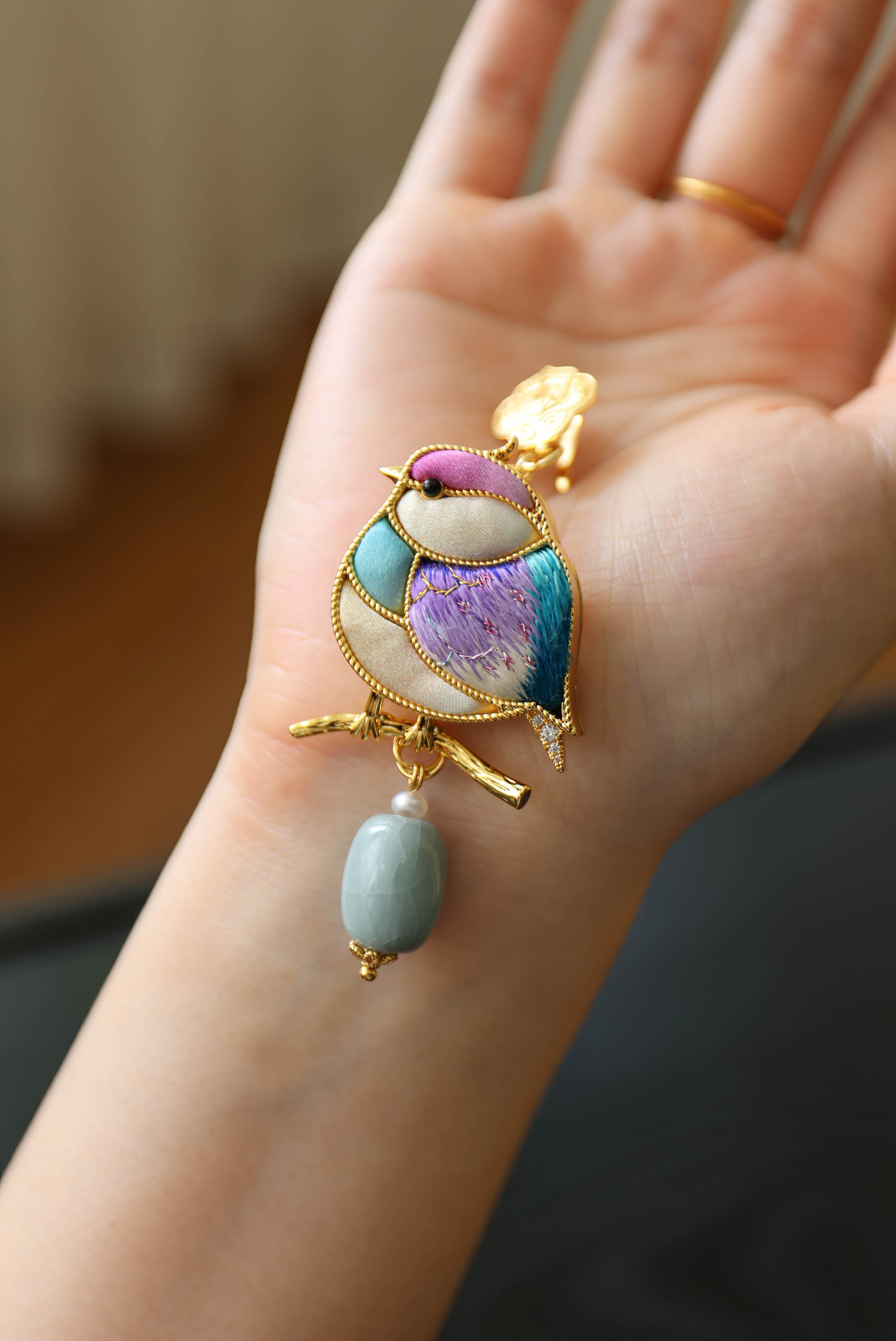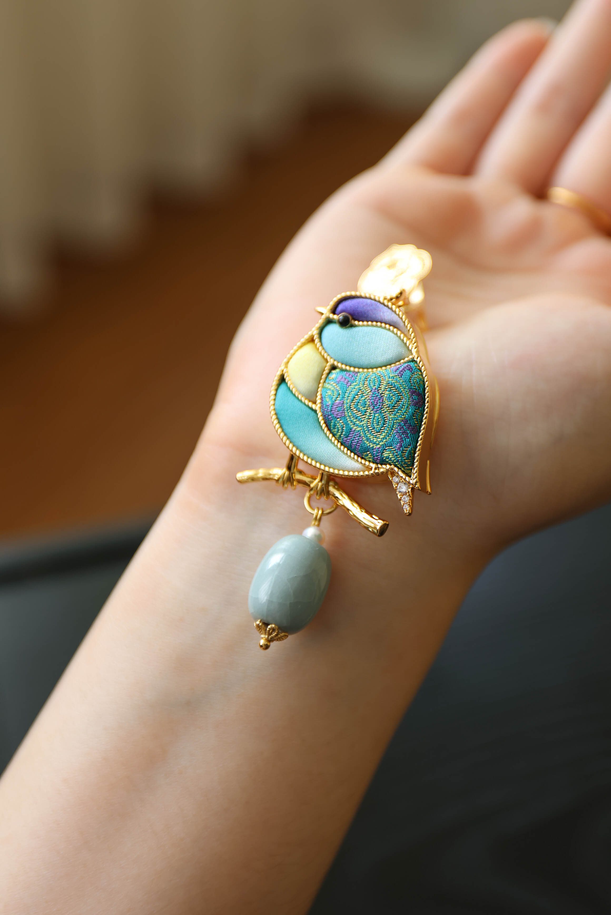 本系列胸针全新演绎非遗盘扣工艺,以精巧丝线缠绕盘制,勾勒出灵鸟振翅、骏马奔腾的生动造型,既延续了传统盘扣的立体与细腻,更注入了现代设计的简约与灵动。我们精选天然矿物釉料,以传统非遗汝窑技艺烧制而成。其釉面莹润,开片细腻,宛然一道“雨过天青云破处”的宁静诗意,与盘扣的繁复精巧形成绝妙对比,成为整体设计的视觉焦点。