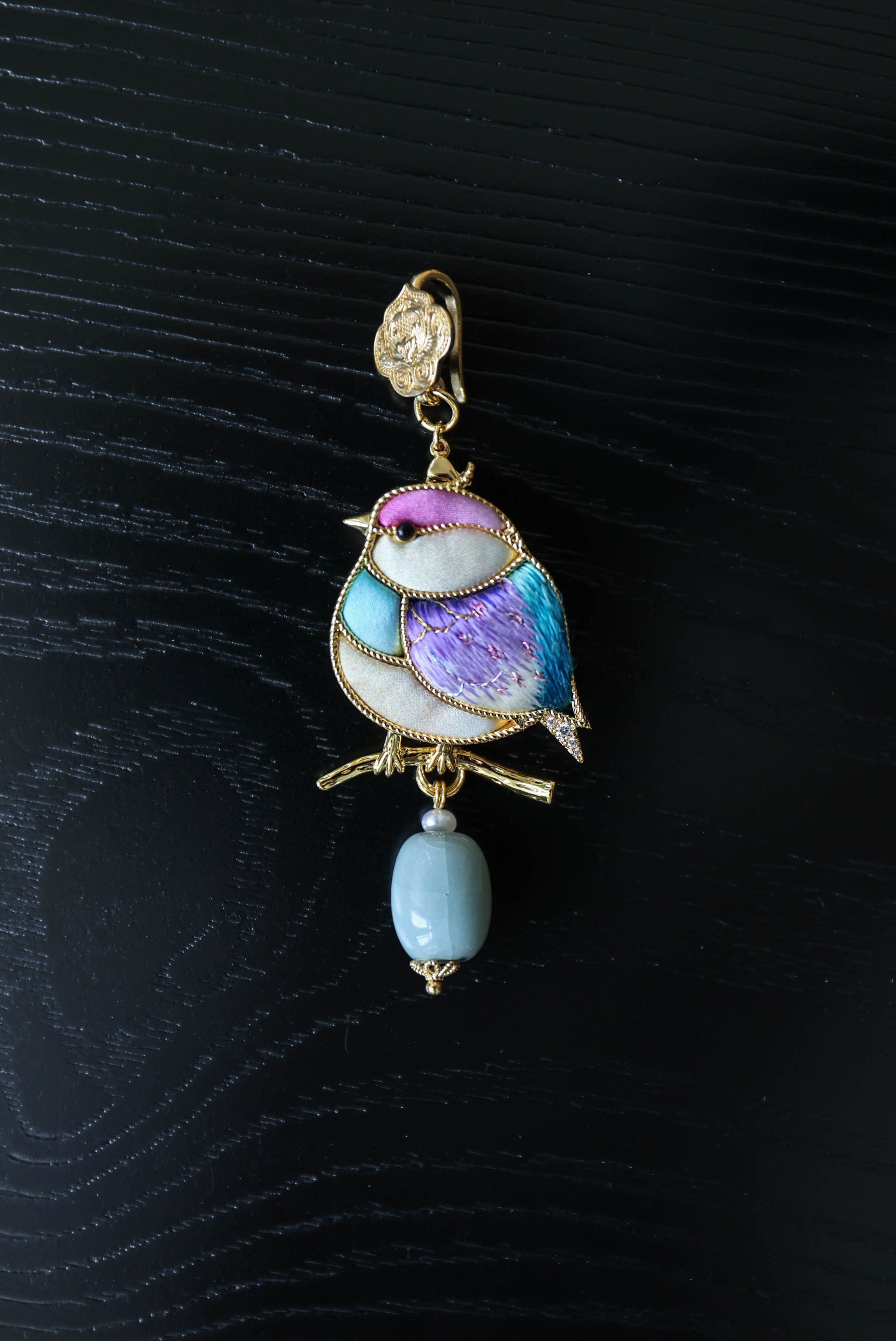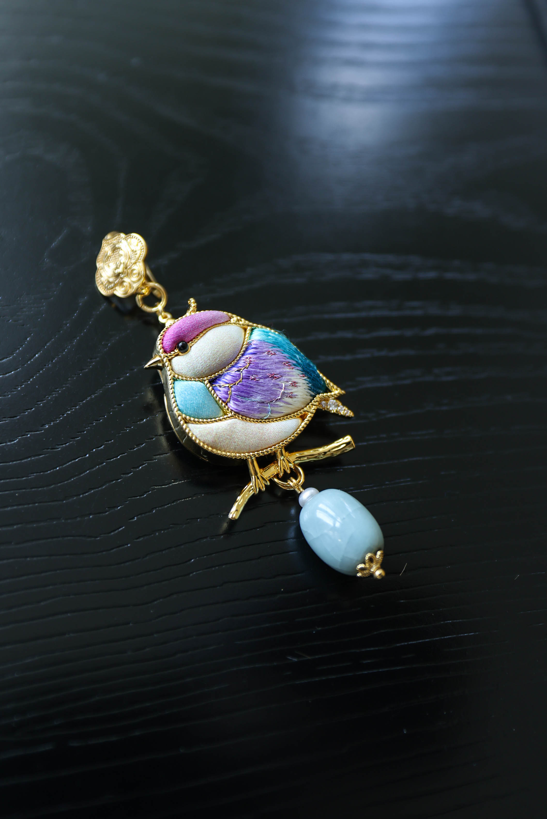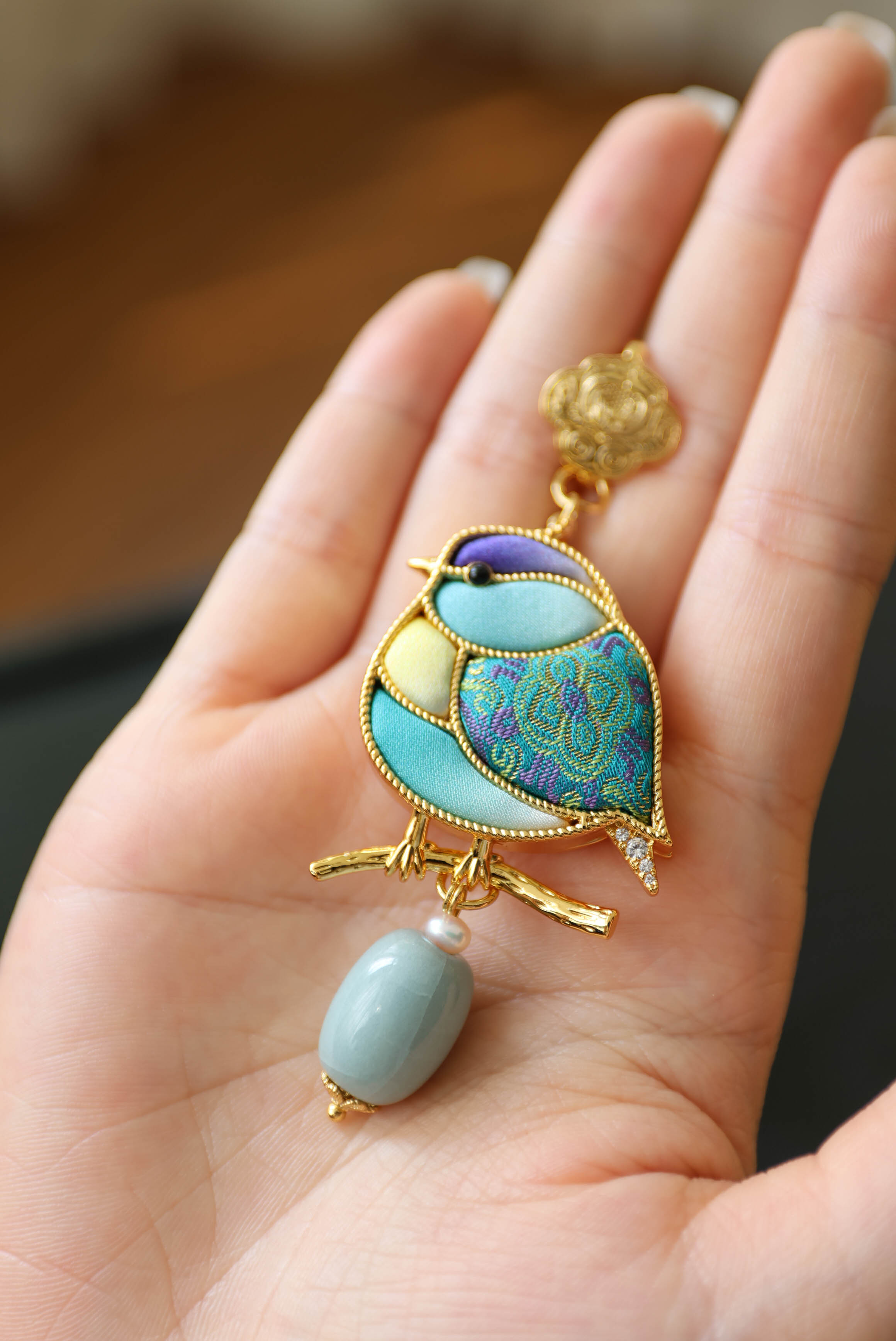 本系列胸针全新演绎非遗盘扣工艺,以精巧丝线缠绕盘制,勾勒出灵鸟振翅、骏马奔腾的生动造型,既延续了传统盘扣的立体与细腻,更注入了现代设计的简约与灵动。我们精选天然矿物釉料,以传统非遗汝窑技艺烧制而成。其釉面莹润,开片细腻,宛然一道“雨过天青云破处”的宁静诗意,与盘扣的繁复精巧形成绝妙对比,成为整体设计的视觉焦点。