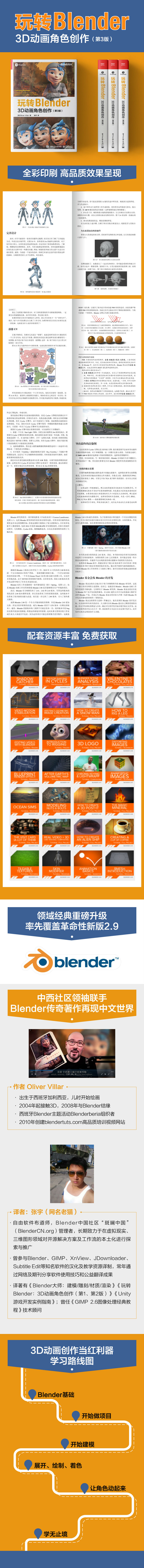 奥利弗·维拉尔(Oliver Villar),1987年出生于西班牙的加利西亚,儿时起便开始绘画。他对艺术的喜爱让他接触到3D领域,从2004年起开始学习3D。他用过多种商业3D软件,直到2008年接触到Blender,从那以后,他作为一名自由3D设计师,专门从事Blender的教学工作。在2010年,他创建了blendertuts.com网站,致力于将高品质的Blender培训视频分享到社区。若干年后,他决定投身于西班牙本土的社区,那里缺少Blender的学习资料,并创建了blendtuts.es网站。多年来,他是西班牙Blender主题活动“Blenderberia”的组织者之一。目前,他向在线网校及西班牙穆尔西亚大学的学生、教授们传授如何使用Blender。