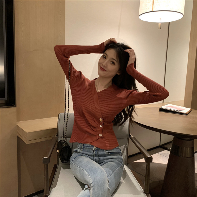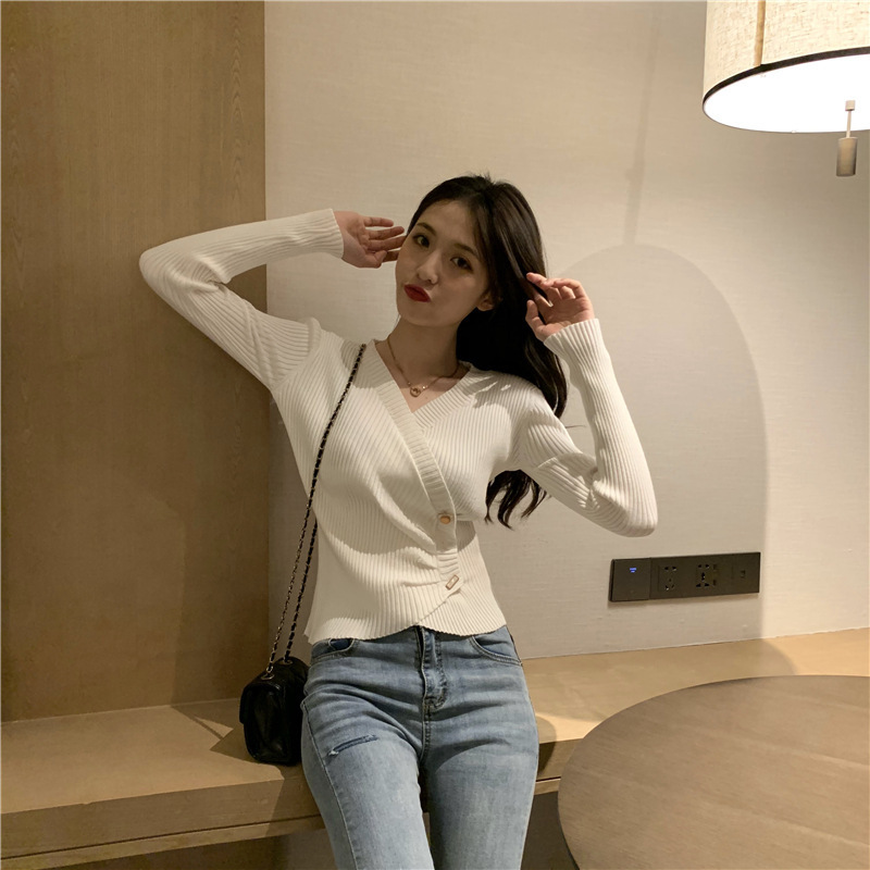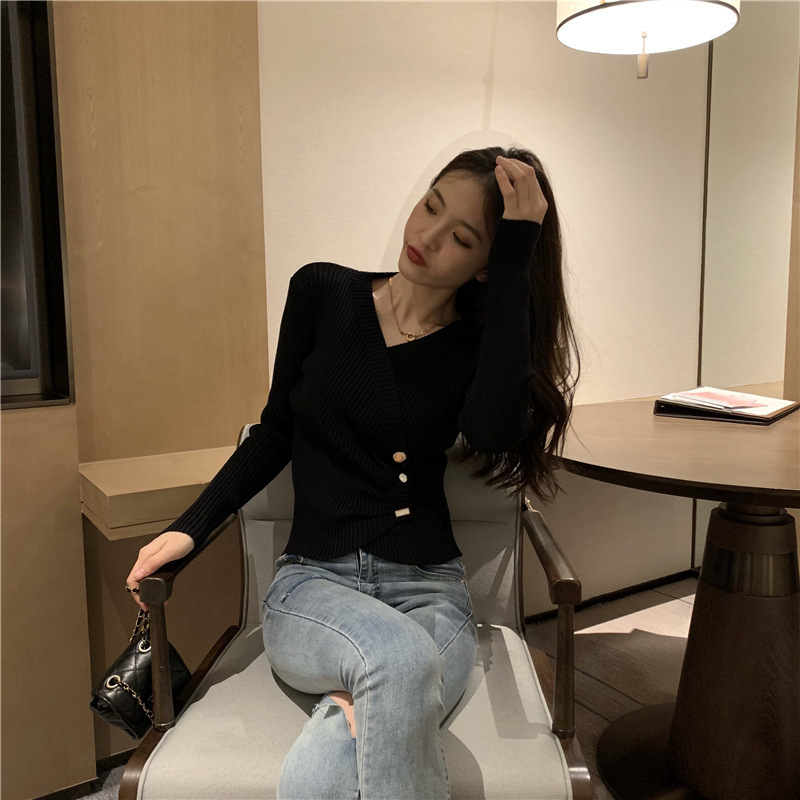 2025春季新款法式复古不规则修身显瘦V领打底气质长袖针织衫女装