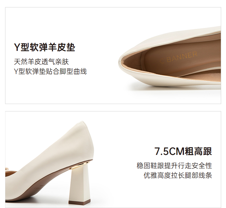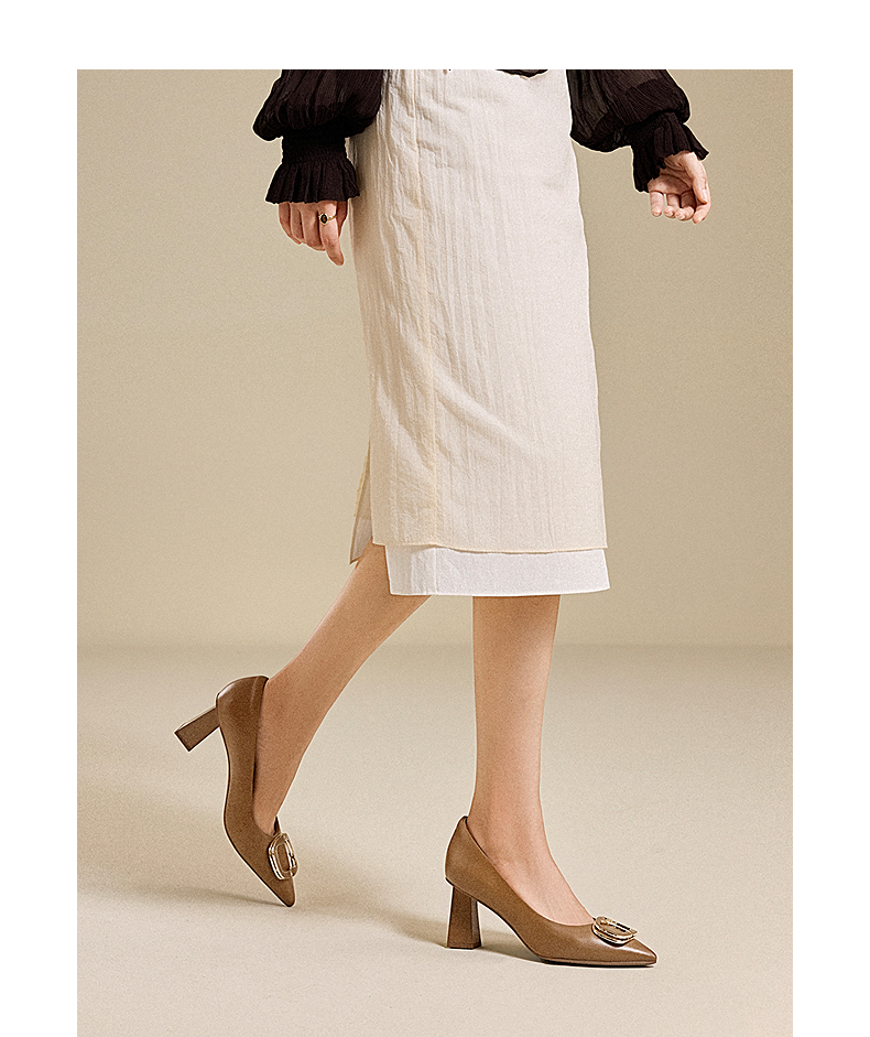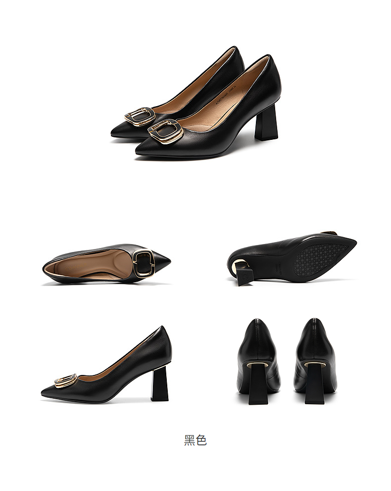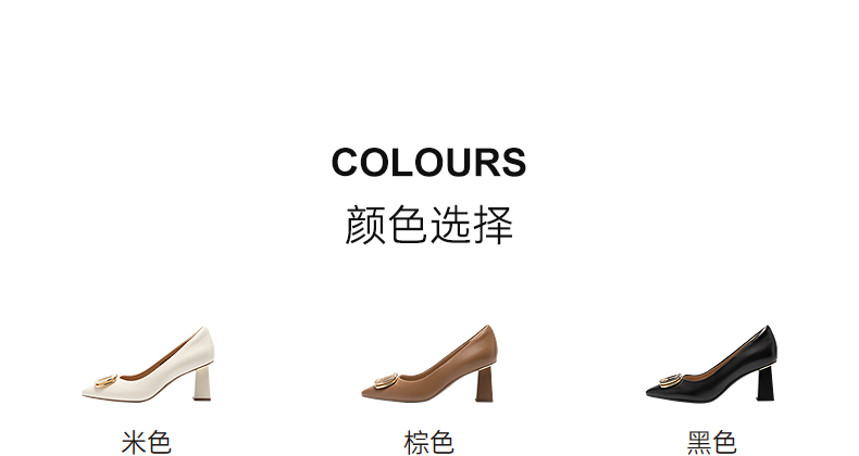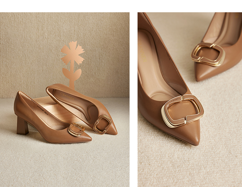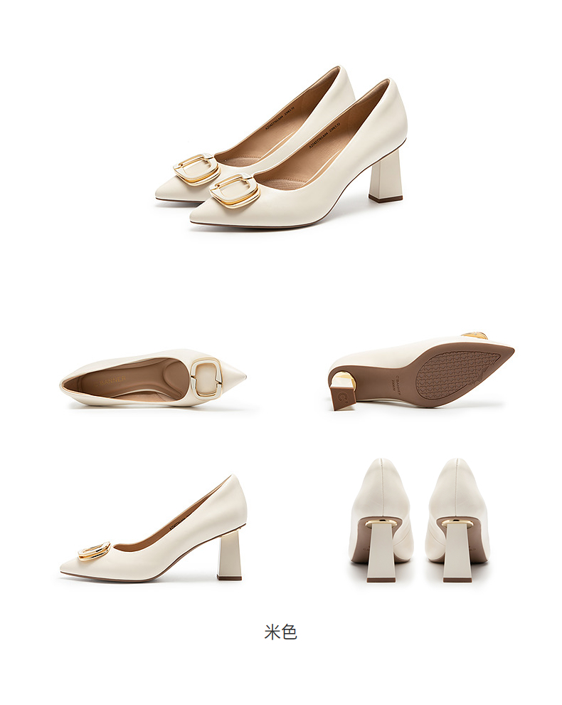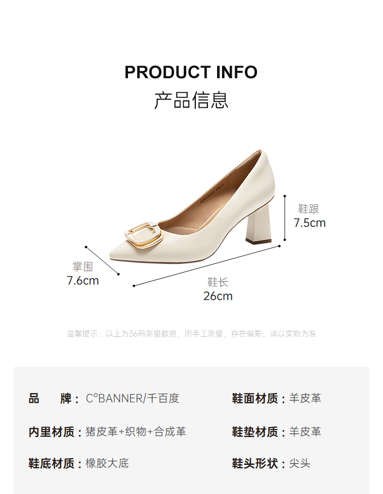 千百度羊皮裸色超高跟鞋女粗跟通勤法式尖头浅口单鞋A25457761