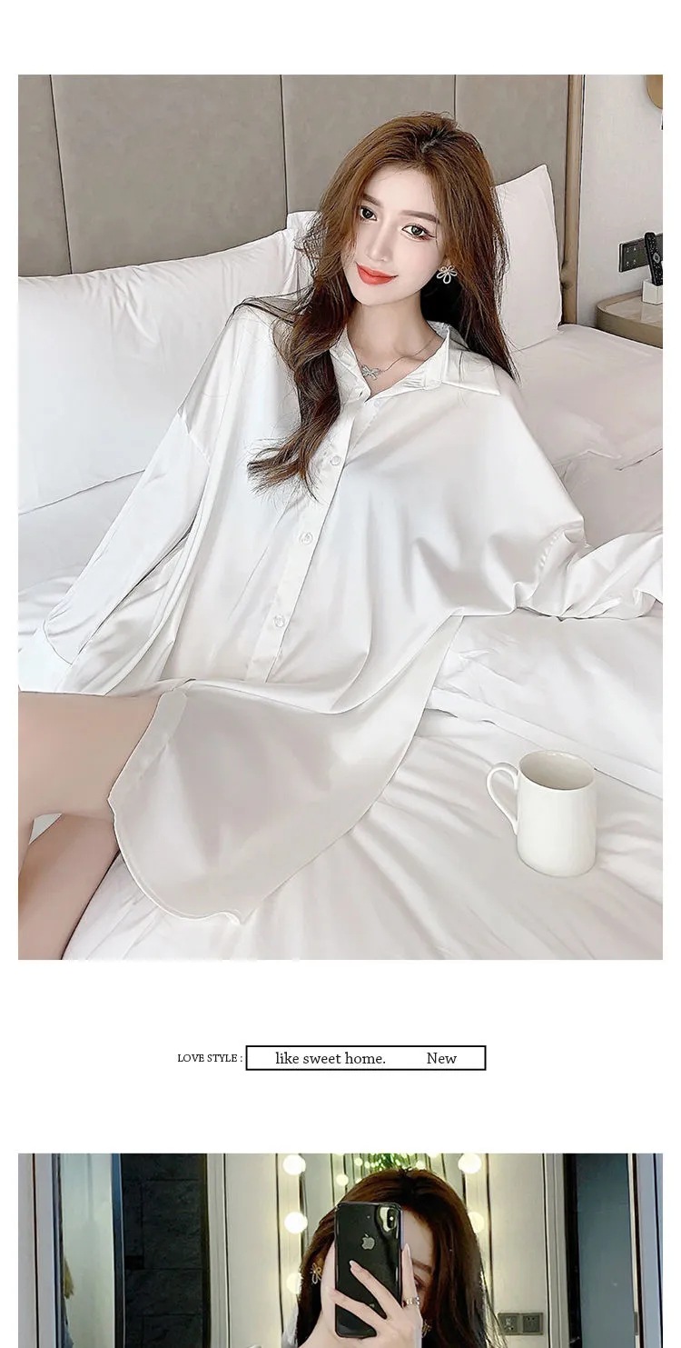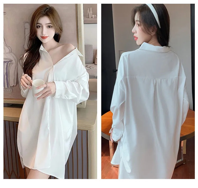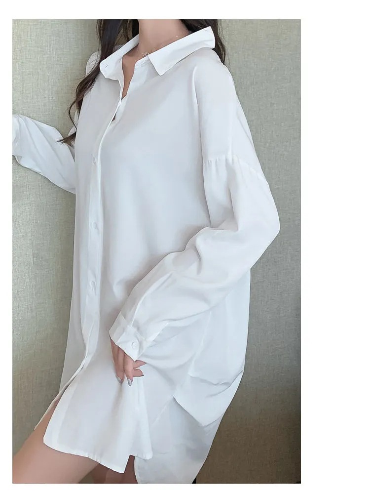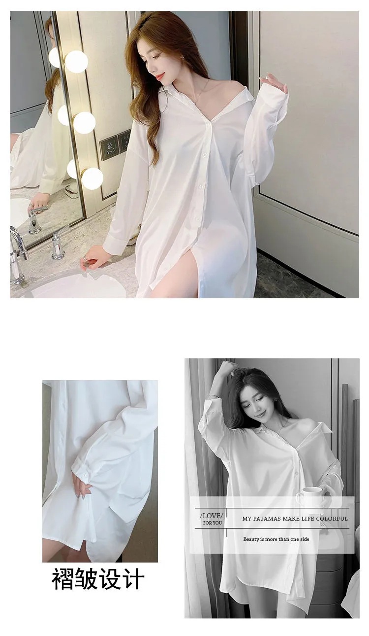 白衬衫女中长款睡衣女韩版可外穿雪纺纯欲风男友风夏季性感睡裙女