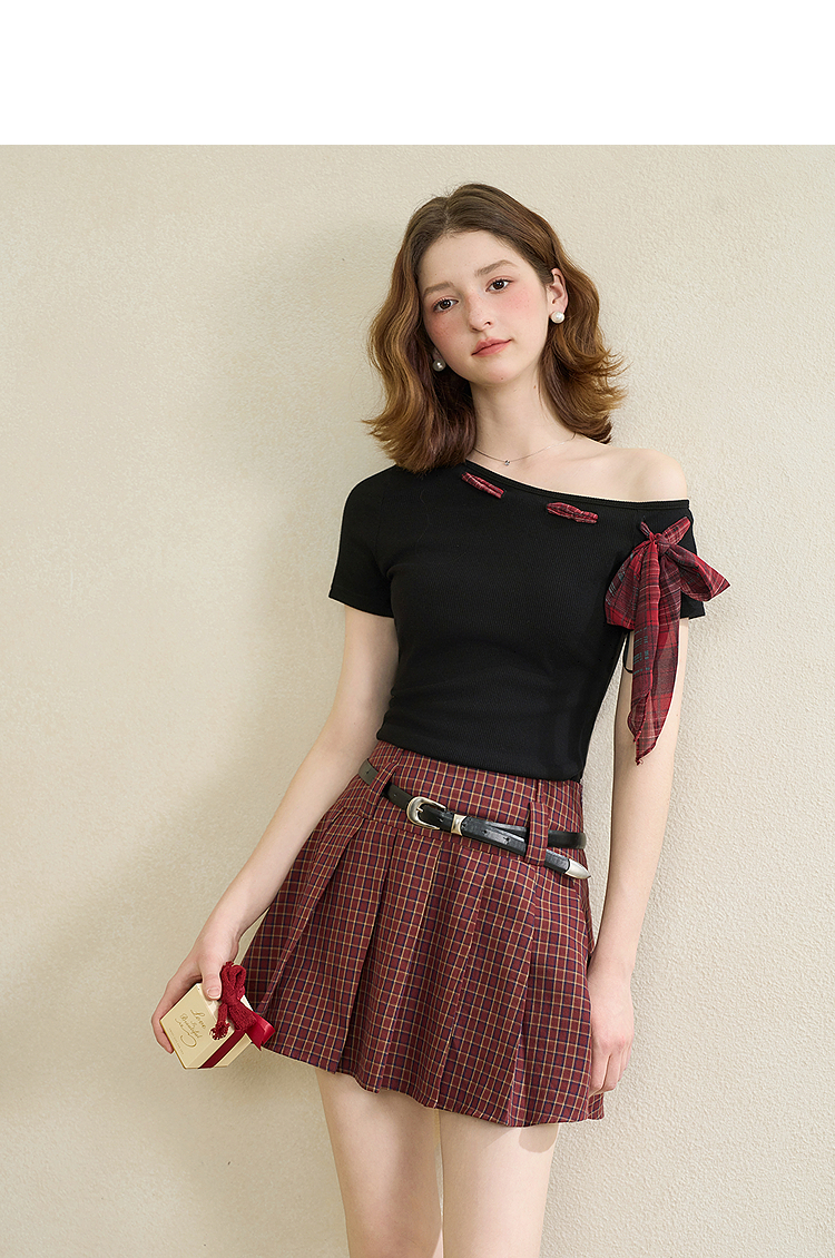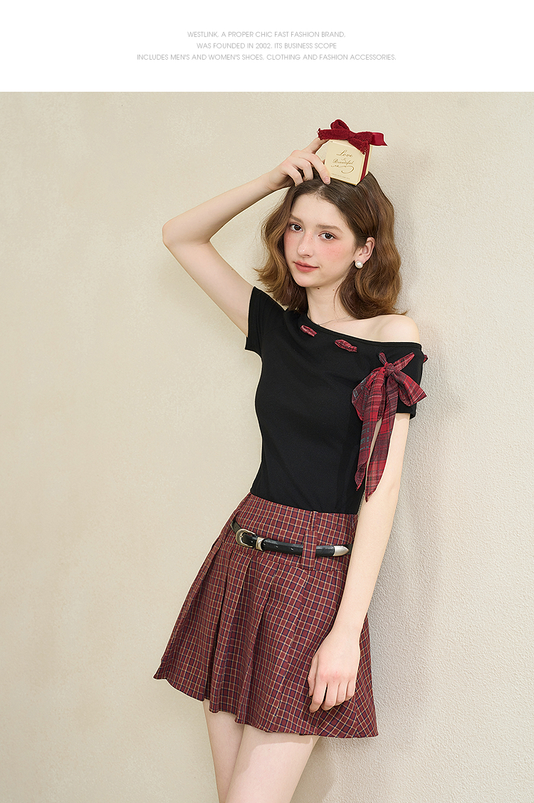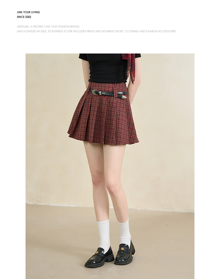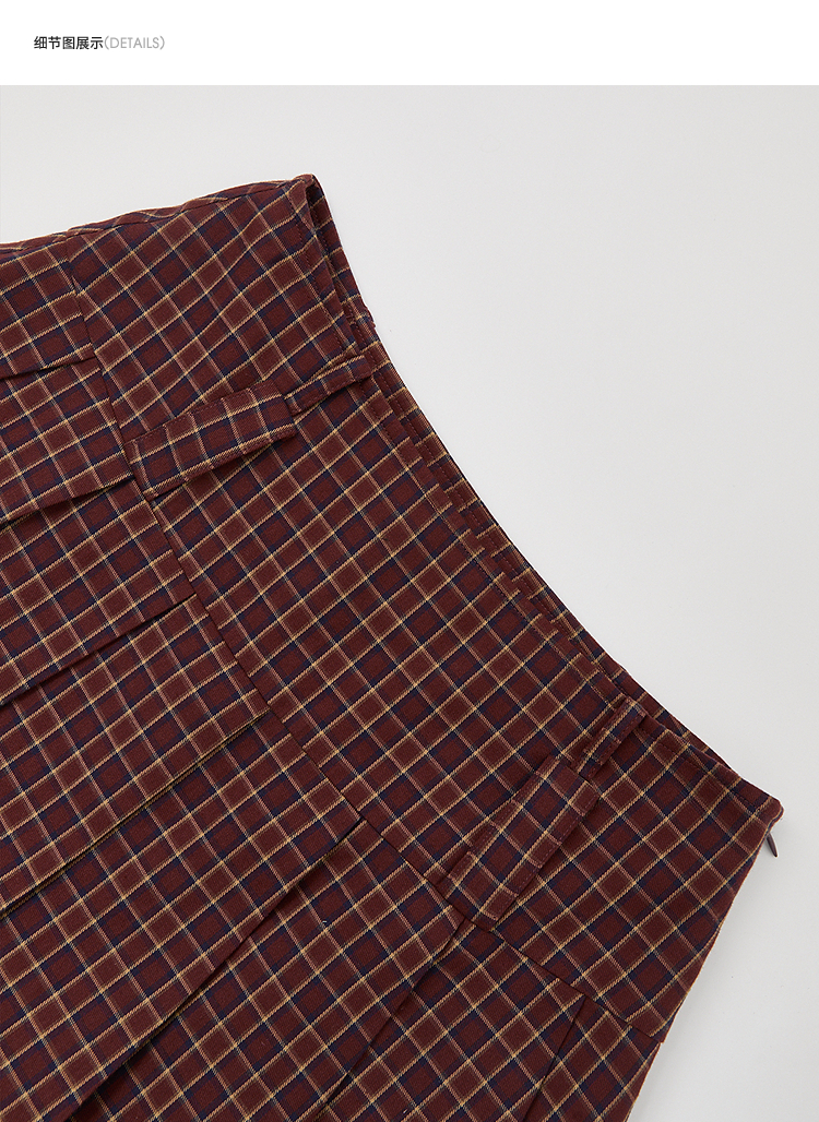 【纯棉】学院风复古红色格纹半身裙女夏季A字百褶裙V0950634