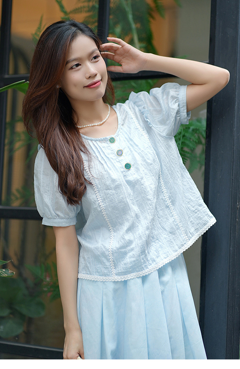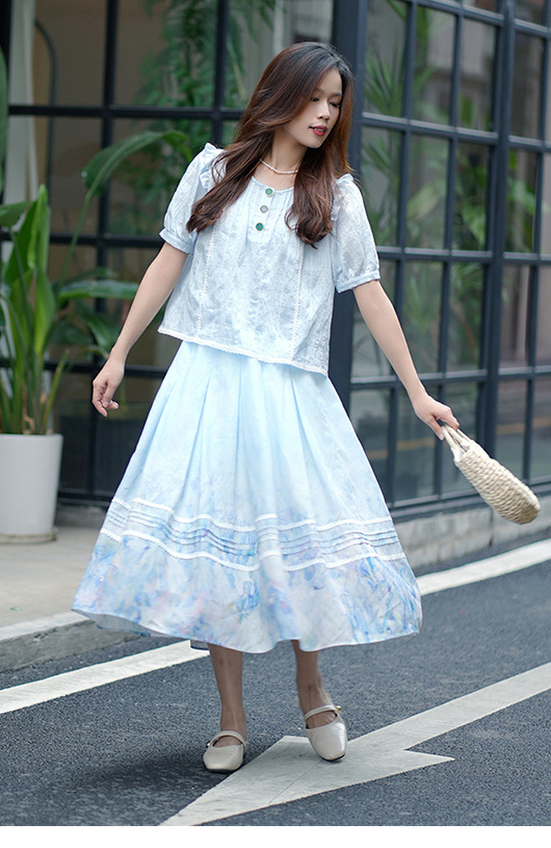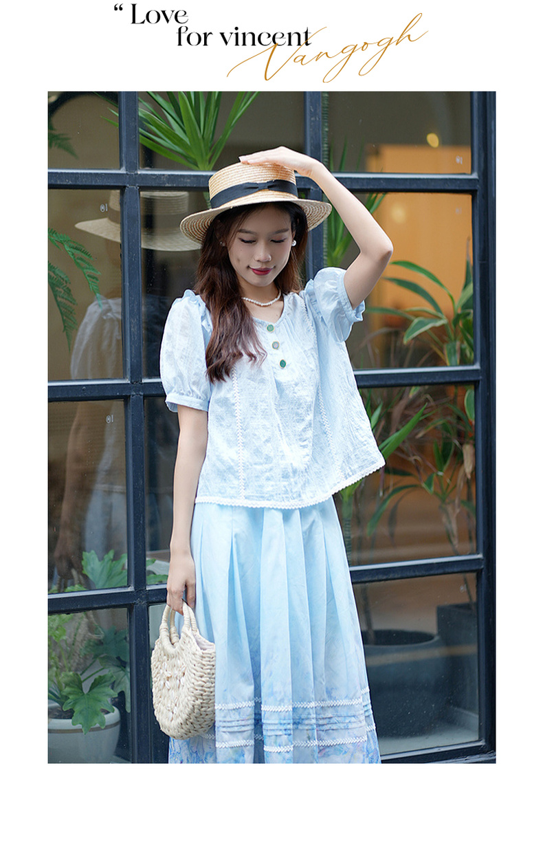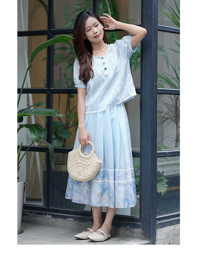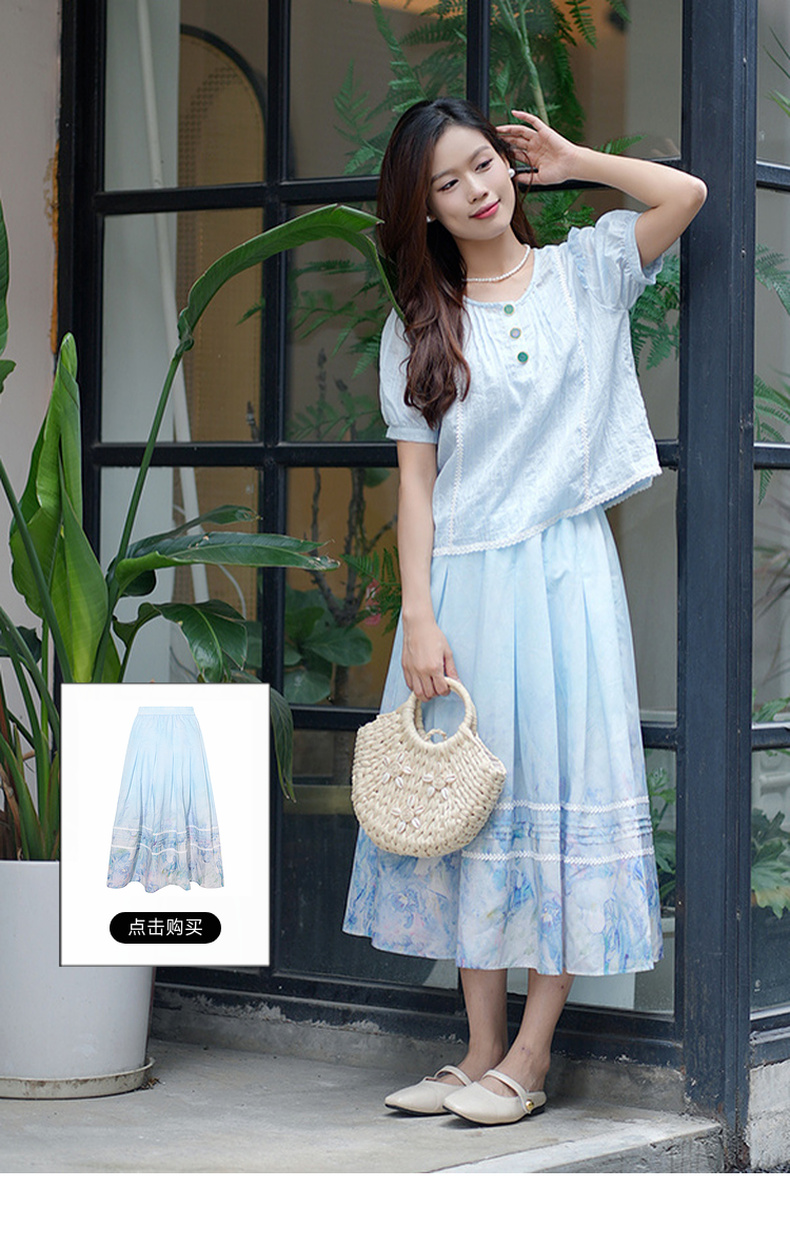 水色倾淌新款织带拼接荷叶边两件套衬衫女