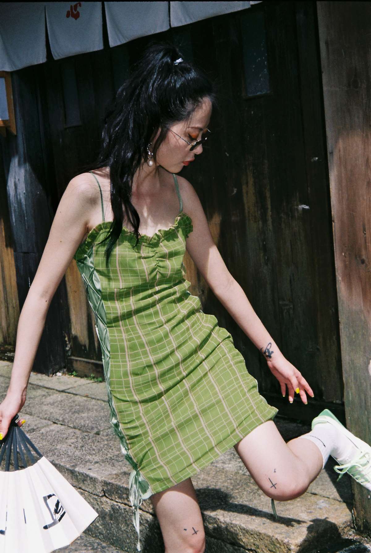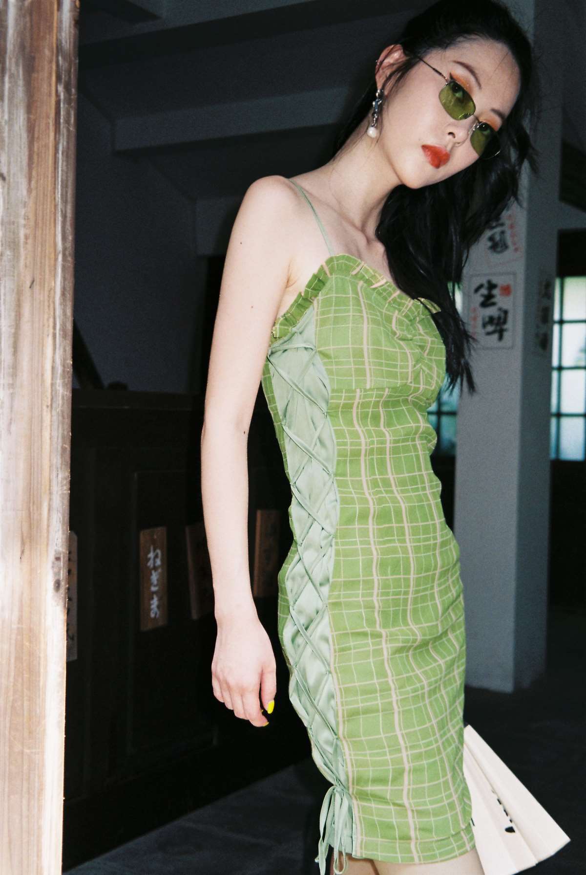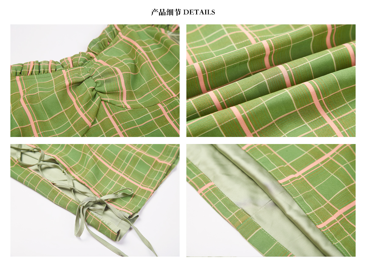 EhK 2021春夏复古牛油果绿格子绑带短裙子可调节吊带连衣裙女
