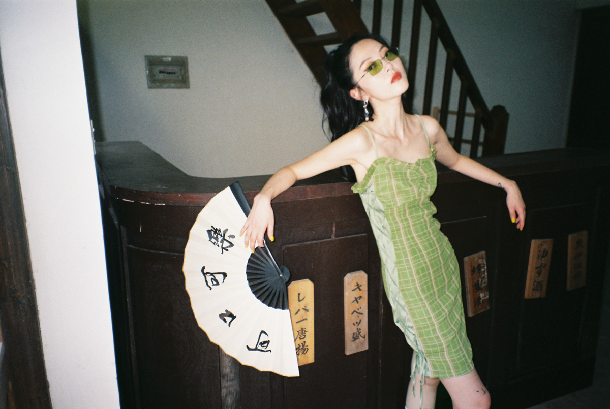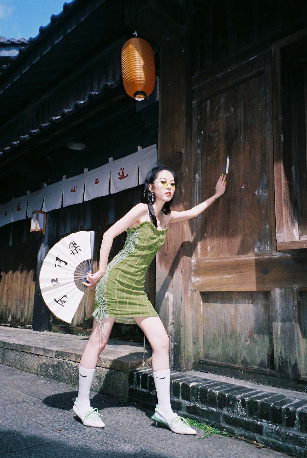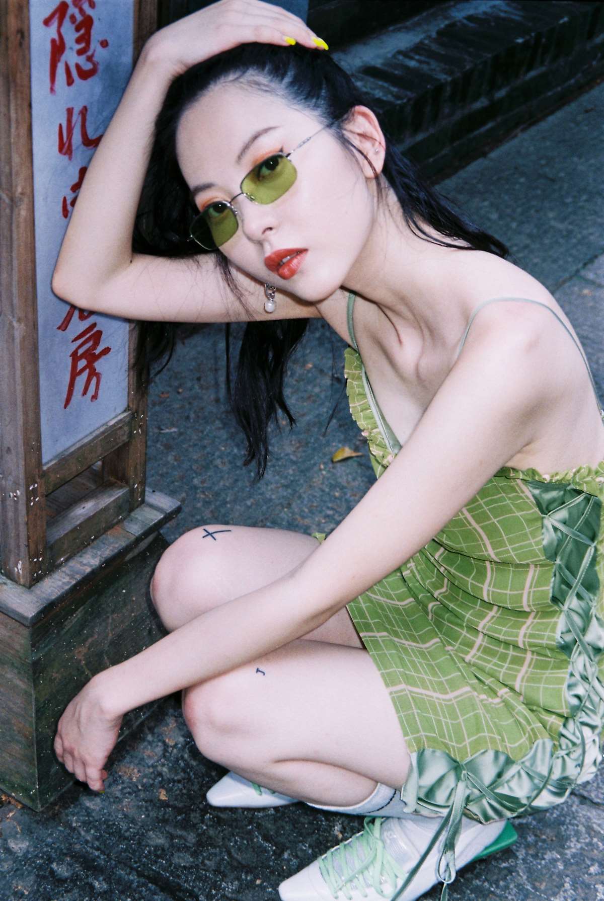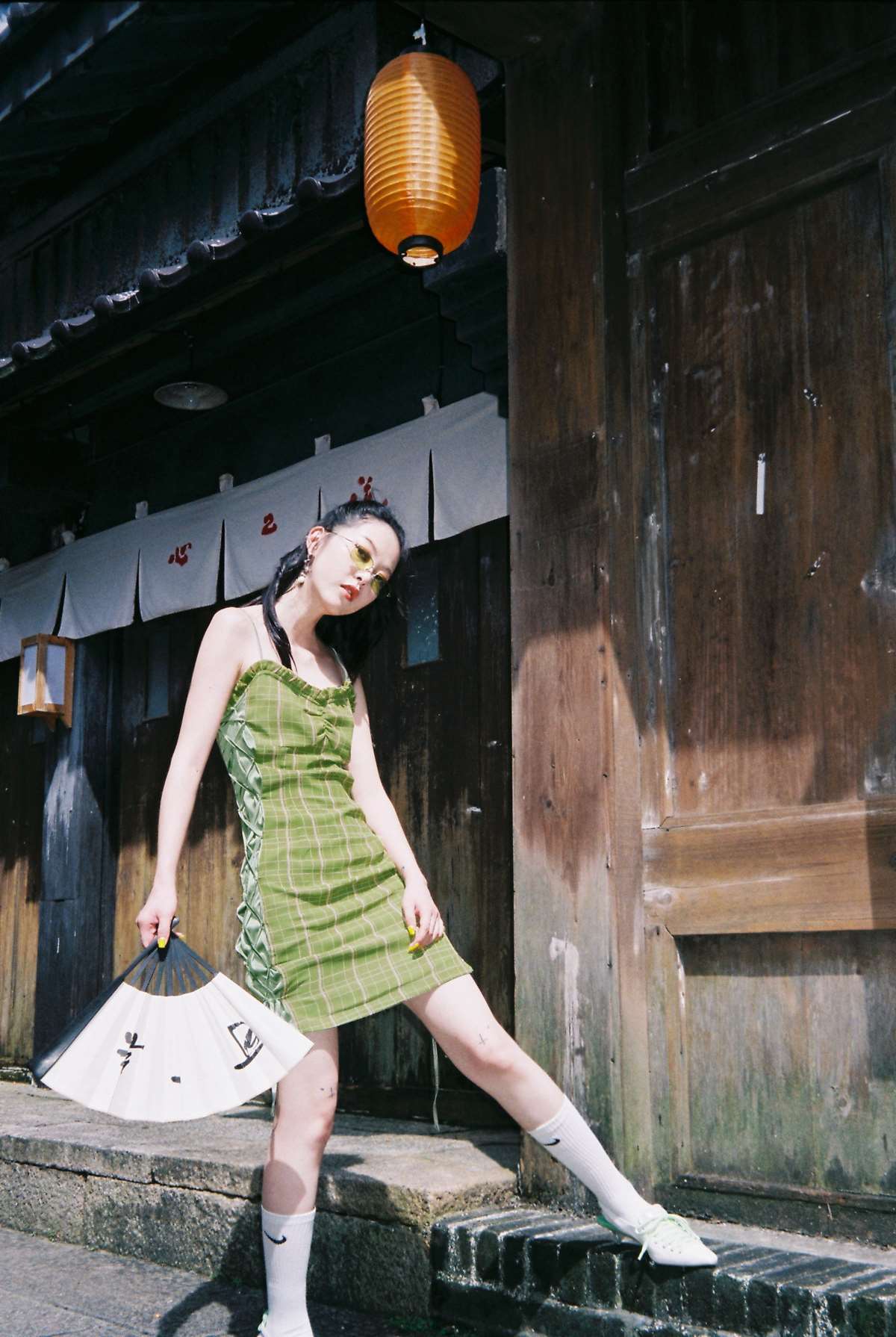 EhK 2021春夏复古牛油果绿格子绑带短裙子可调节吊带连衣裙女