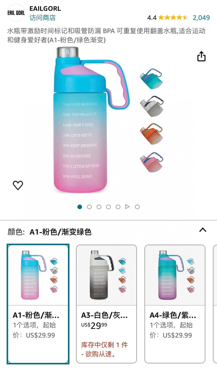 💰39.9元包邮 EAIL GORL高能运动水杯正品出美国亚马逊订单~【1815ml】